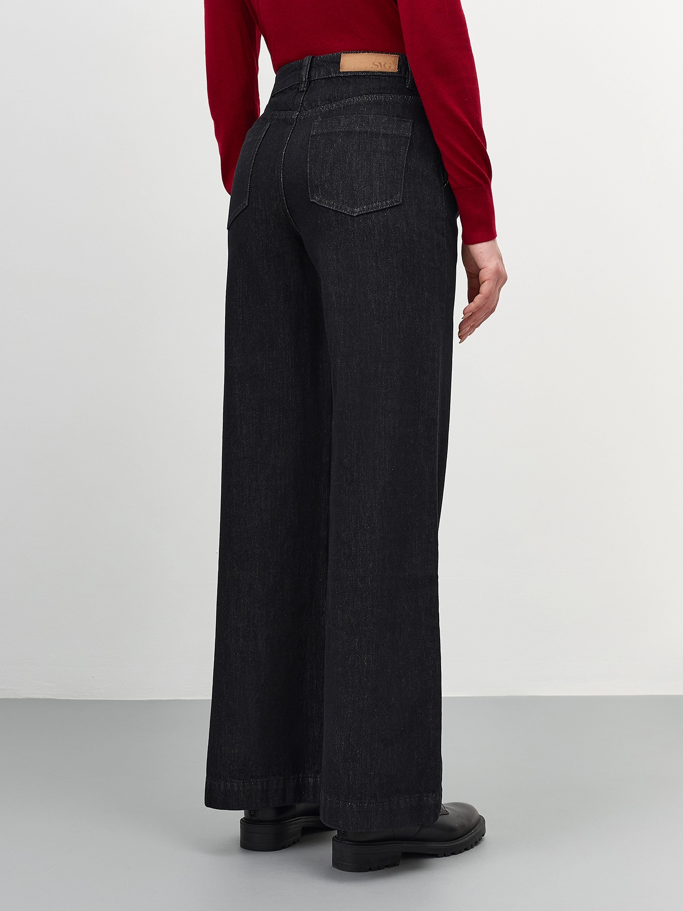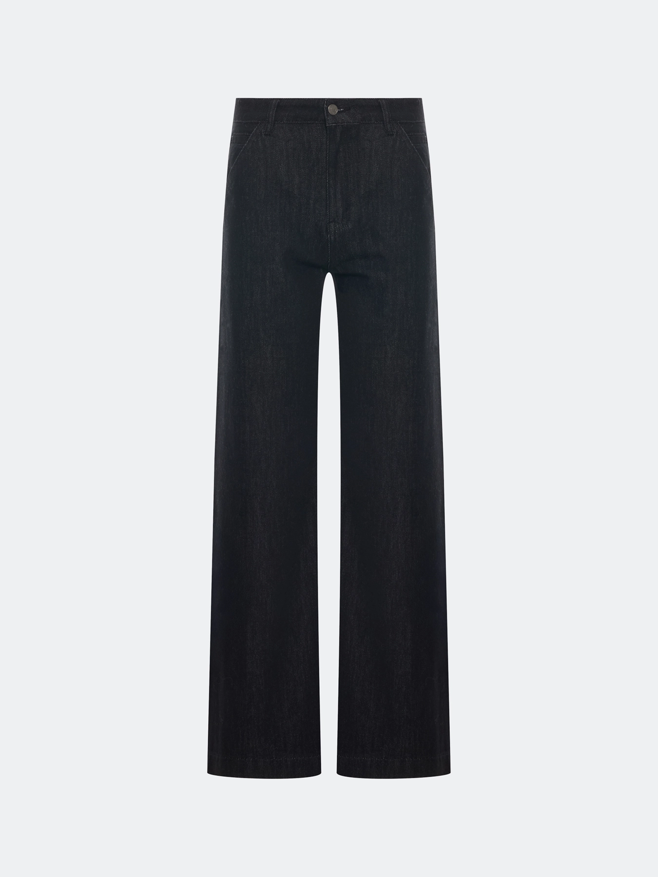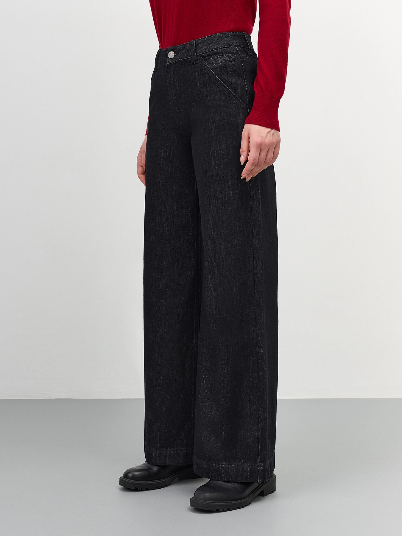 Широкие черные джинсы с деликатной варкой и имитацией потайных карманов. Прямой силуэт. Застежка на молнию и металлическую пуговицуу. Четыре кармана. В составе хлопок.