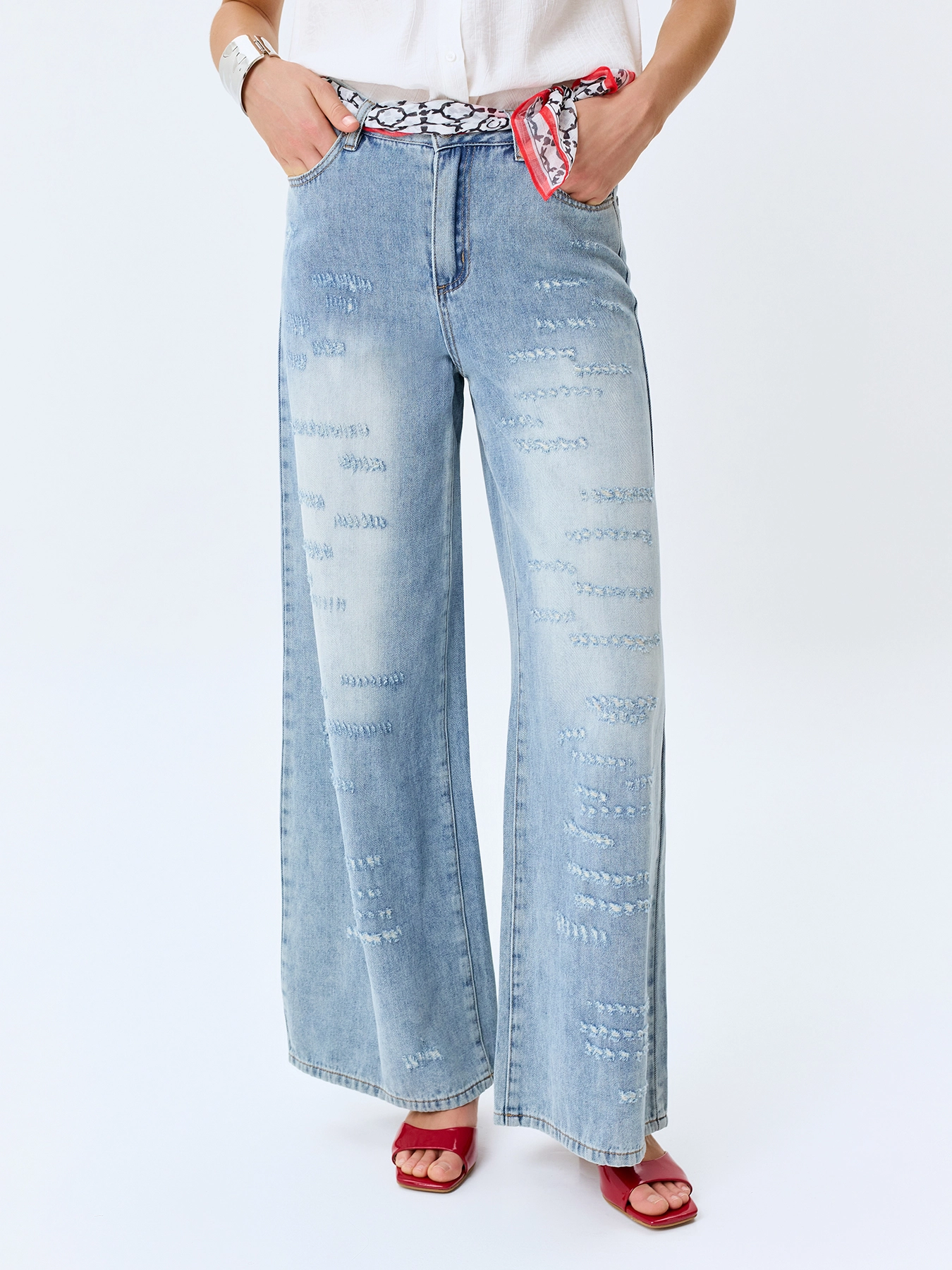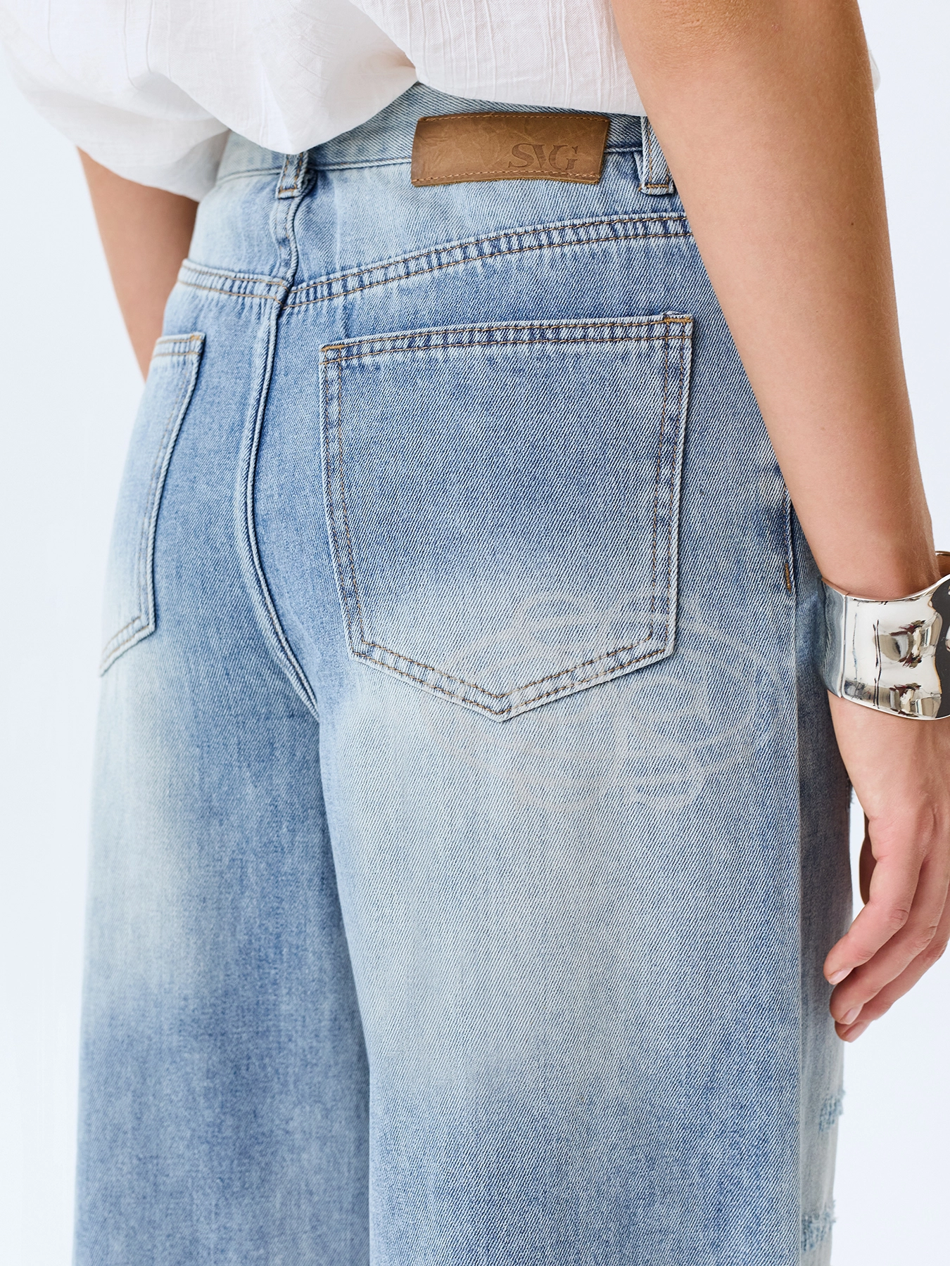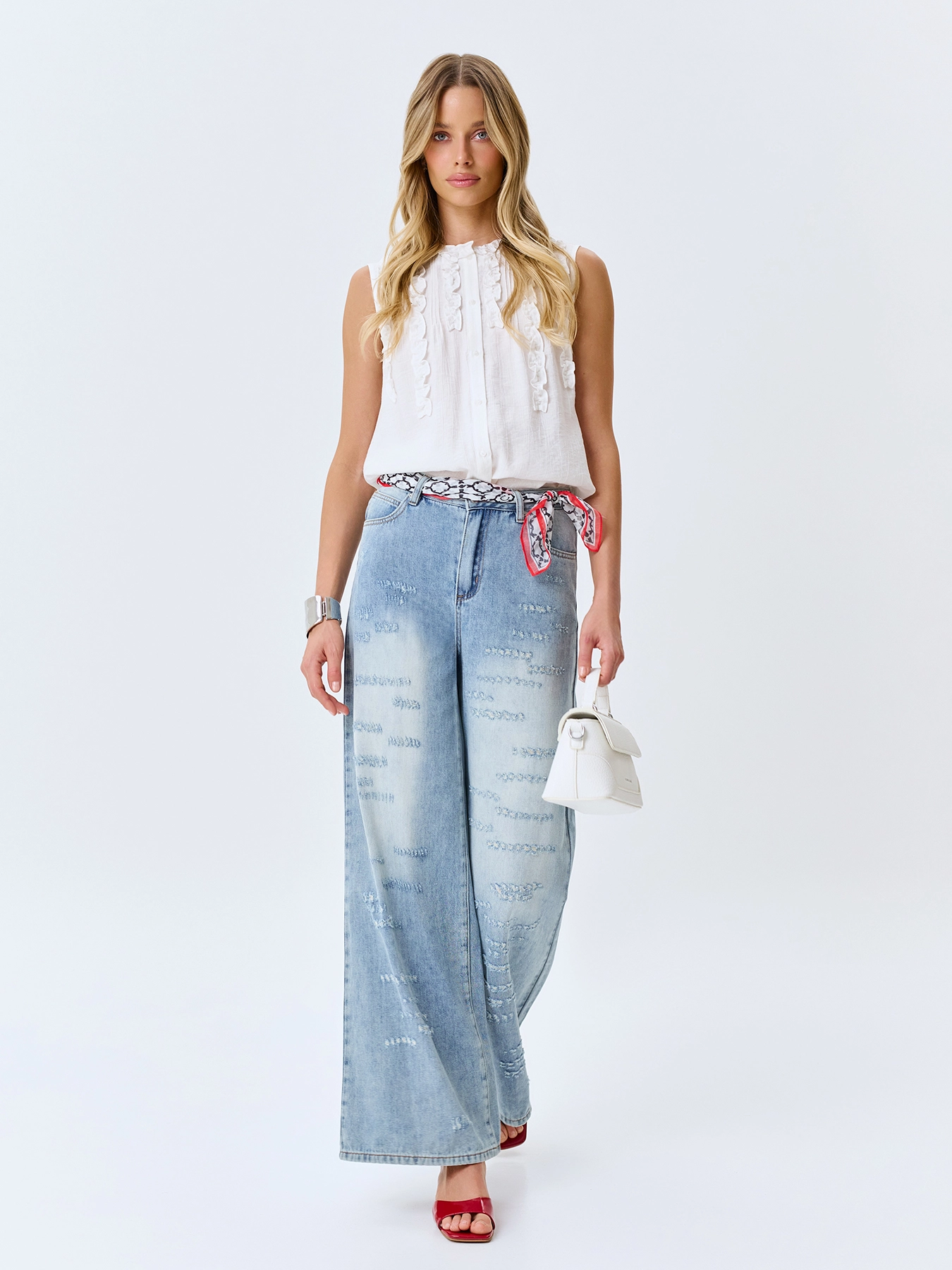 Широкие джинсы с акцентными дестроями и контрастной варкой. Свободный силуэт. Застежка на молнию и металлическую пуговицу. Пять карманов.