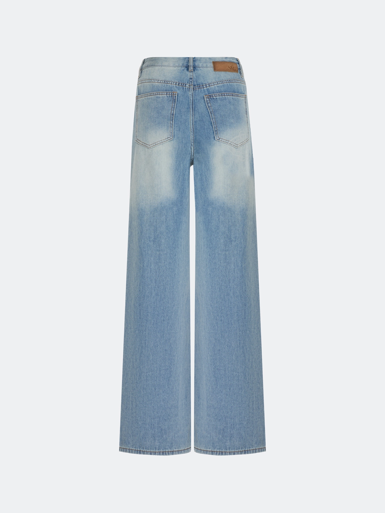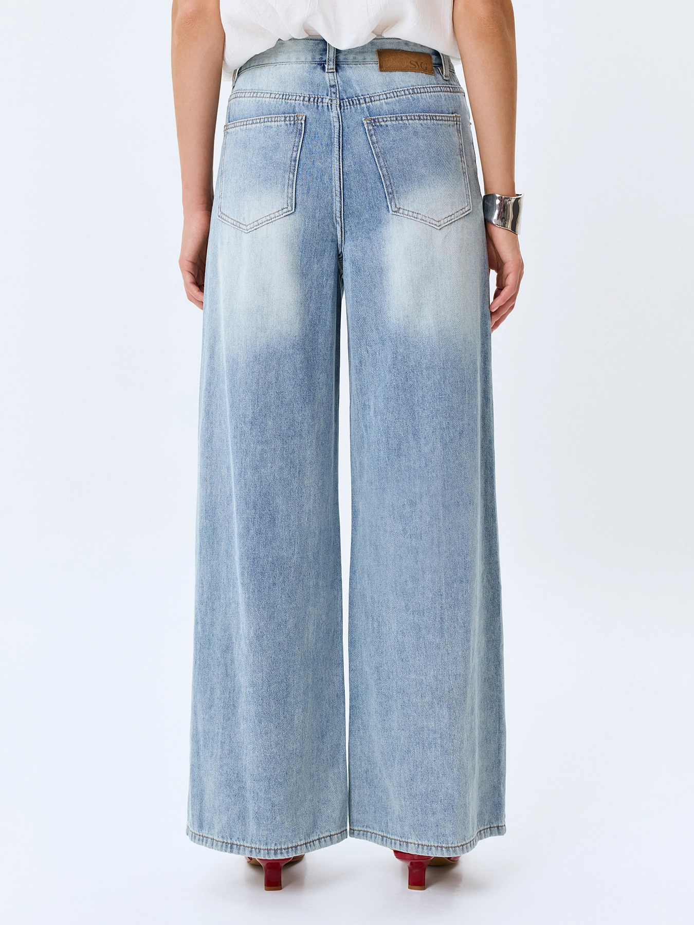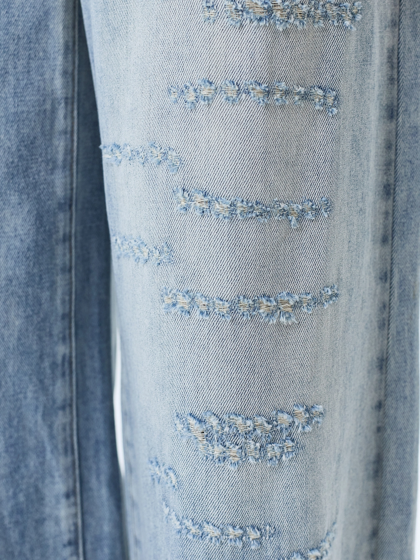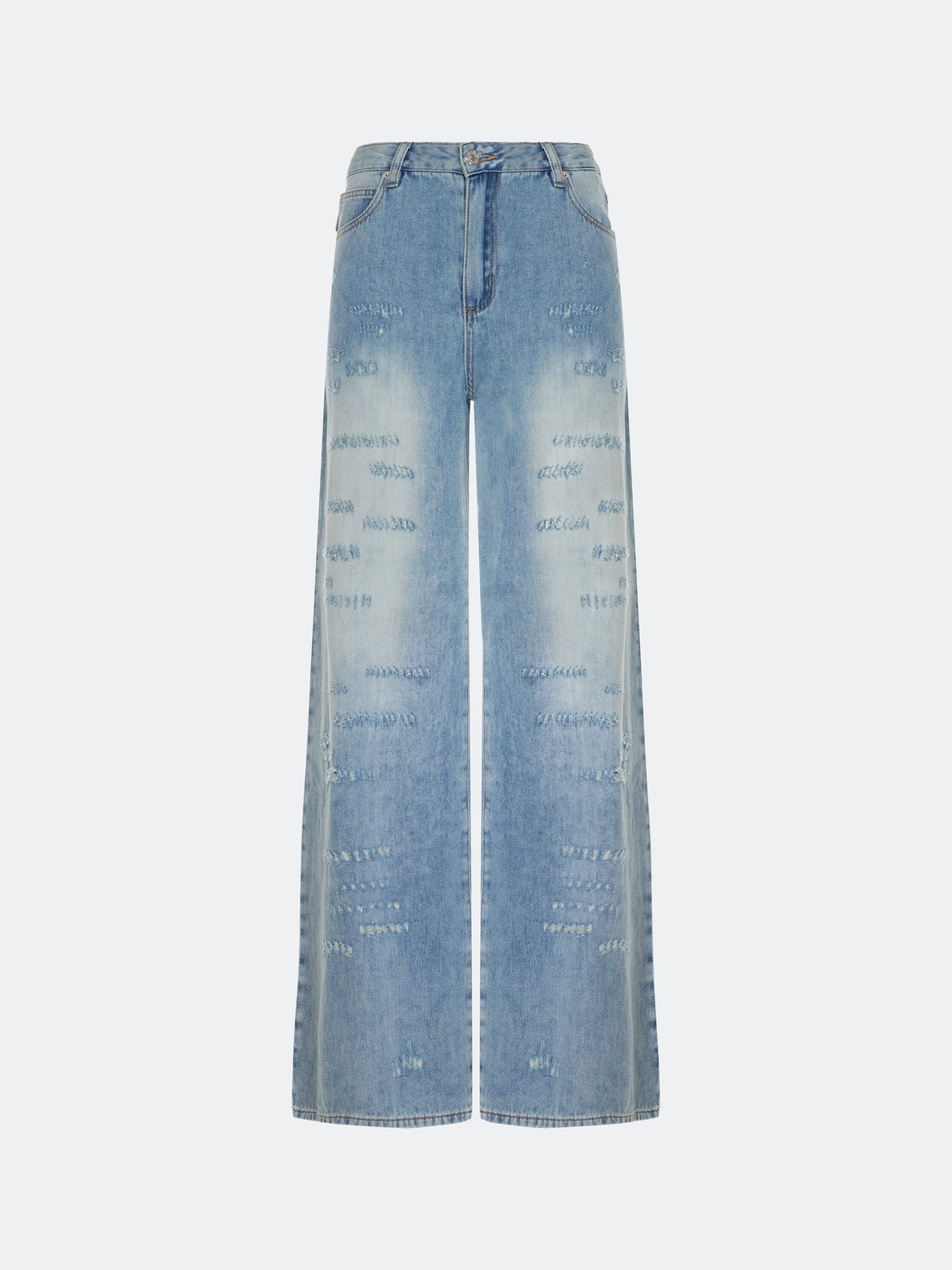 Широкие джинсы с акцентными дестроями и контрастной варкой. Свободный силуэт. Застежка на молнию и металлическую пуговицу. Пять карманов.