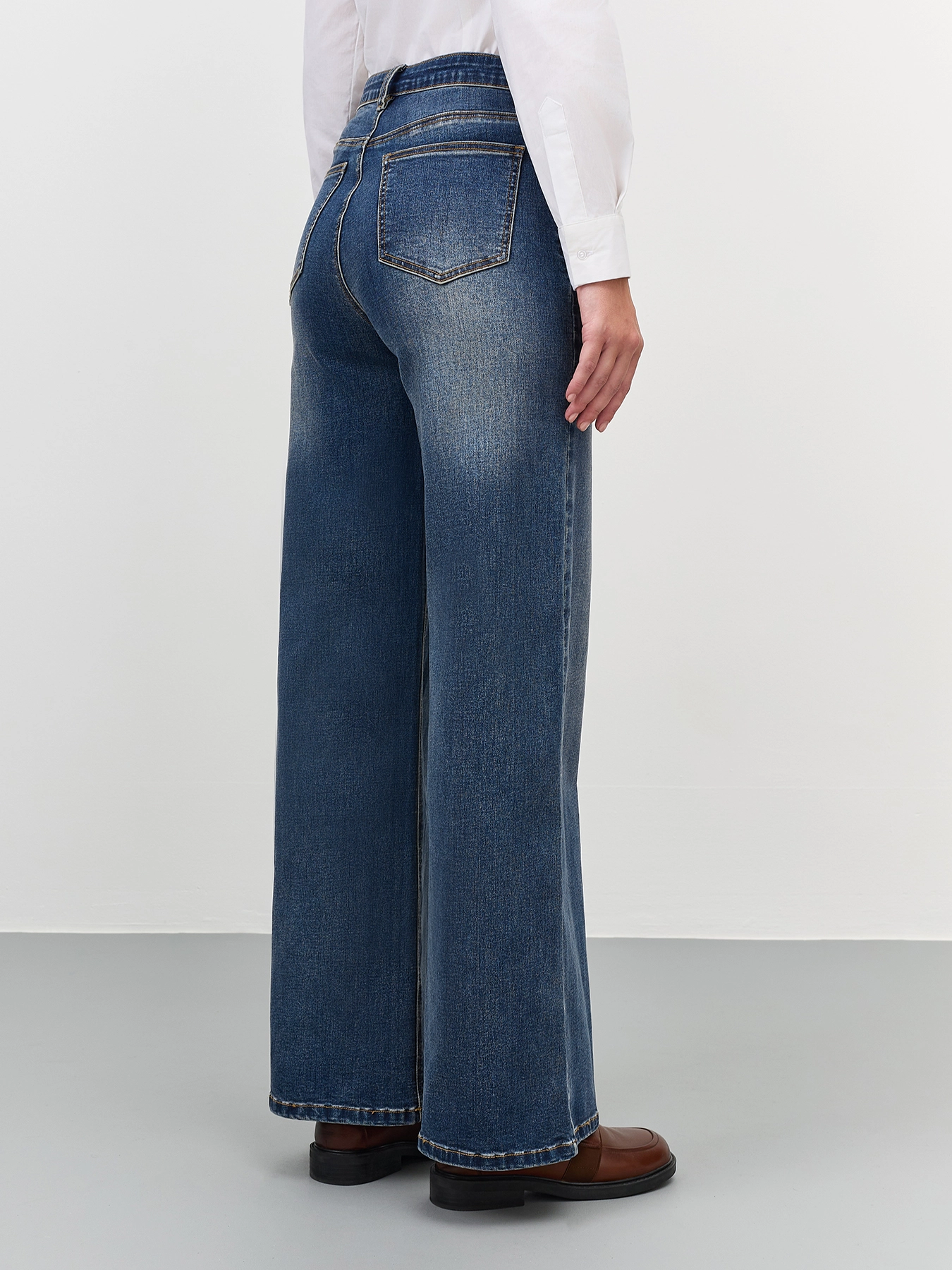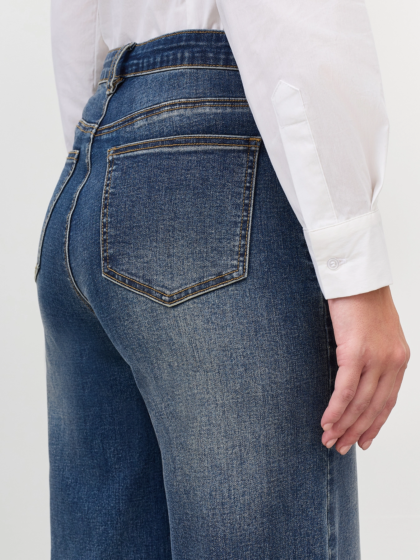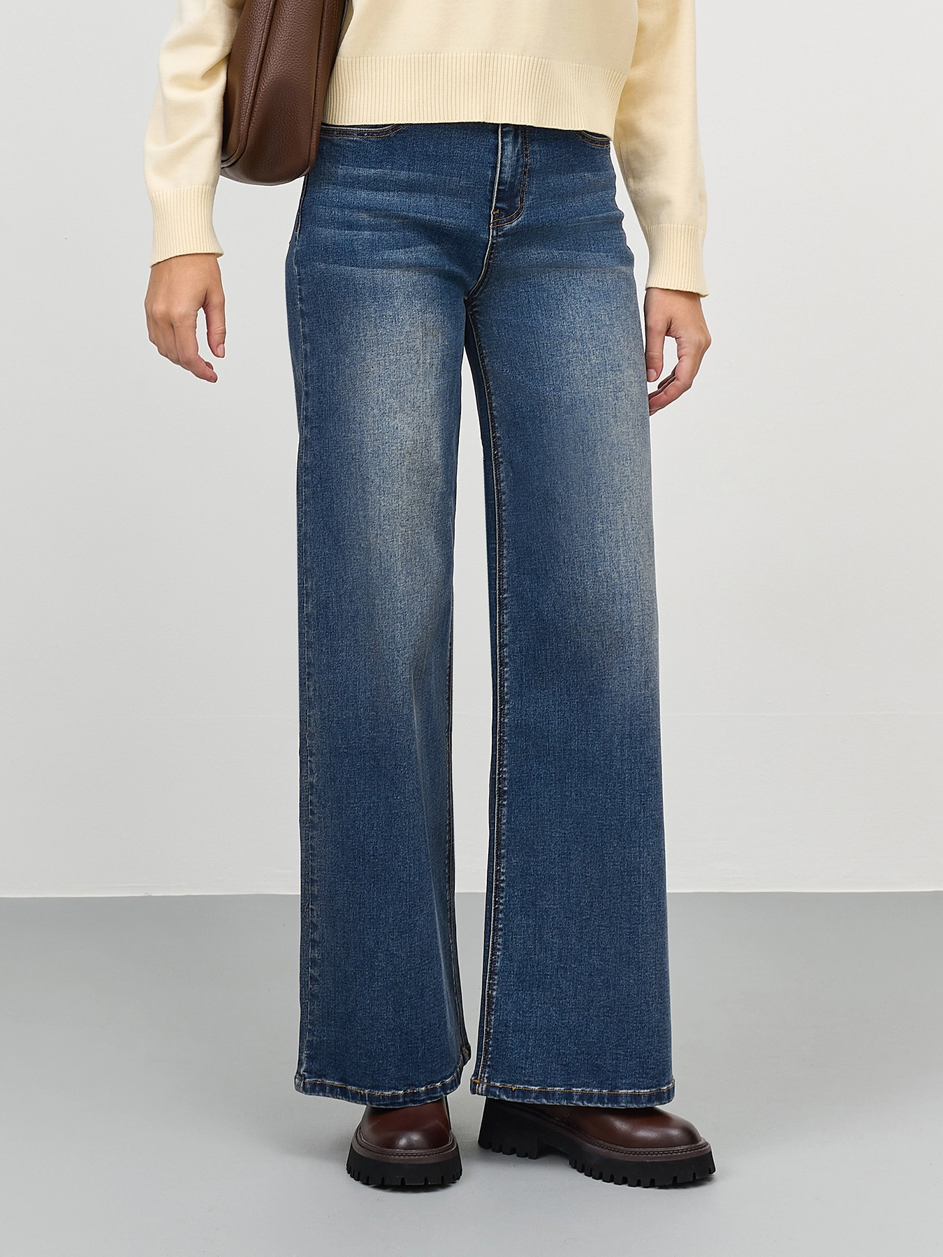 Широкие джинсы из эластичного денима с деликатной варкой. Свободный силуэт. Застежка на молнию и металлическую пуговицу. Пять карманов. В составе спандекс.