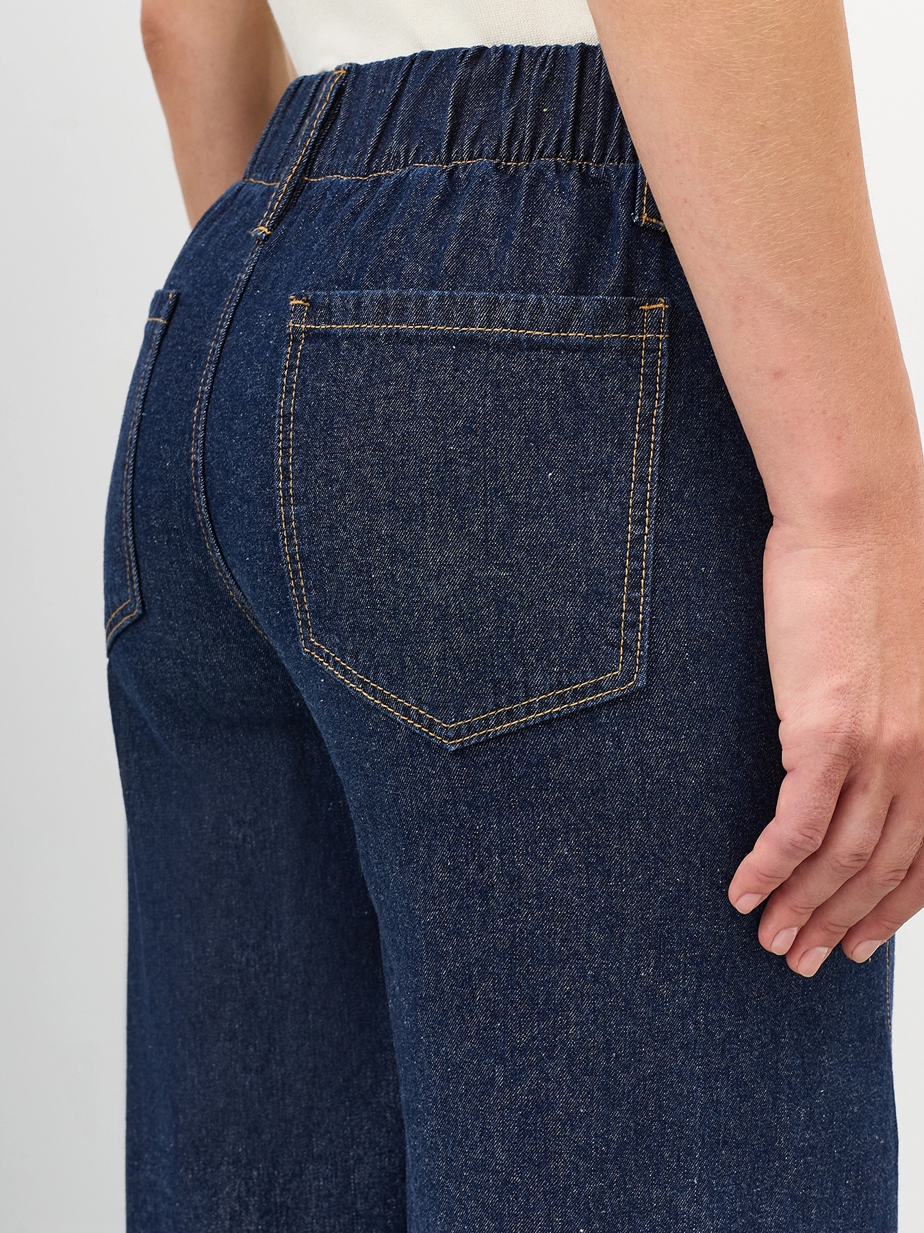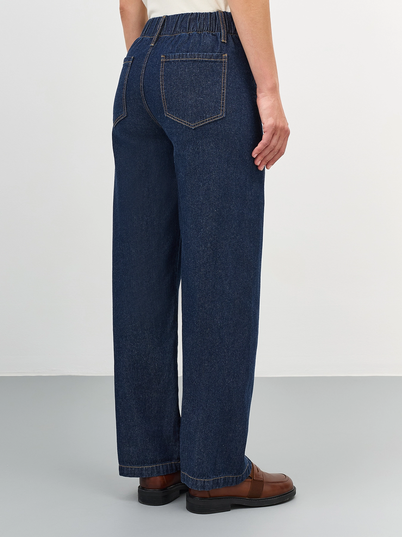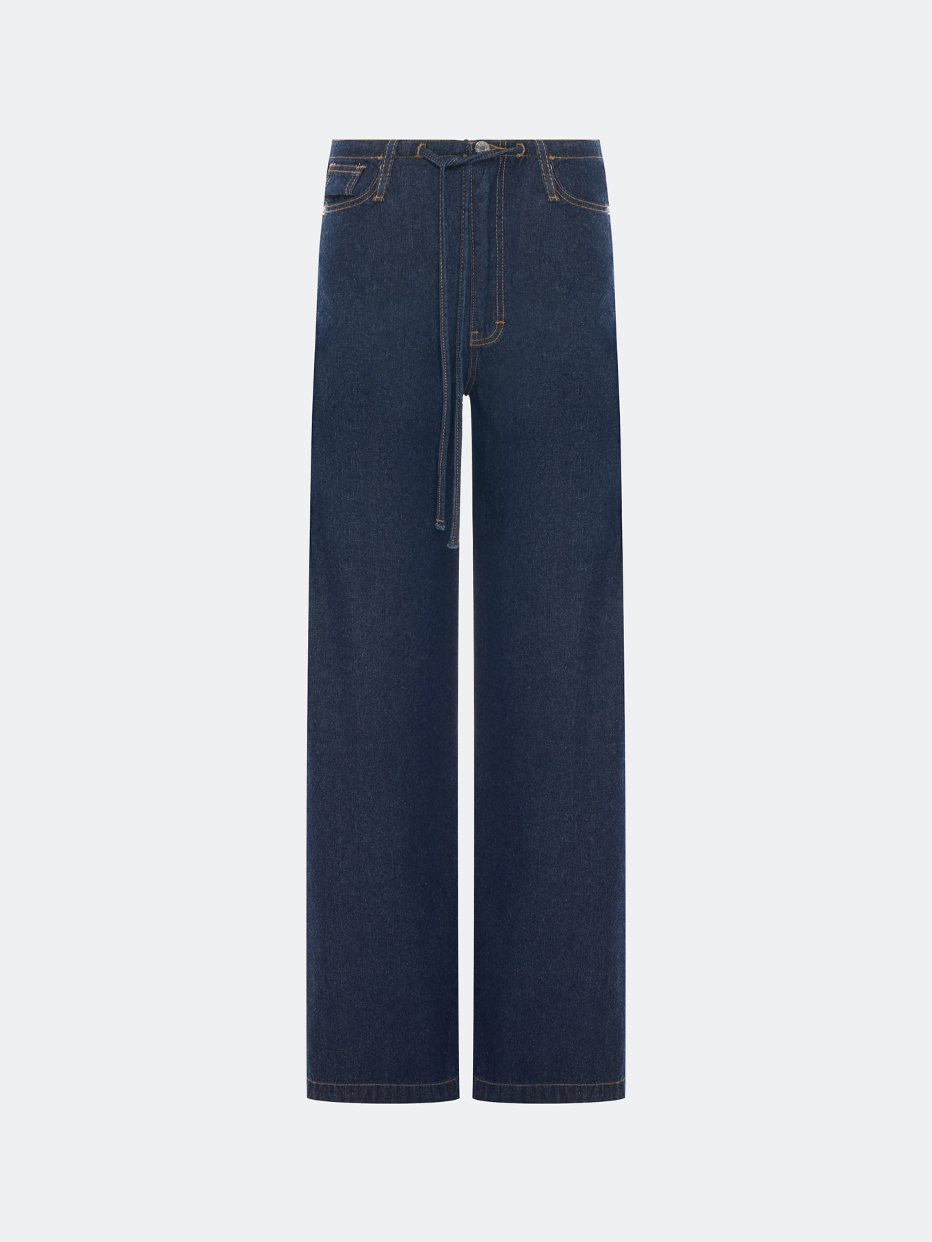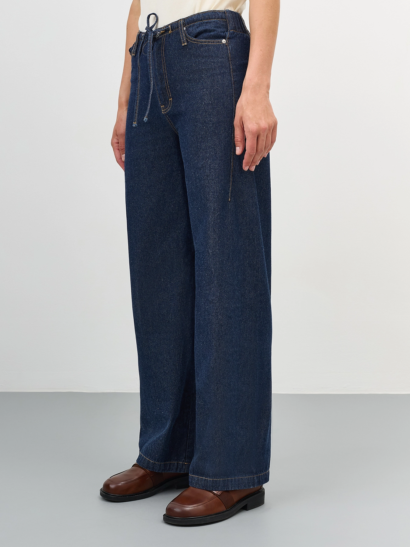 Широкие джинсы с узким поясом по линии талии. Свободный силуэт. Застежка на молнию и пуговицу. Пять карманов. Резинка по линии талии сзади. Впереди кулиса с тонким поясом. В составе хлопок.