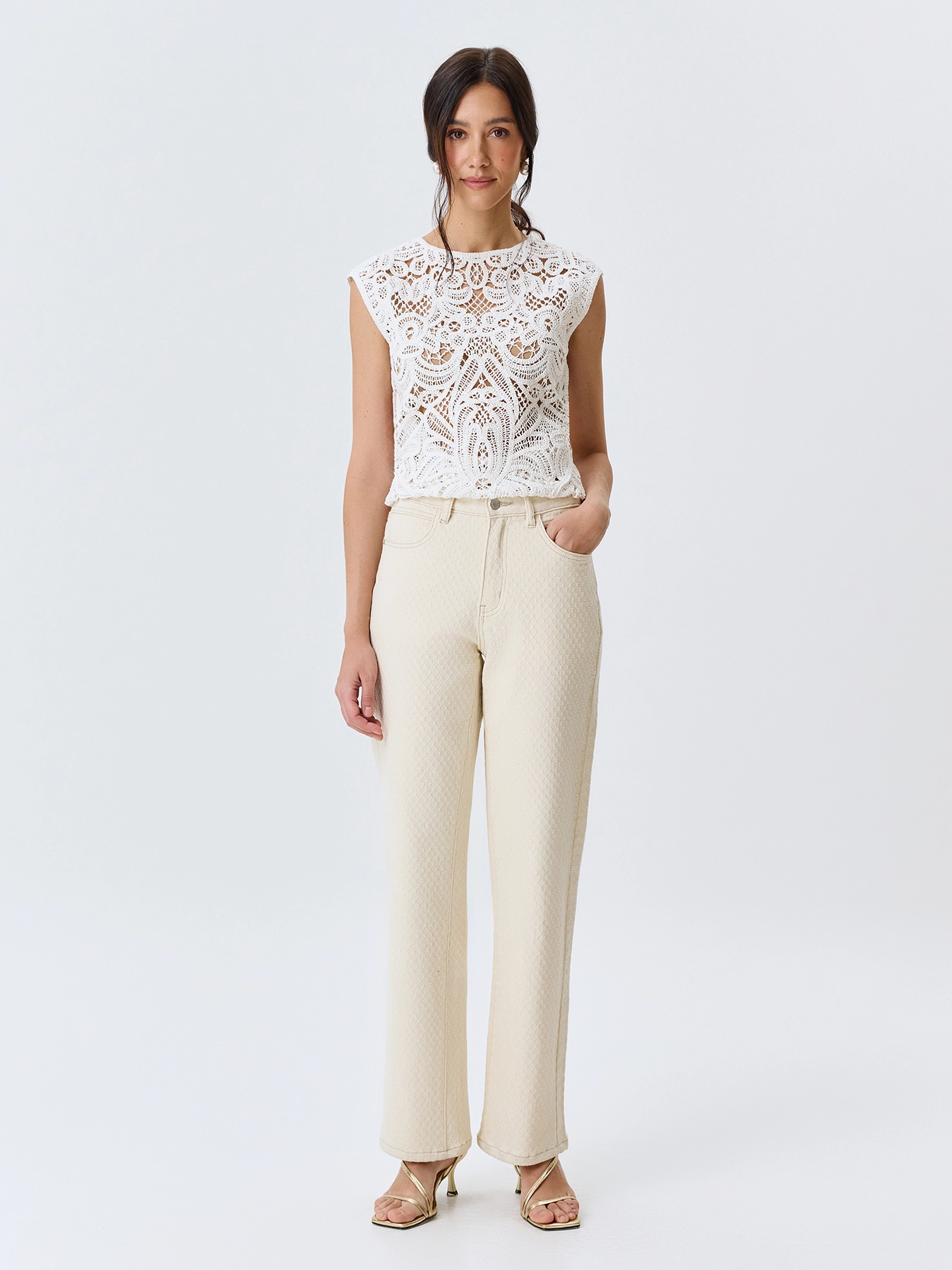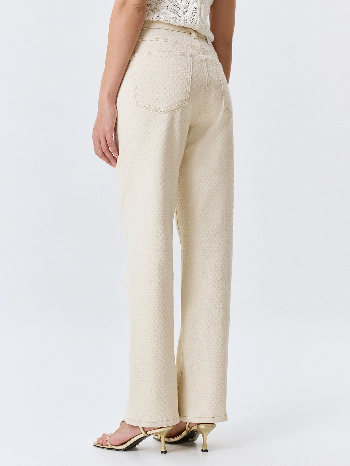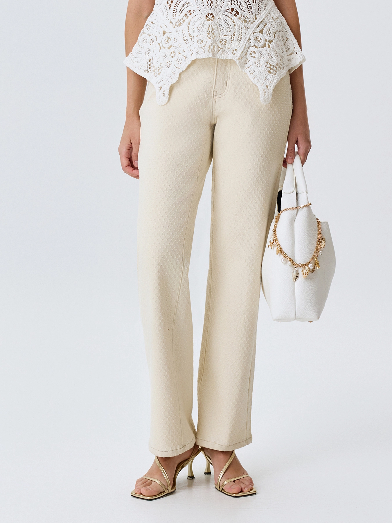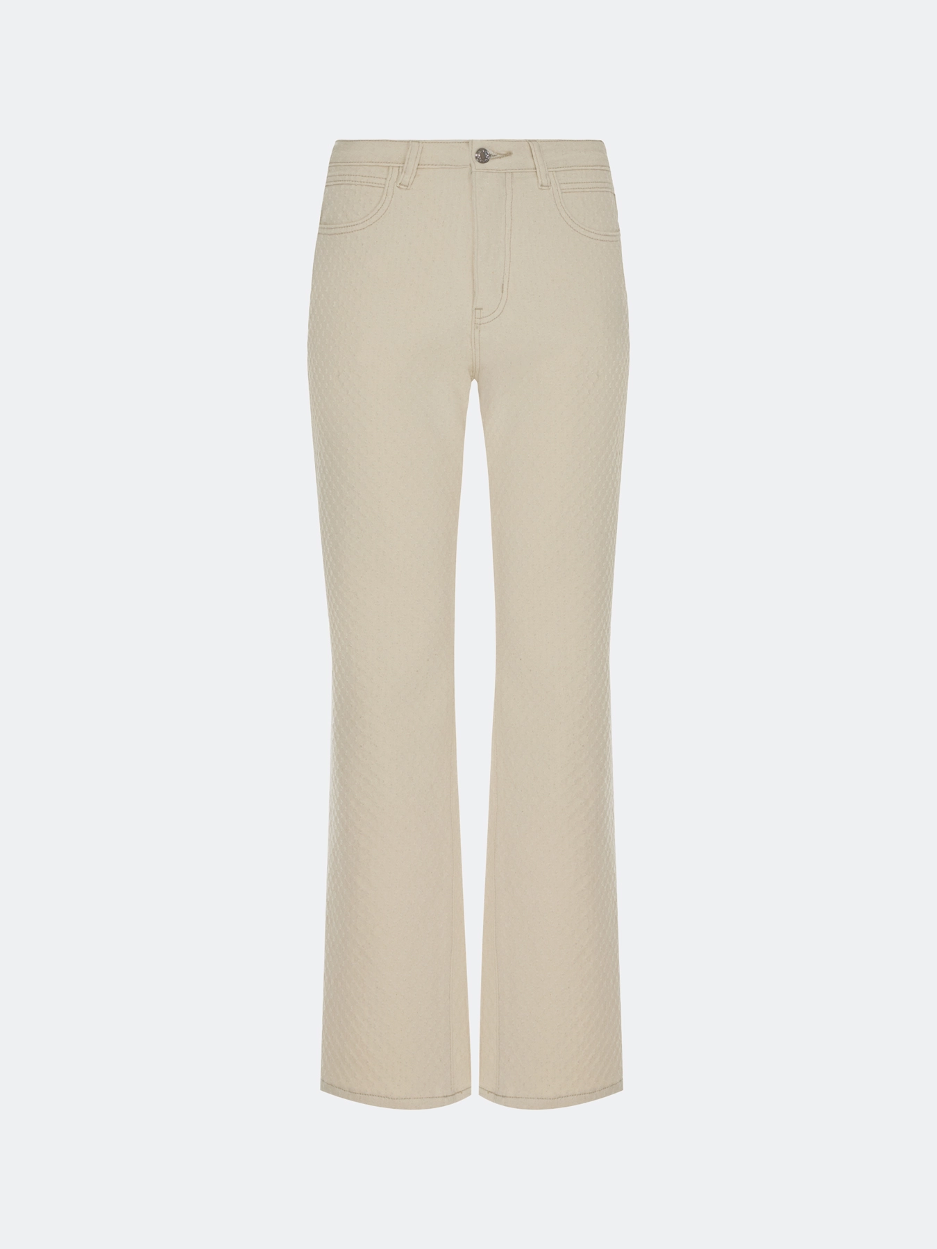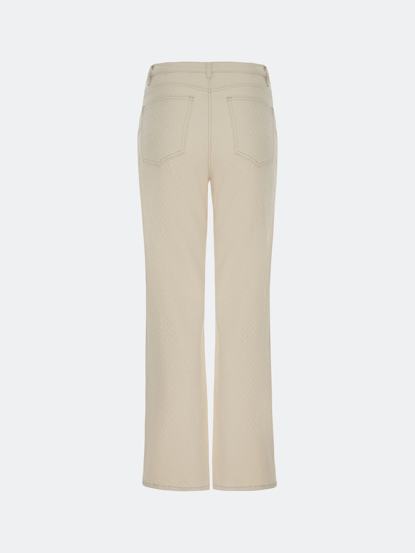 Жаккардовые джинсы прямого силуэта из эластичного денима. Застежка на молнию и металлическую пуговицу. Пять карманов. В составе спандекс.