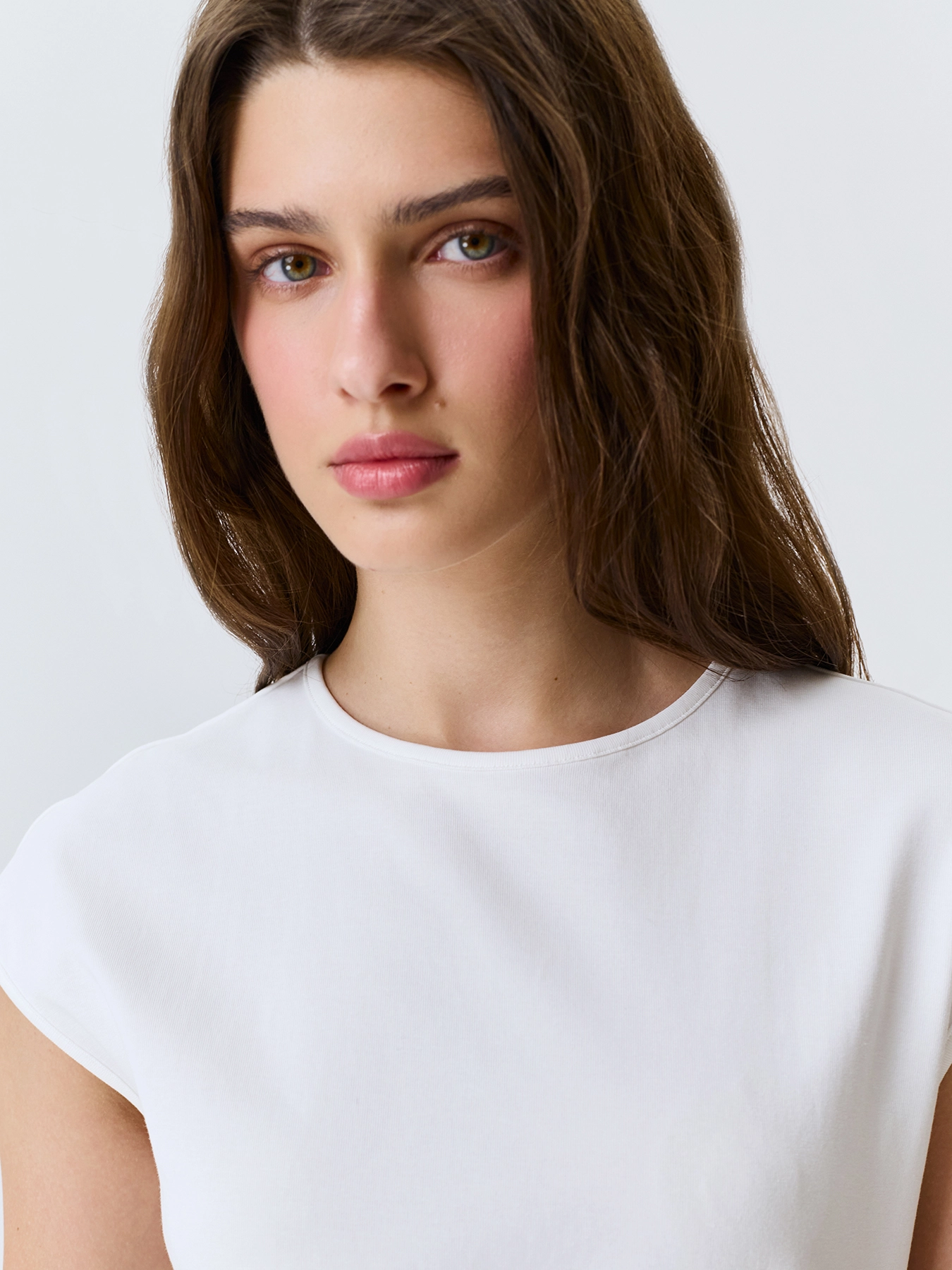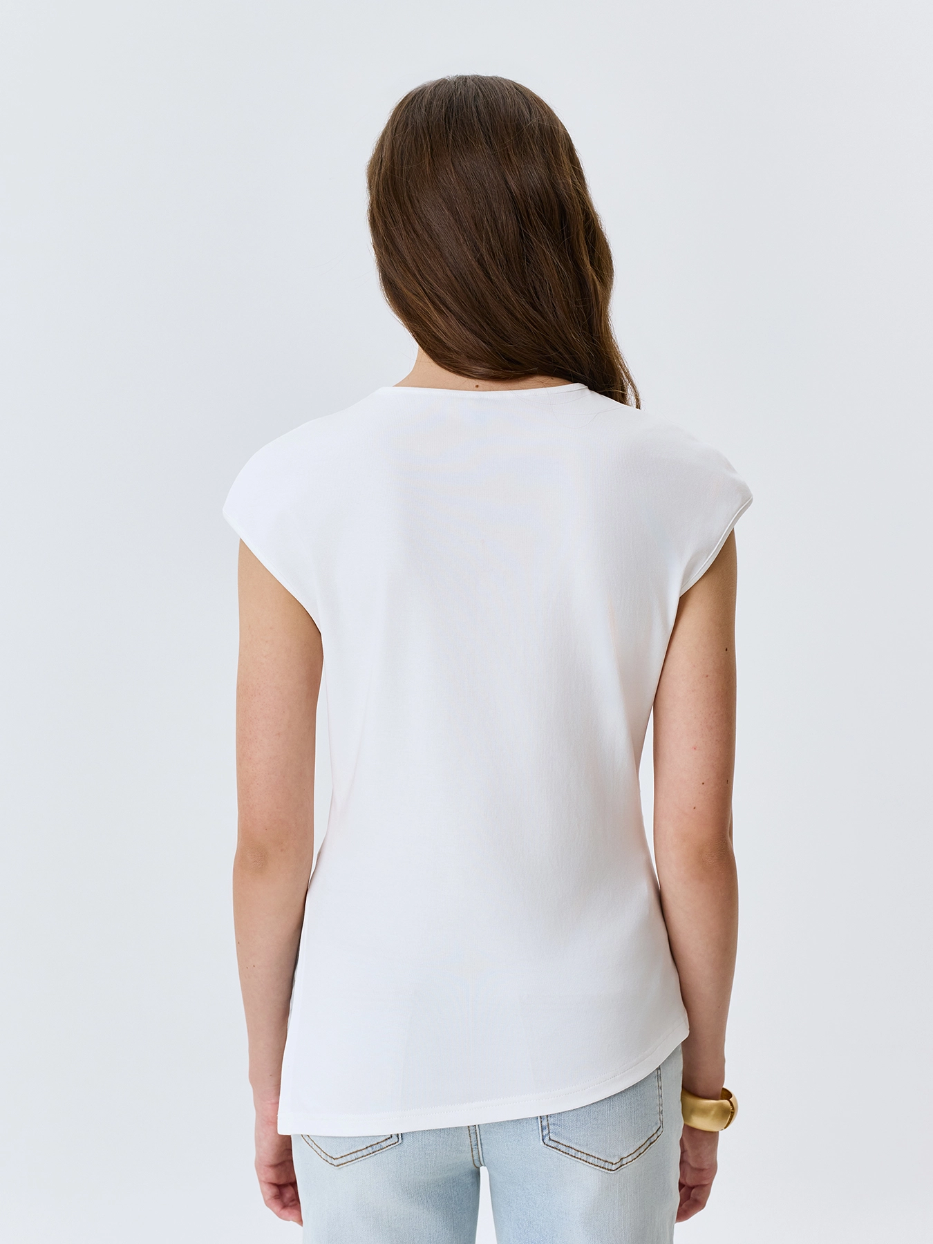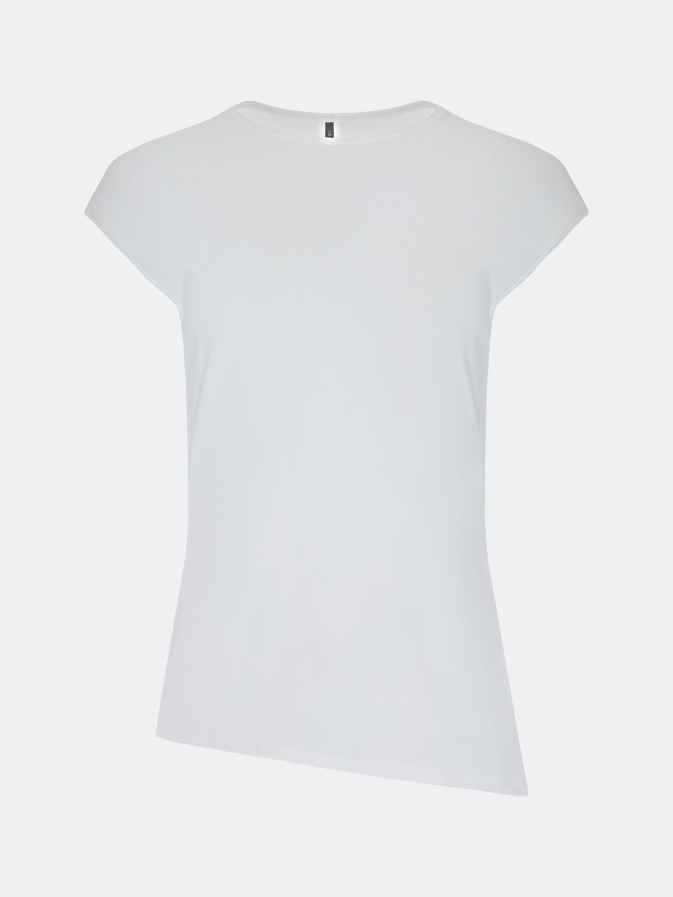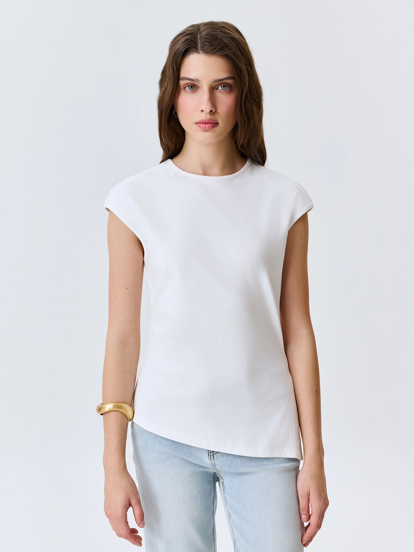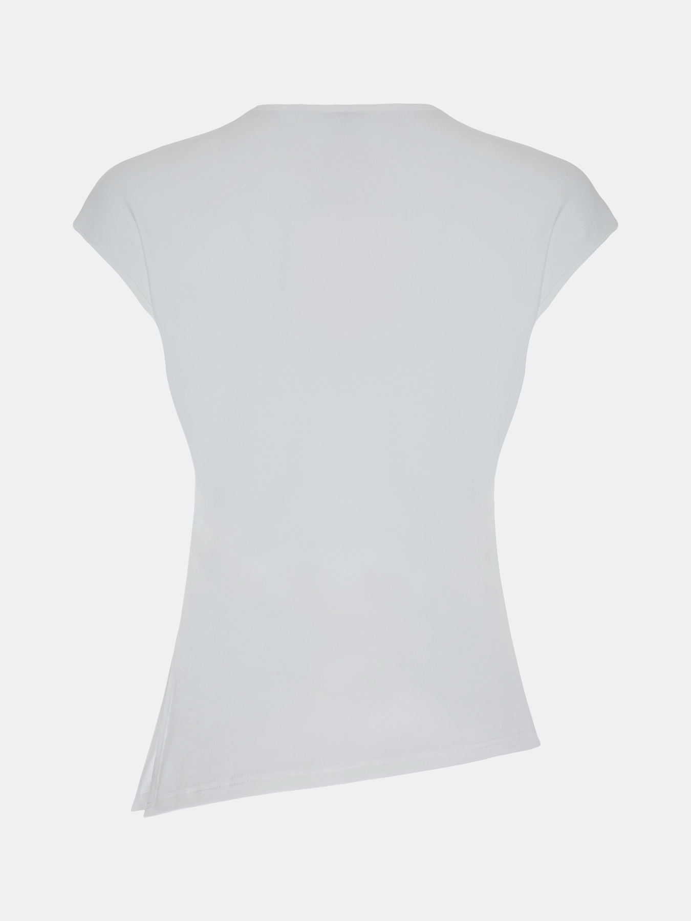 Асимметричный топ с высоким разрезом в боковом шве. Приталенный силуэт. Мягкая драпировка по линии талии. Круглый вырез. Спущенная линия плеч. В составе хлопок.
