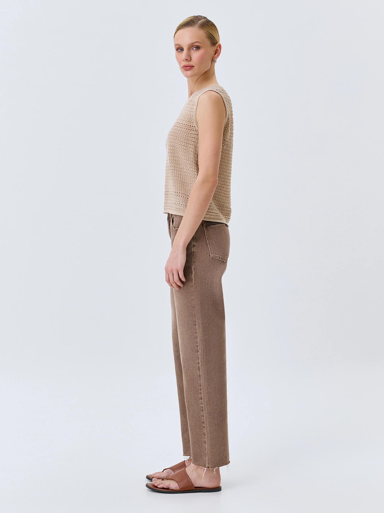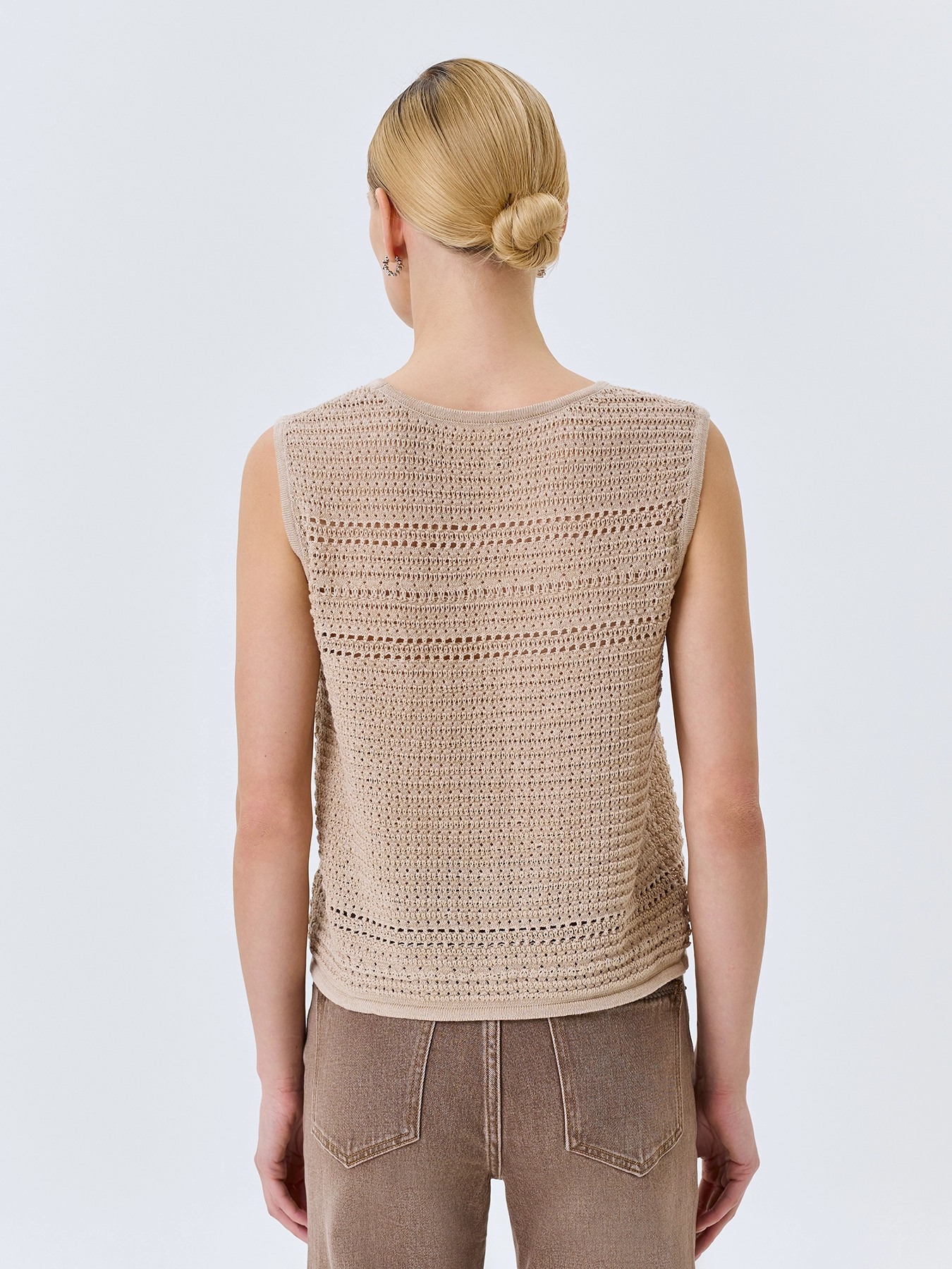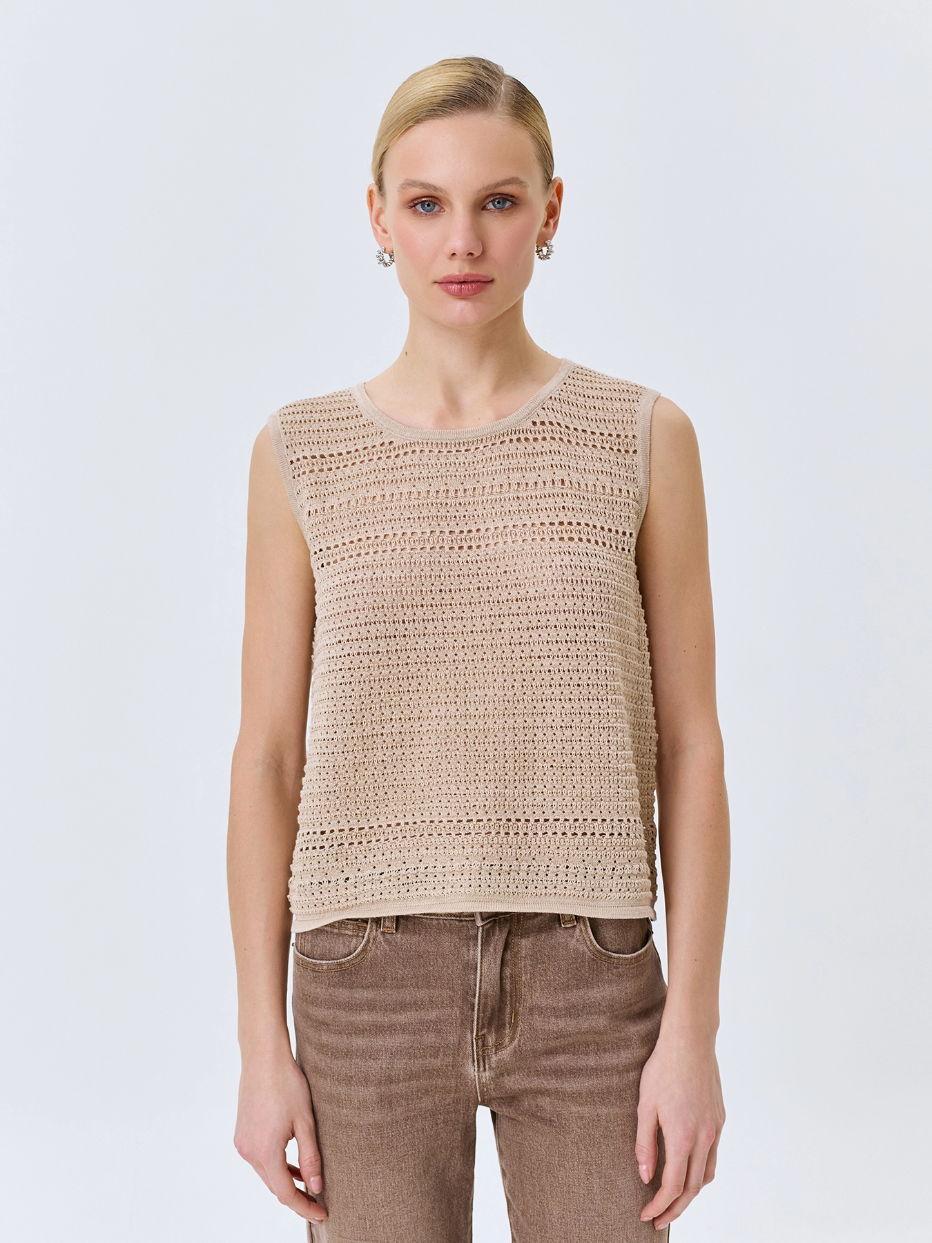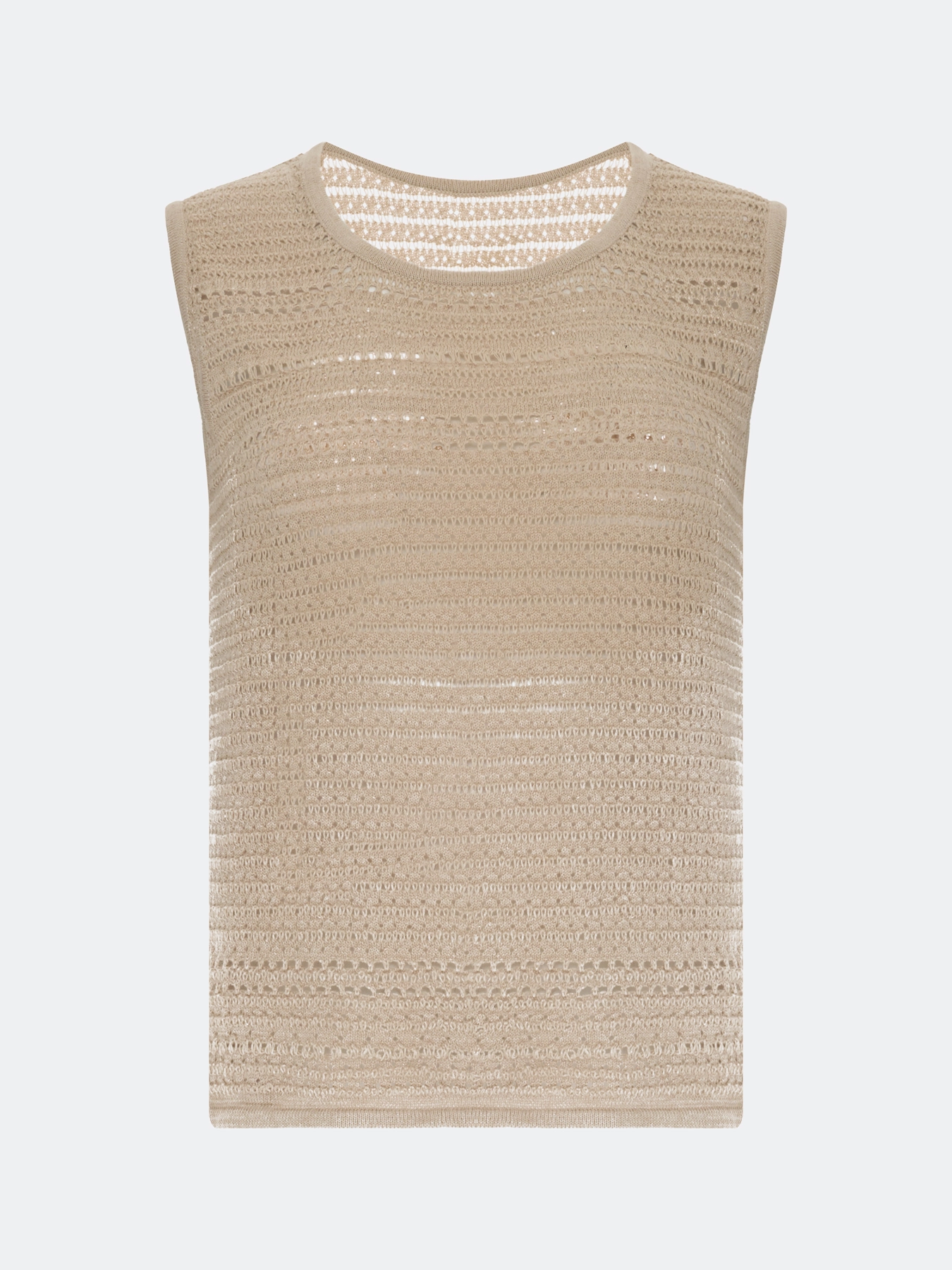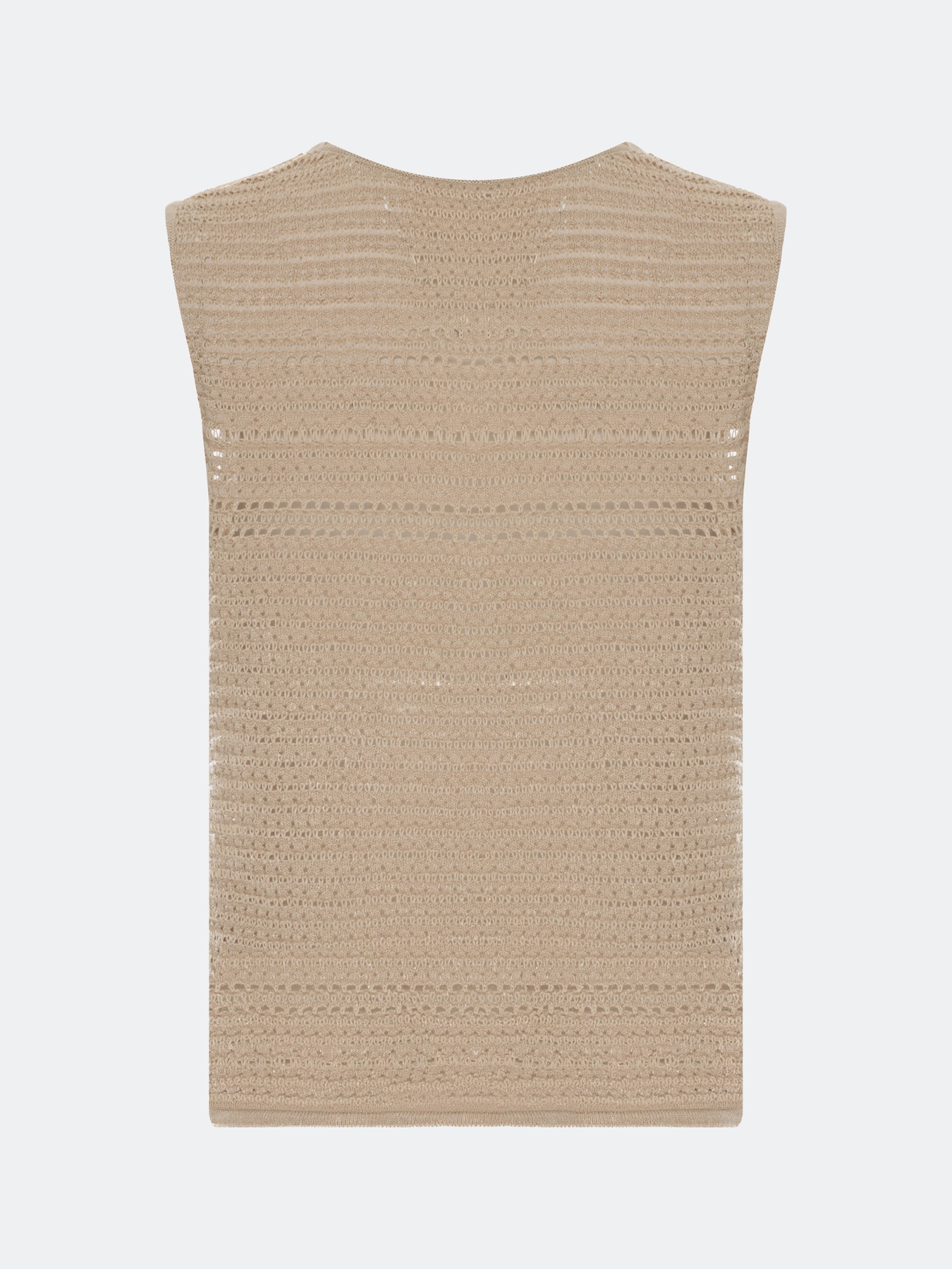 Ажурный топ из хлопка с искрящимся люрексом. Свободный силуэт. Круглый вырез. Без рукавов.