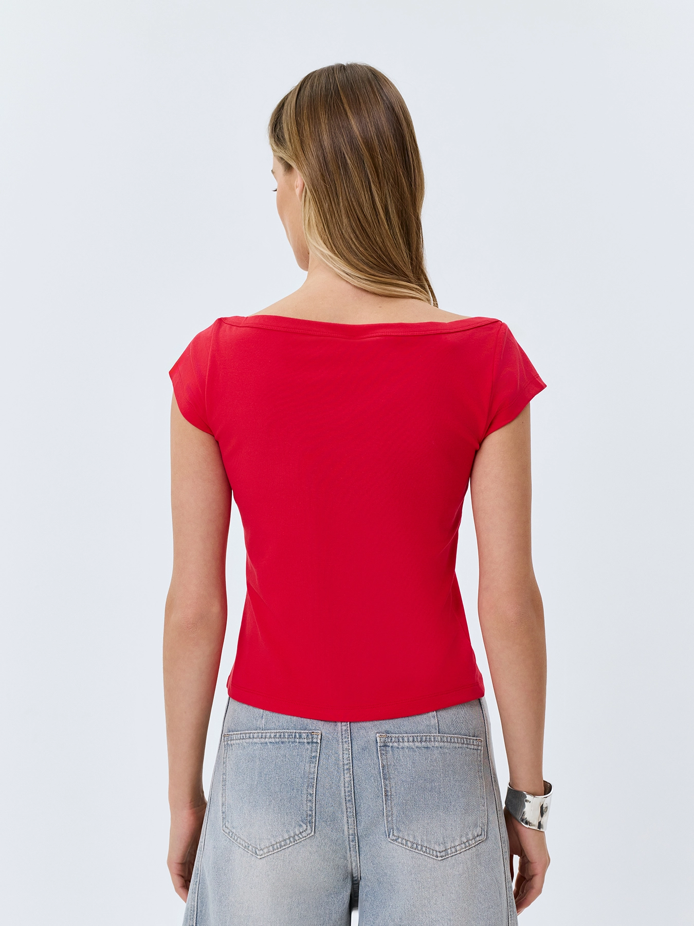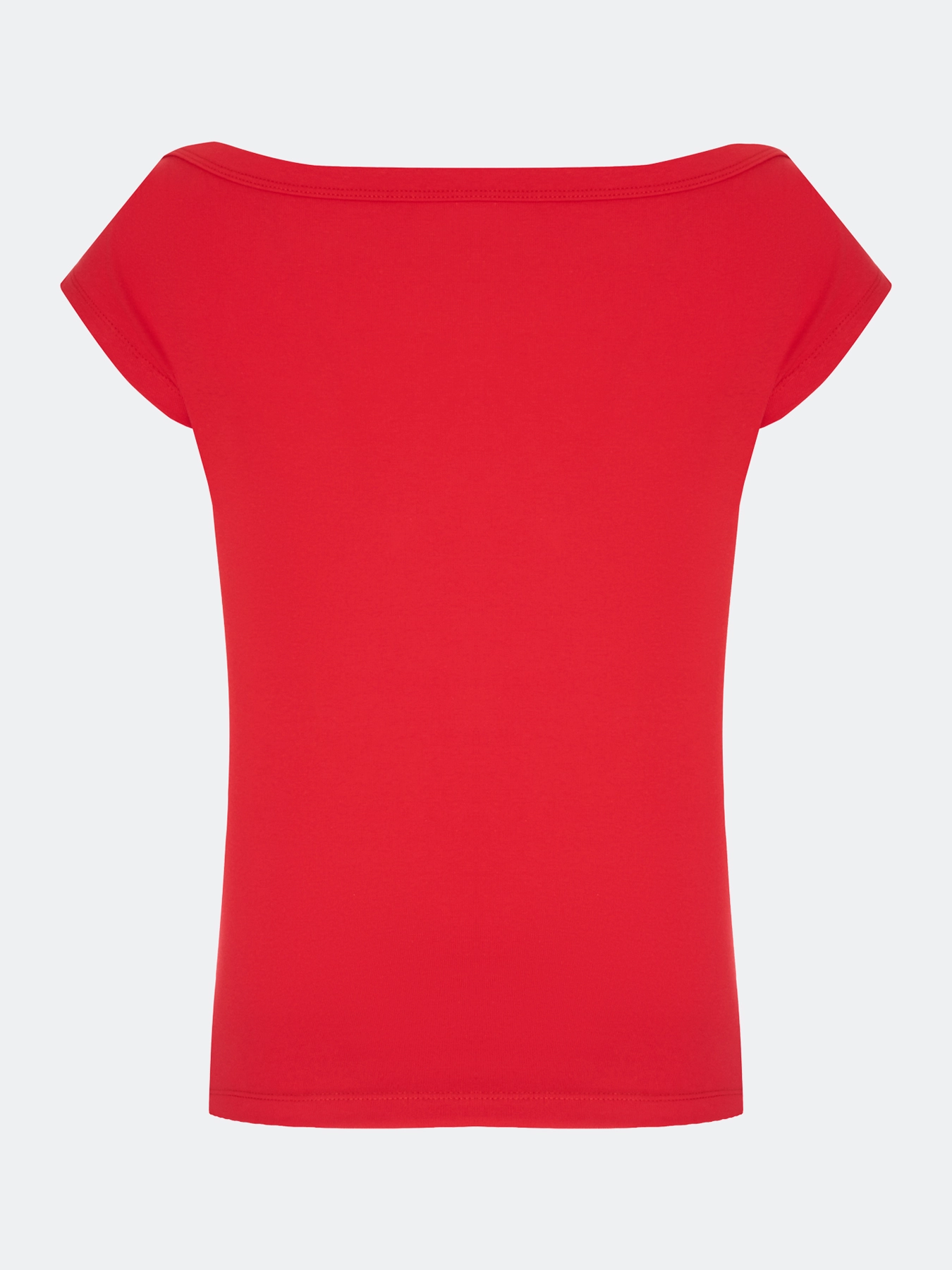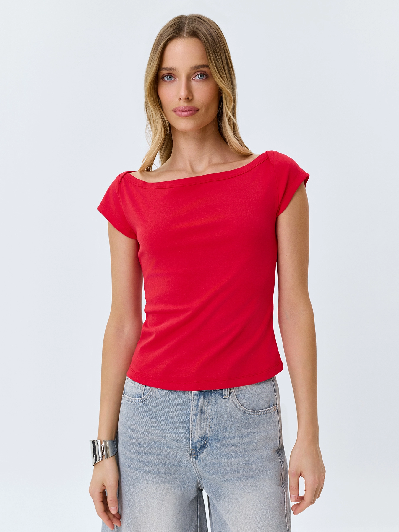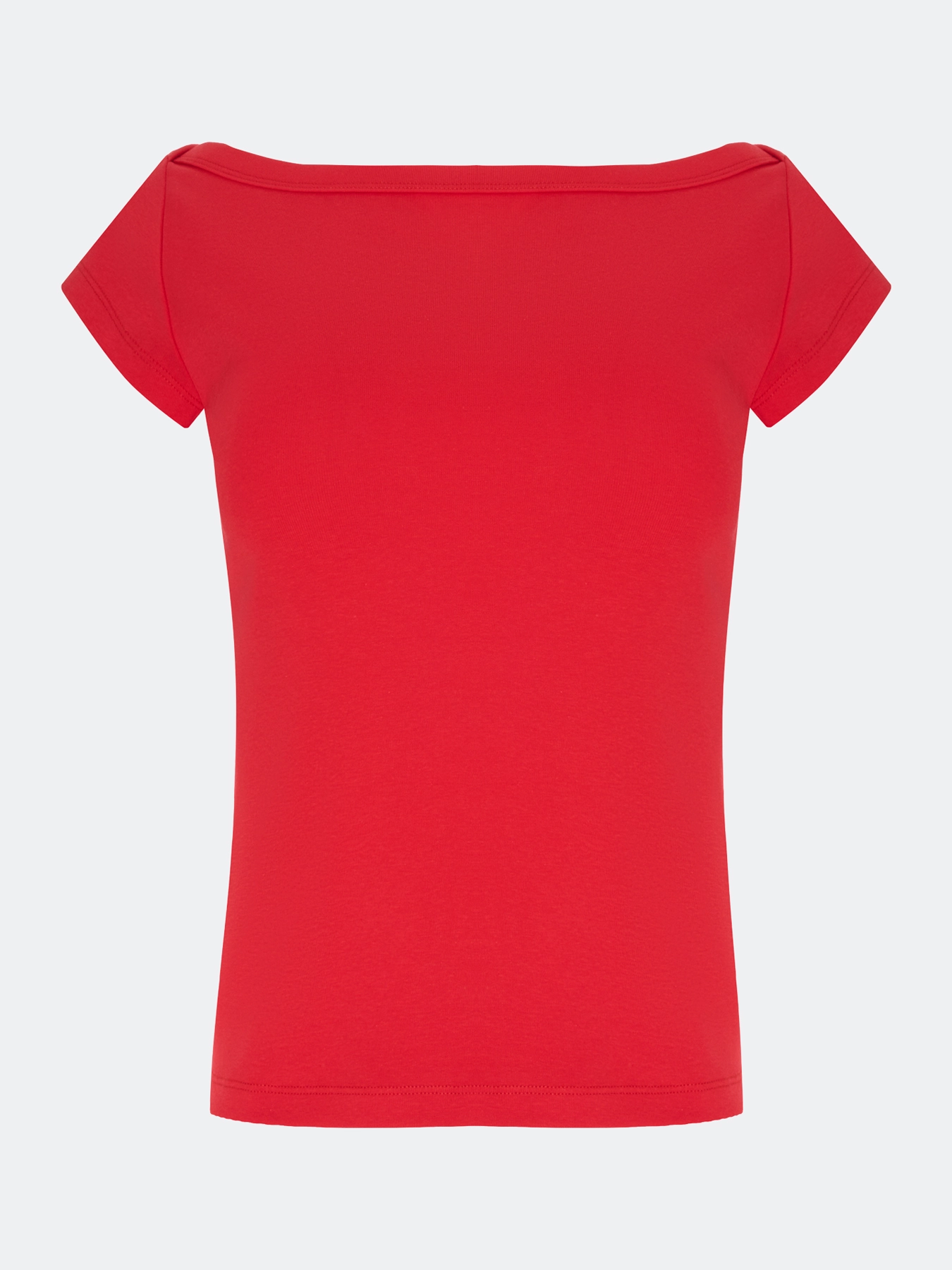 Базовая приталенная футболка. Вырез лодочка. Короткие втачные рукава. В составе хлопок.