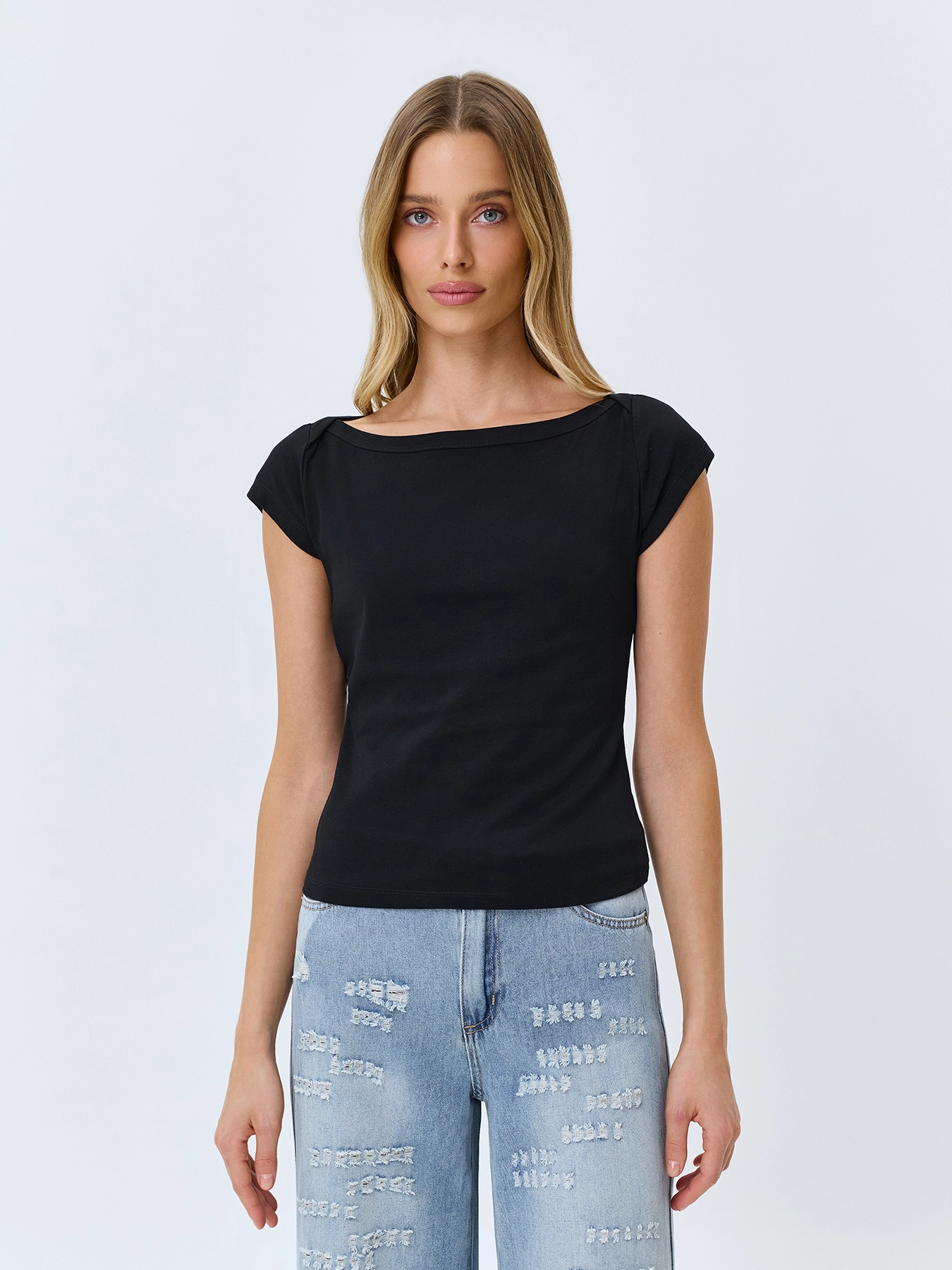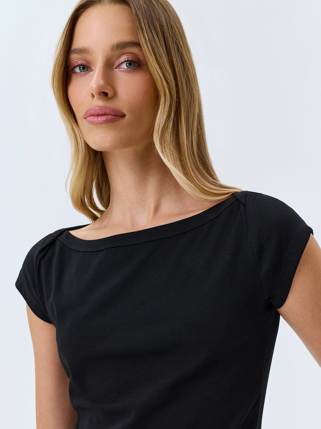 Базовая приталенная футболка. Вырез лодочка. Короткие втачные рукава. В составе хлопок.
