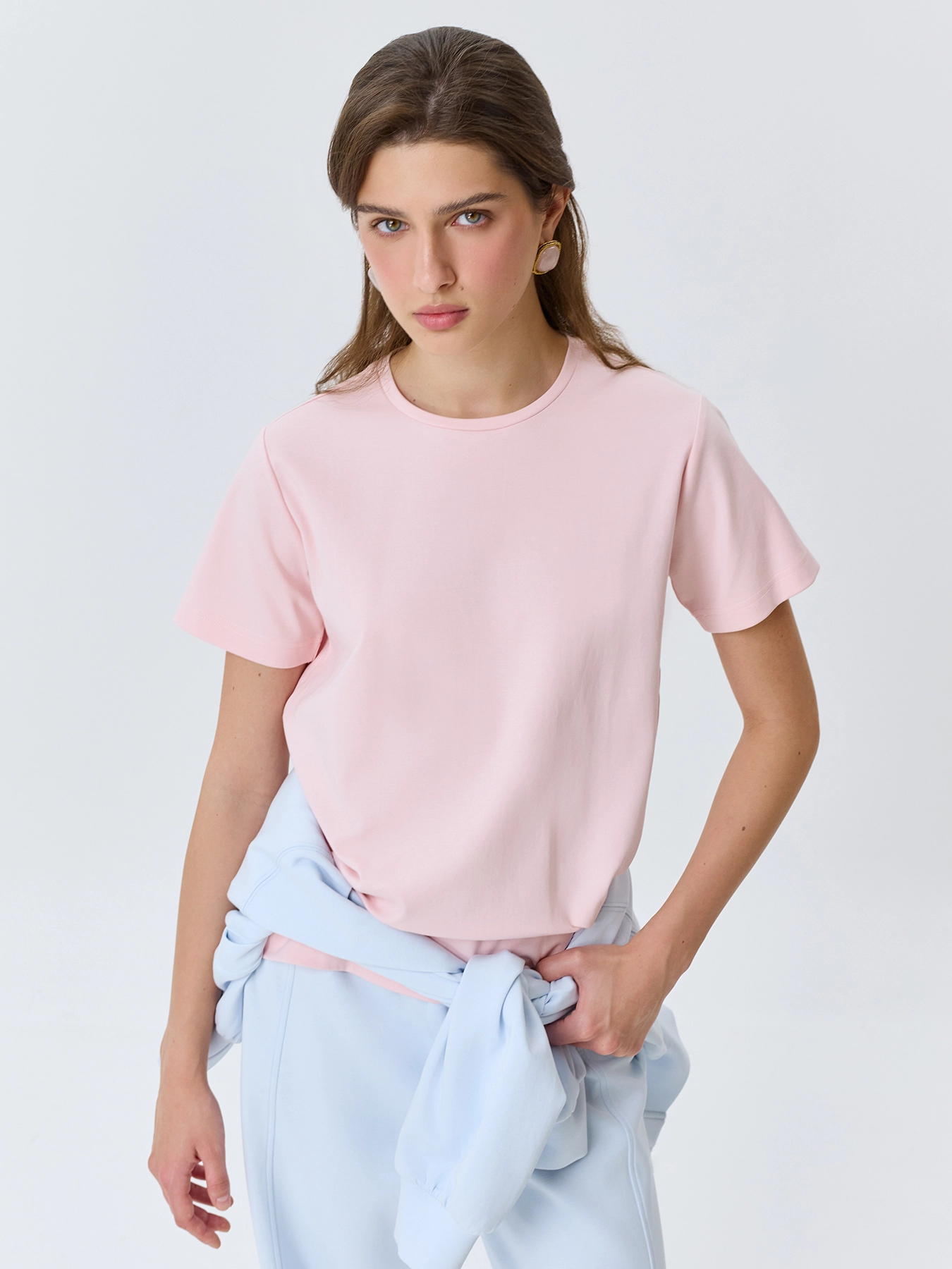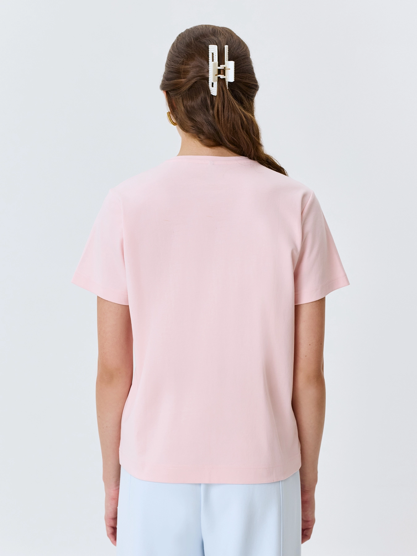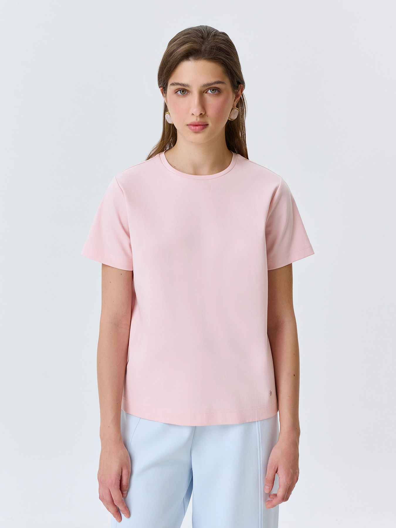 Базовая яркая футболка. Прямой силуэт. Круглый вырез. Короткие втачные рукава. Дополнена деликатным металлическим декором. В составе хлопок.