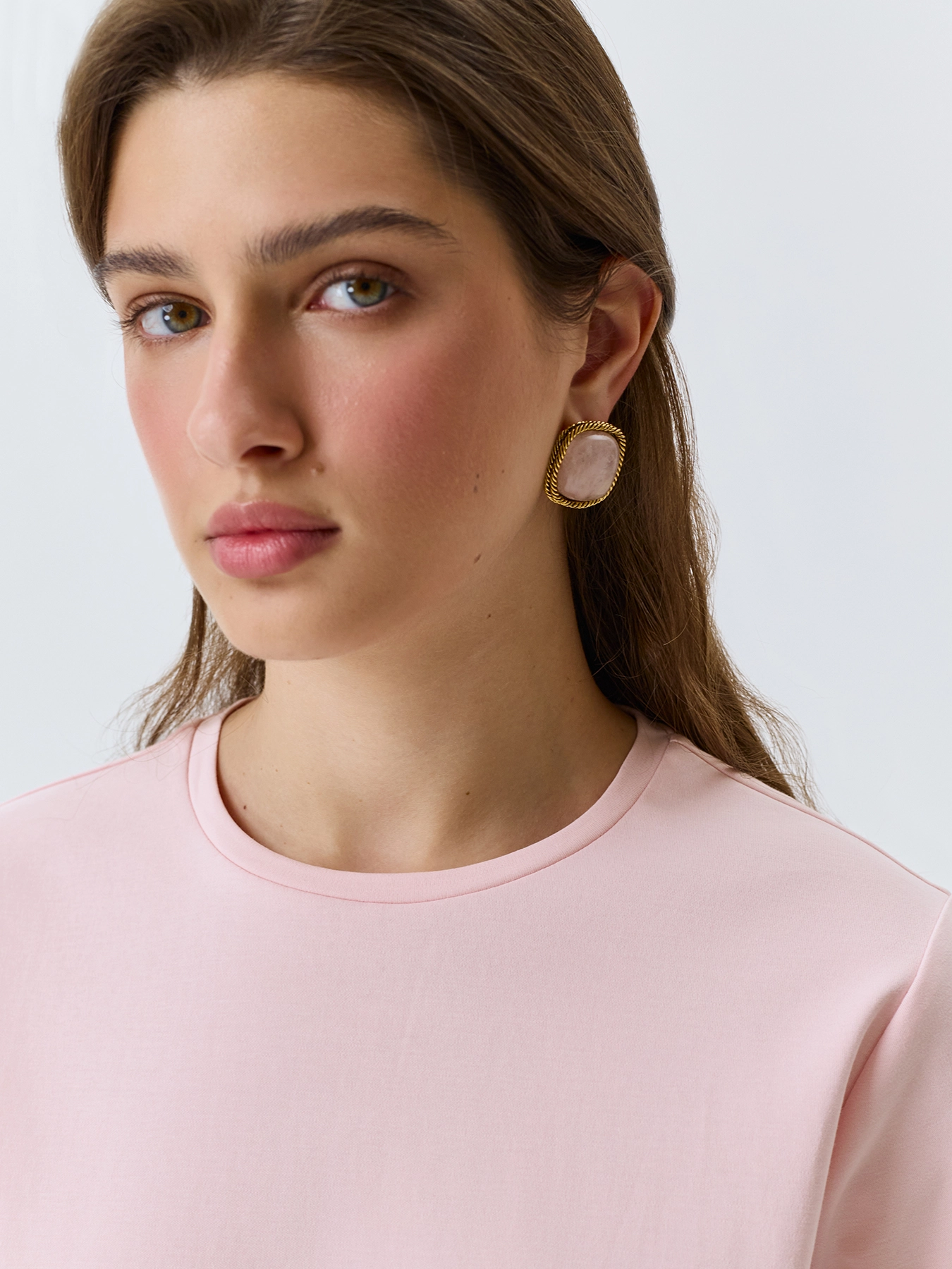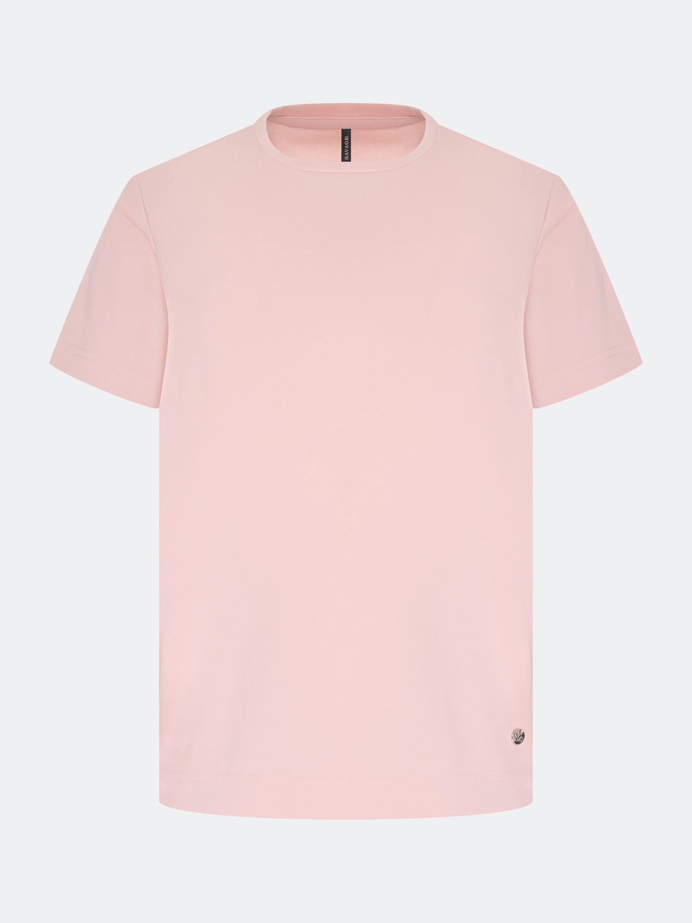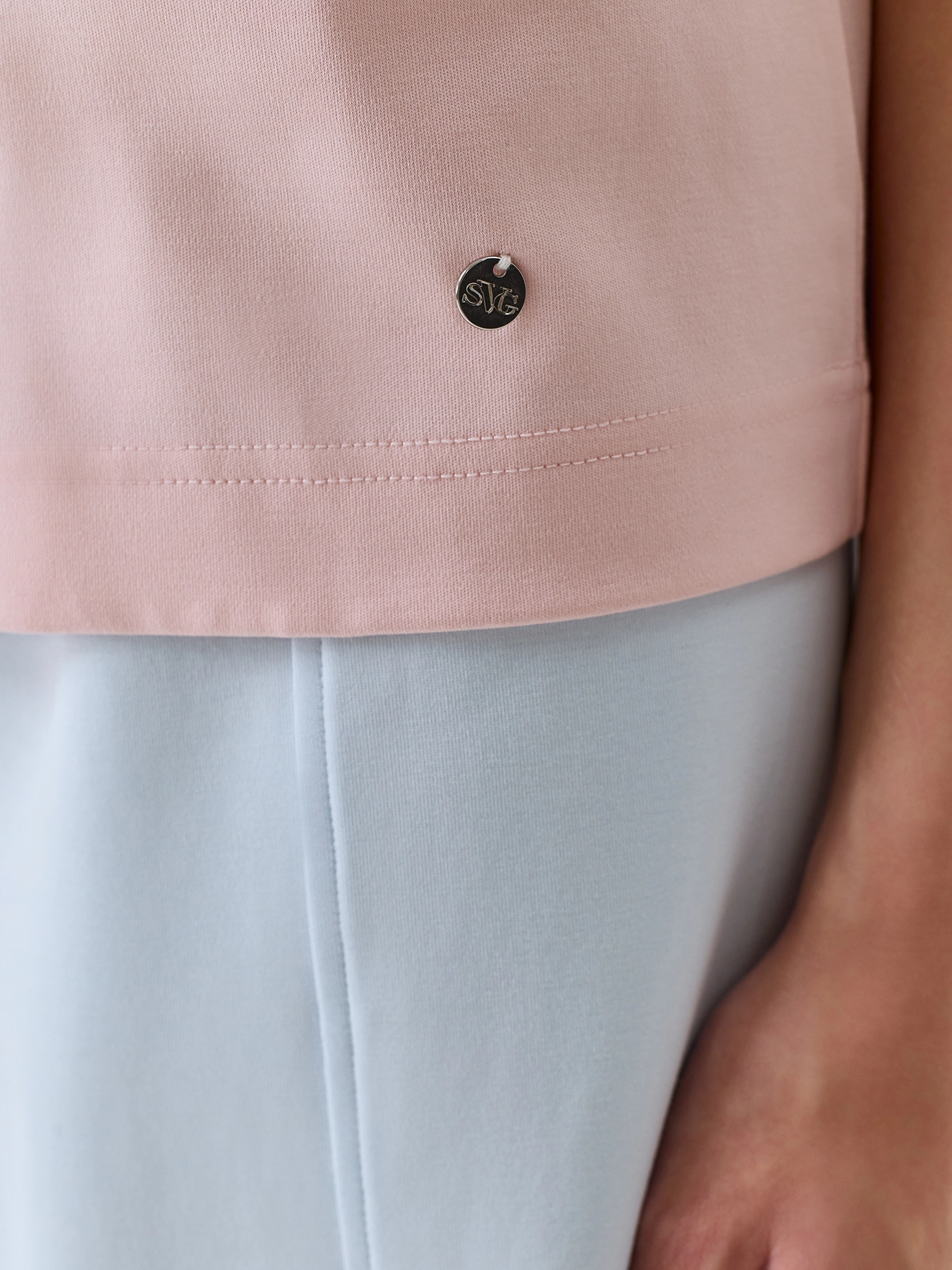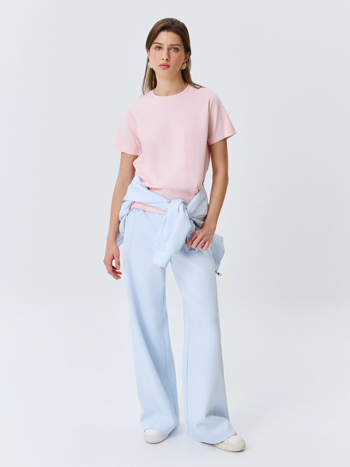 Базовая яркая футболка. Прямой силуэт. Круглый вырез. Короткие втачные рукава. Дополнена деликатным металлическим декором. В составе хлопок.