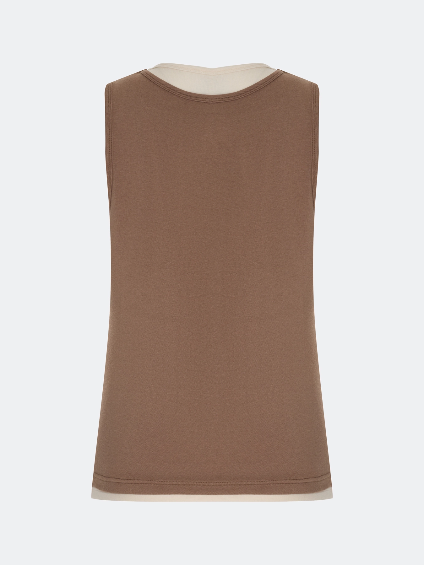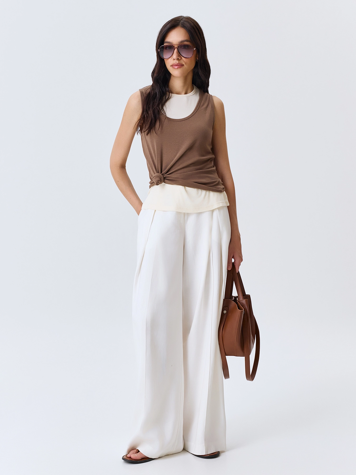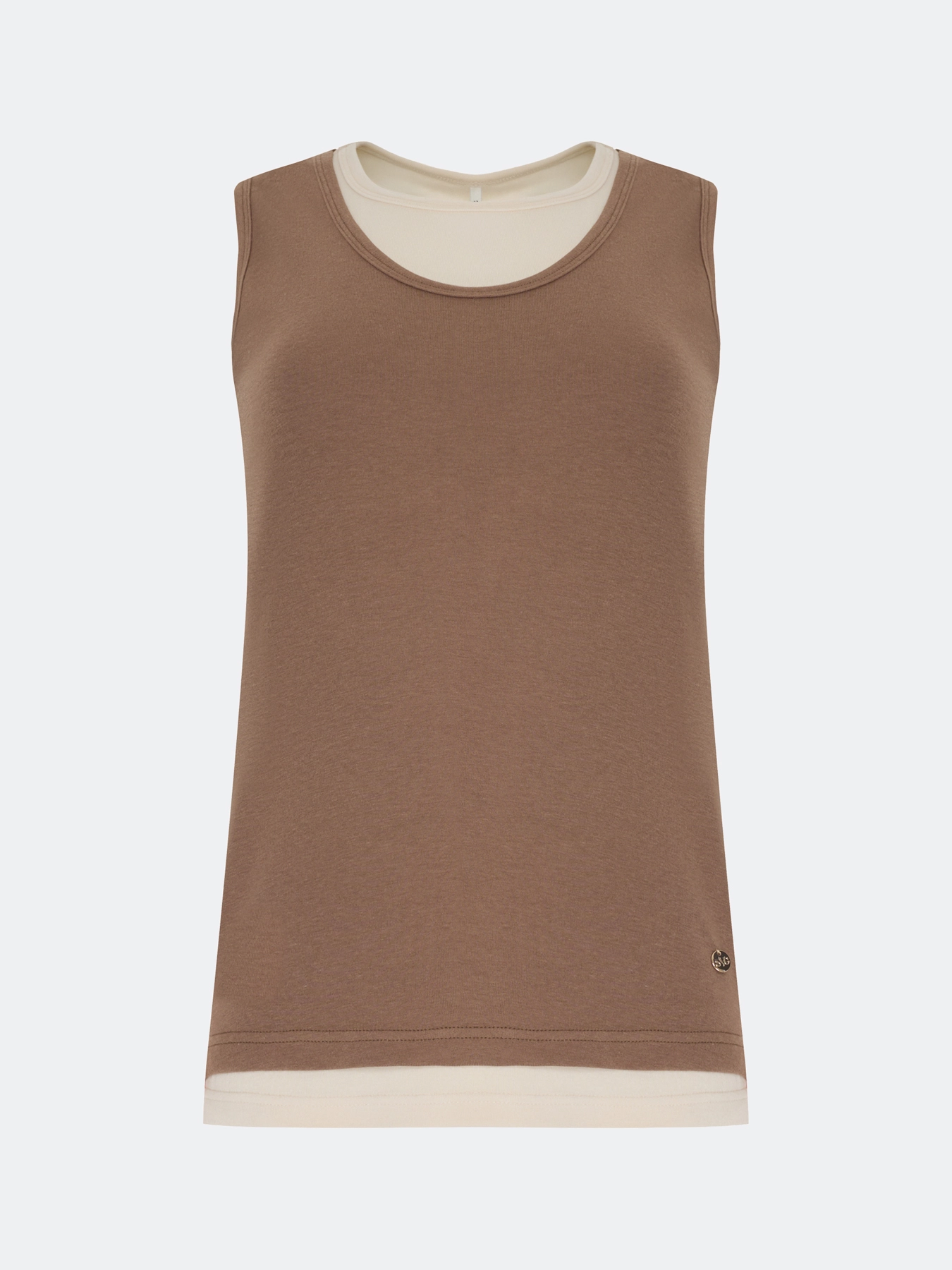Двойной хлопковый топ. Прямой силуэт. Круглый вырез. Широкие бретели. Дополнен деликатным металлическим декором. Два топа можно носить по отдельности.