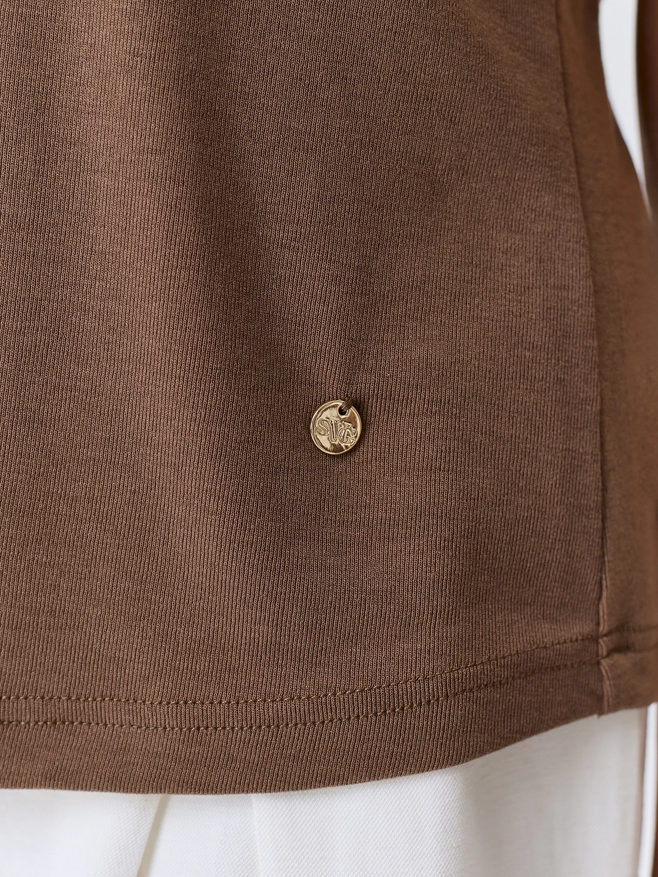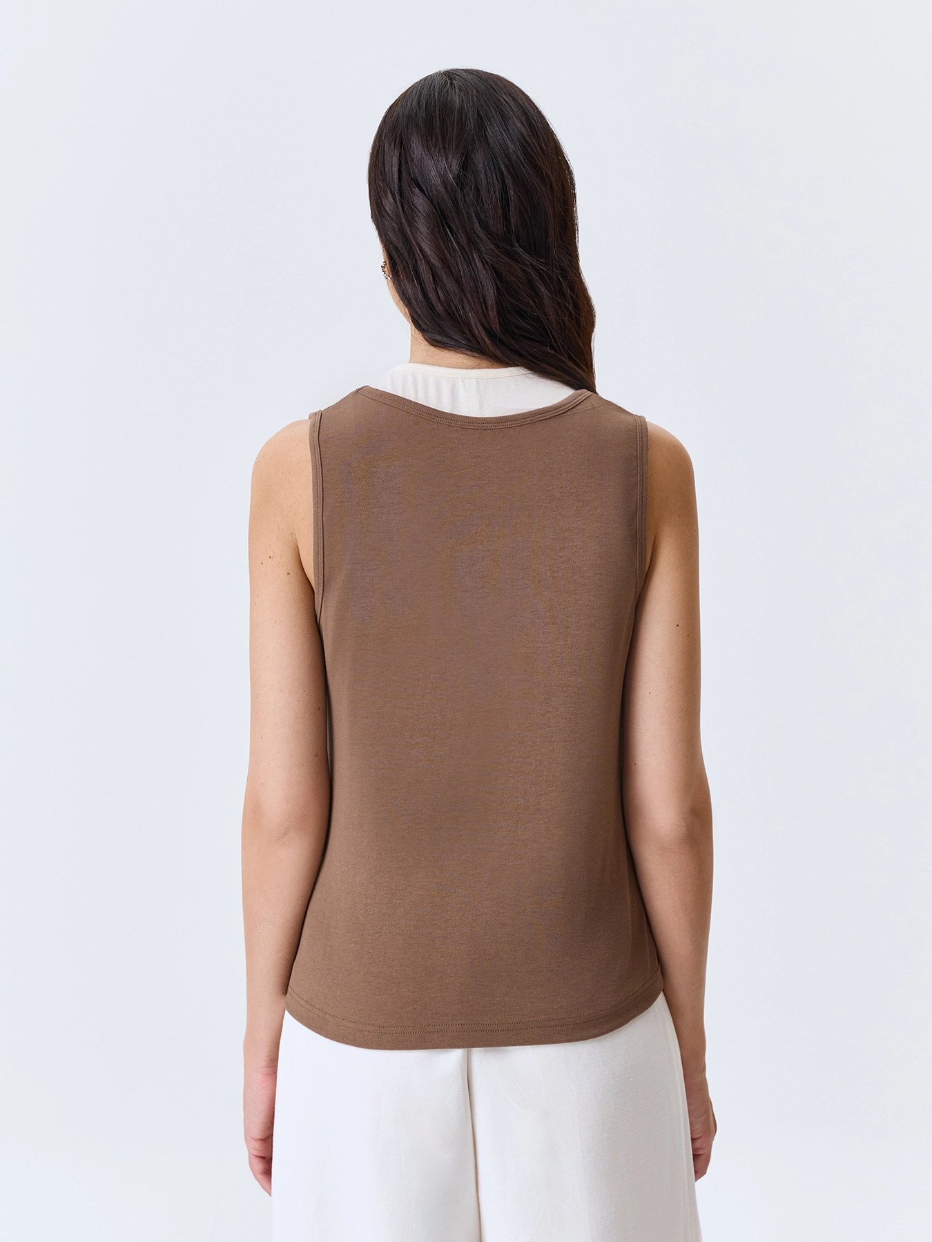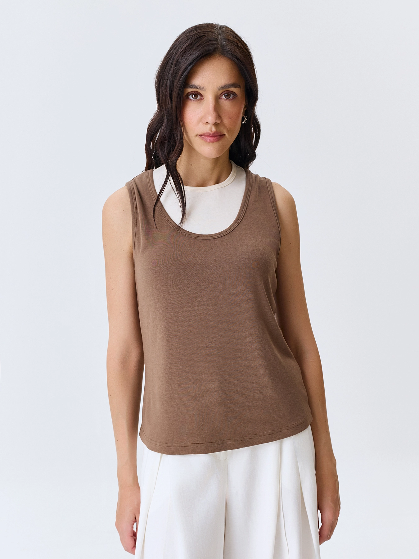Двойной хлопковый топ. Прямой силуэт. Круглый вырез. Широкие бретели. Дополнен деликатным металлическим декором. Два топа можно носить по отдельности.