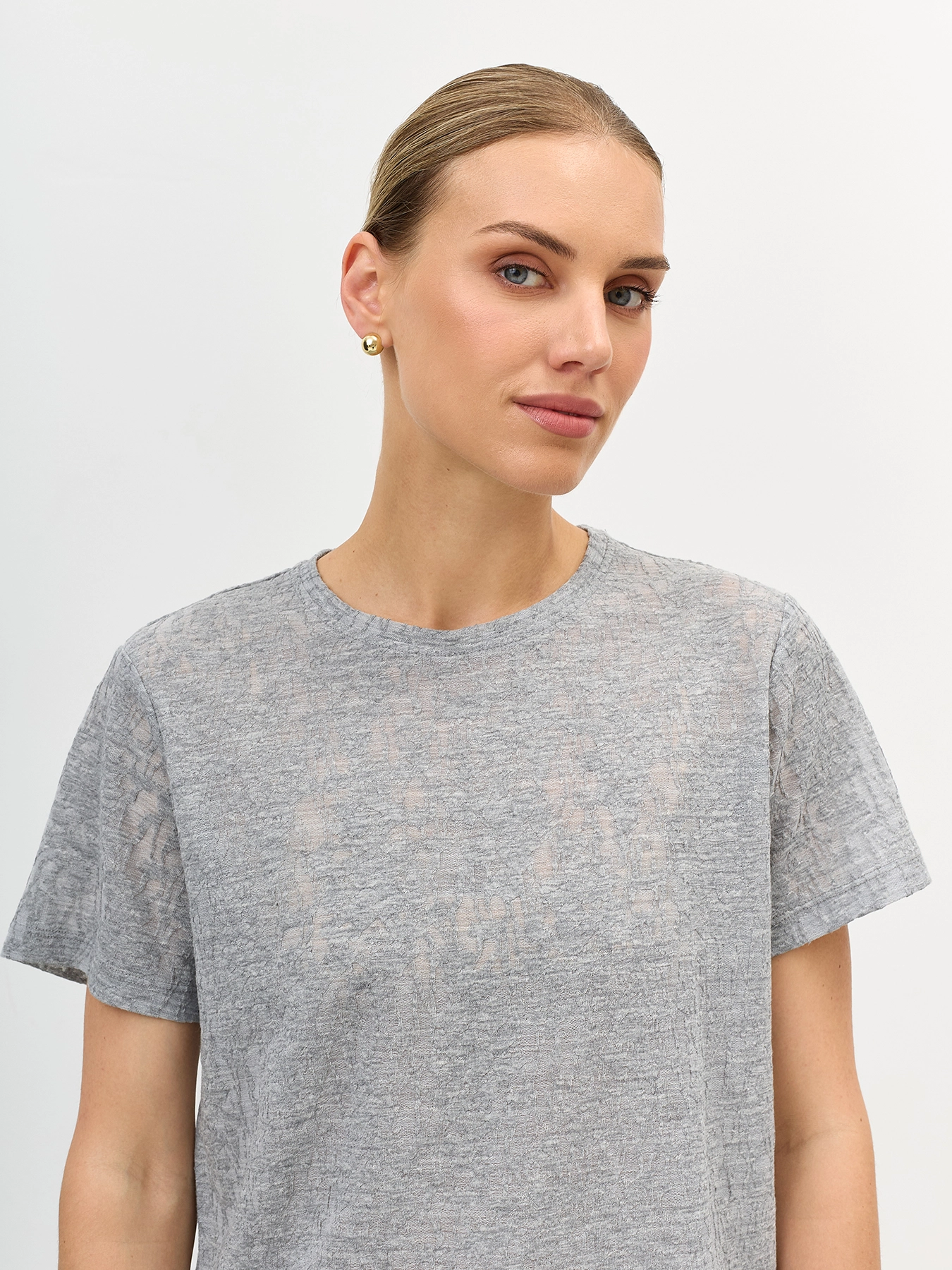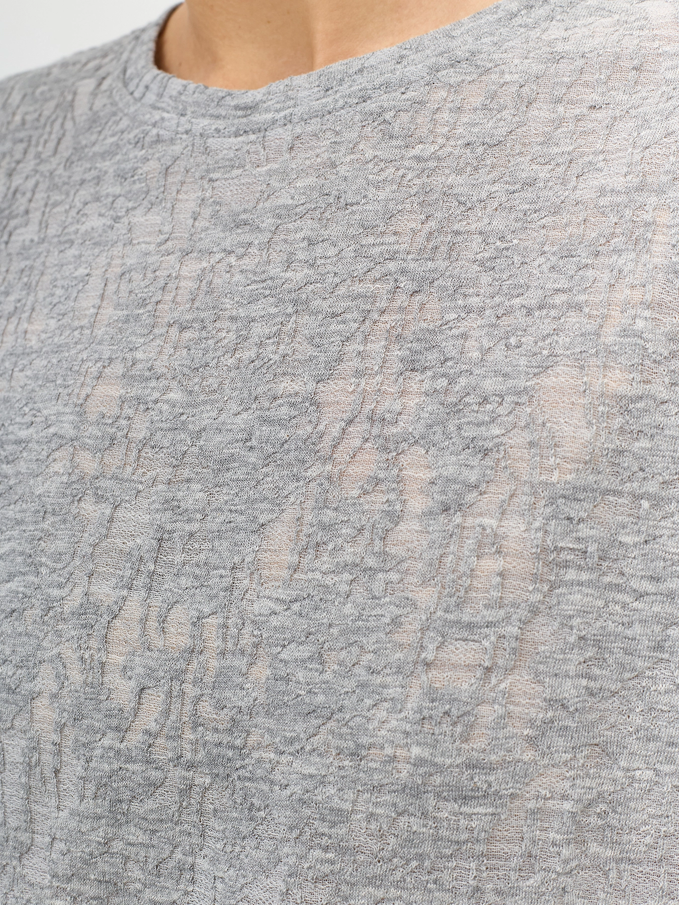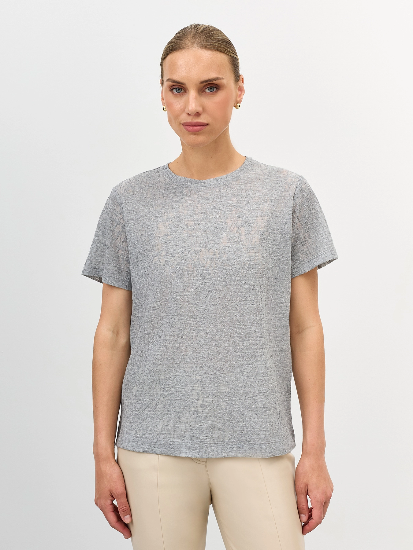 Футболка из ажурного фактурного трикотажа. Прямой силуэт. Круглый вырез. В составе хлопок, и вискоза.