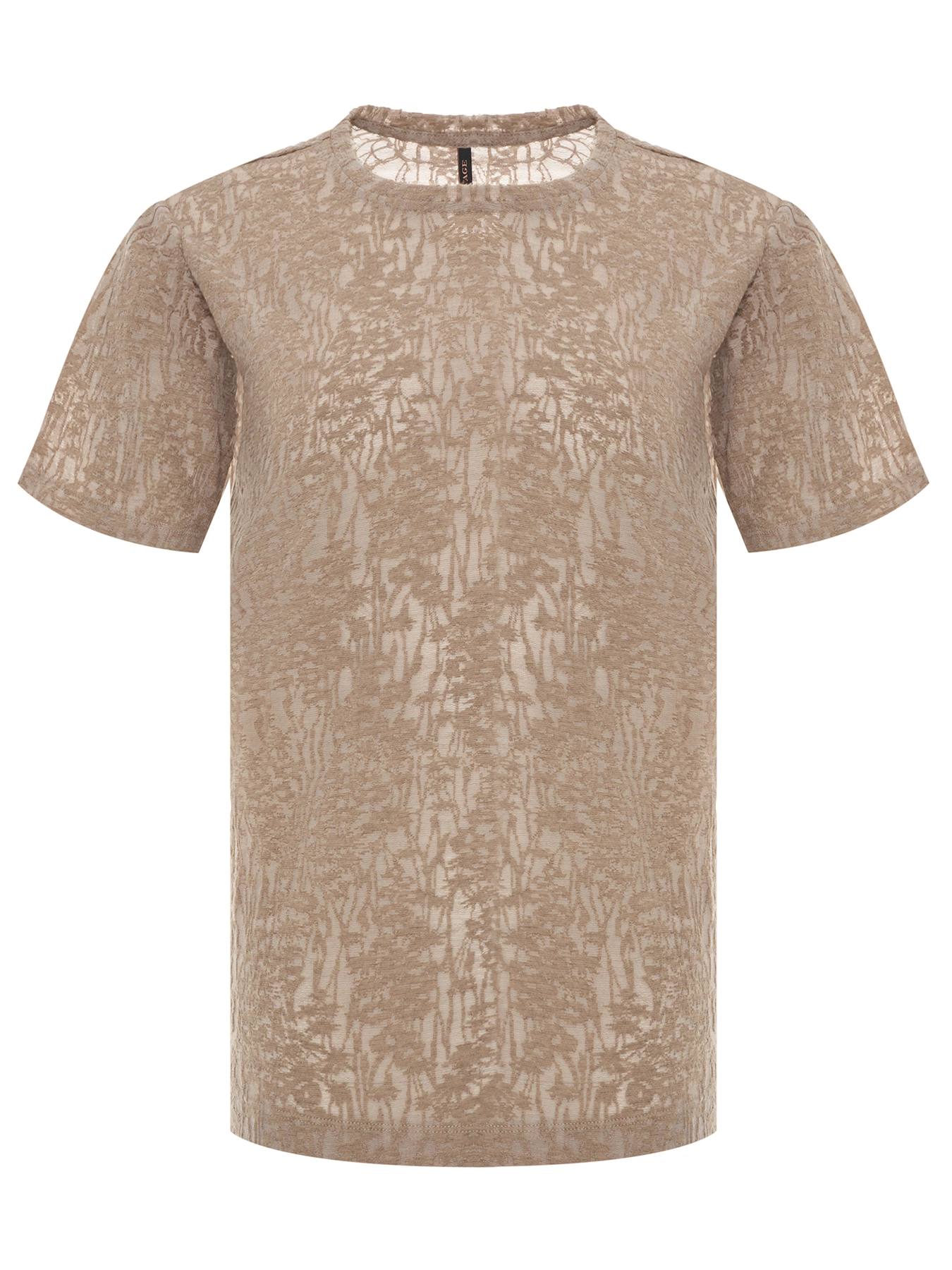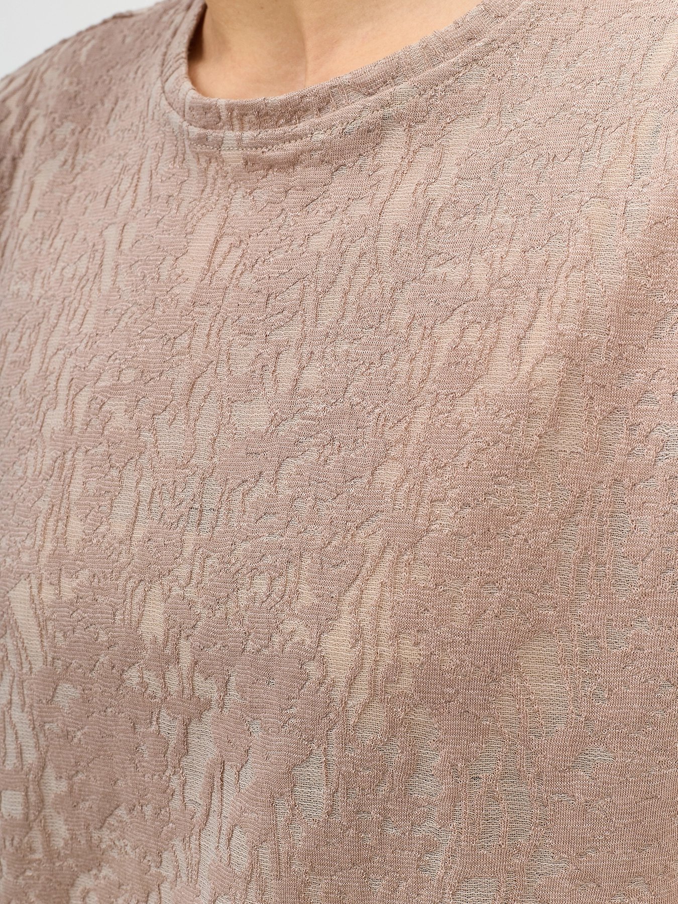 Футболка из ажурного фактурного трикотажа. Прямой силуэт. Круглый вырез. В составе хлопок, и вискоза.