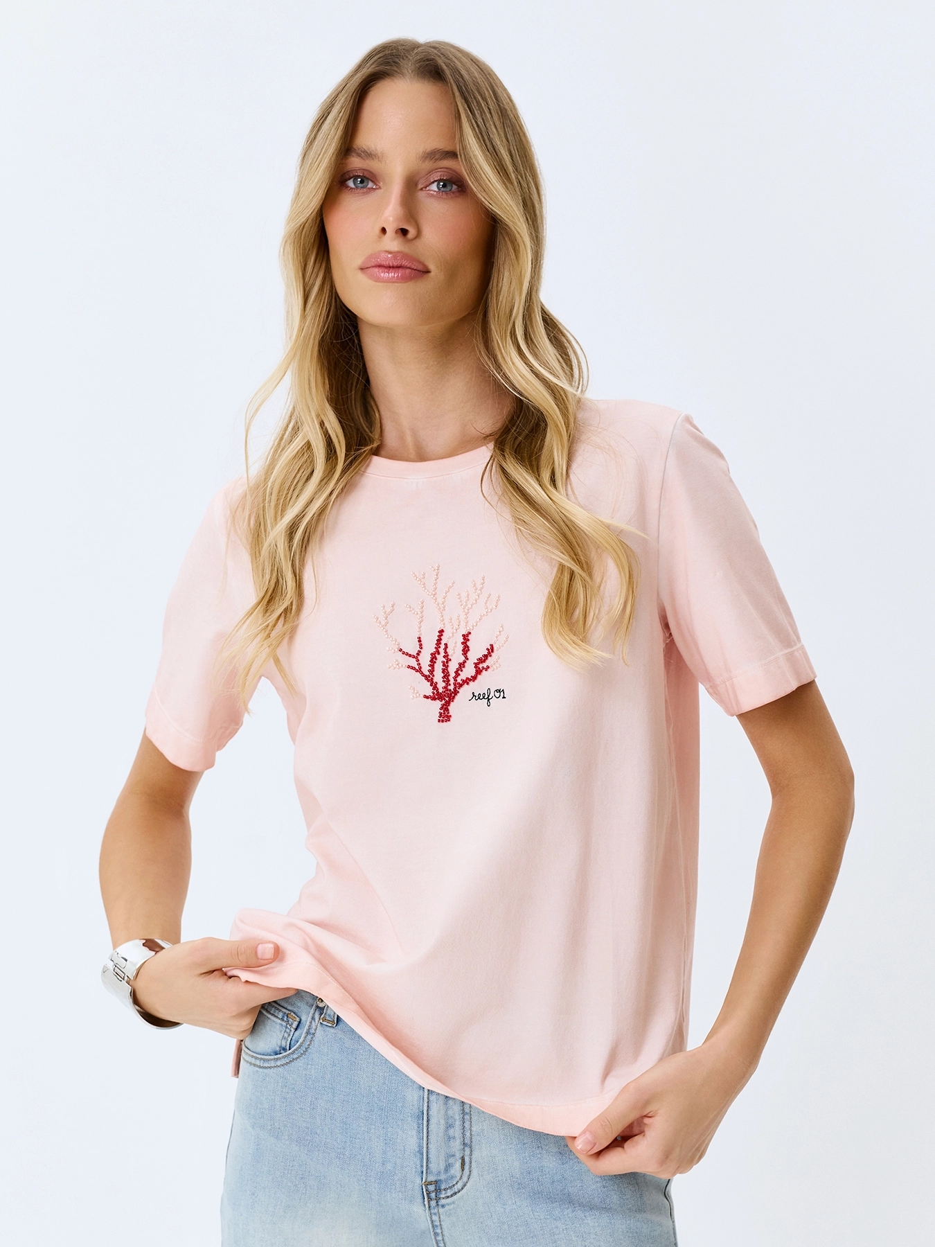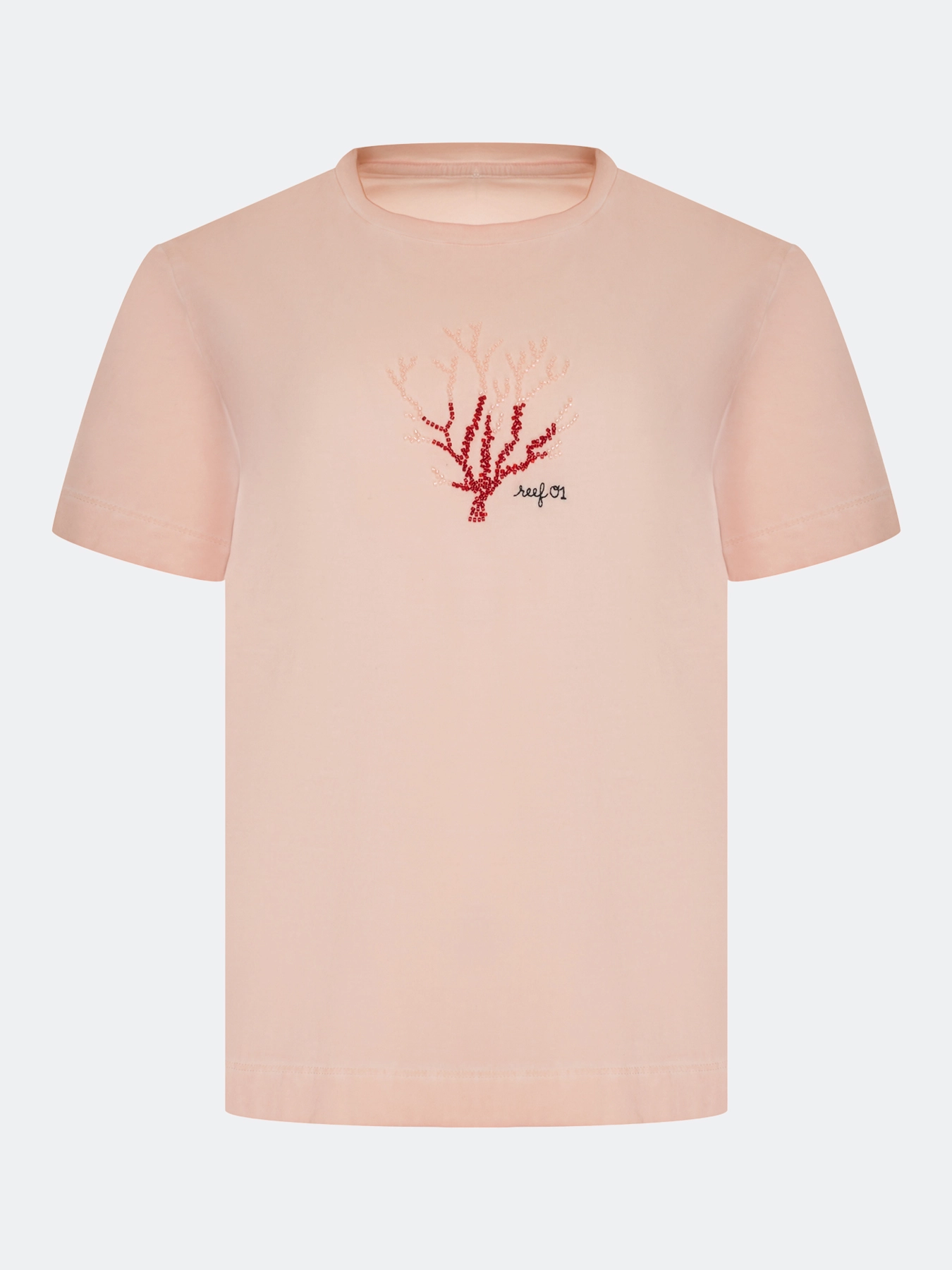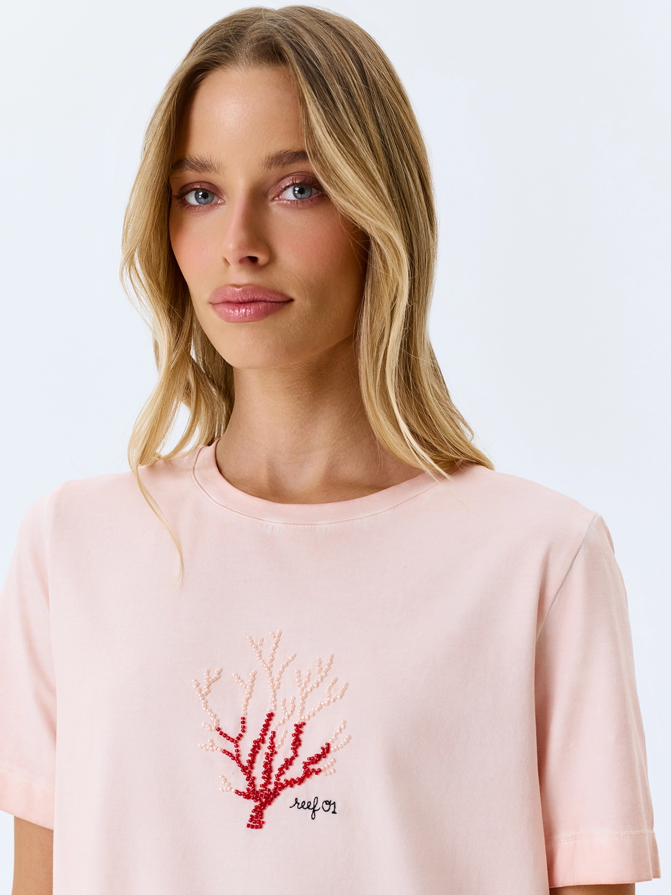 Футболка из 100% хлопка с яркой ручной вышивкой. Прямой силуэт. Круглый вырез. Короткие втачные рукава.