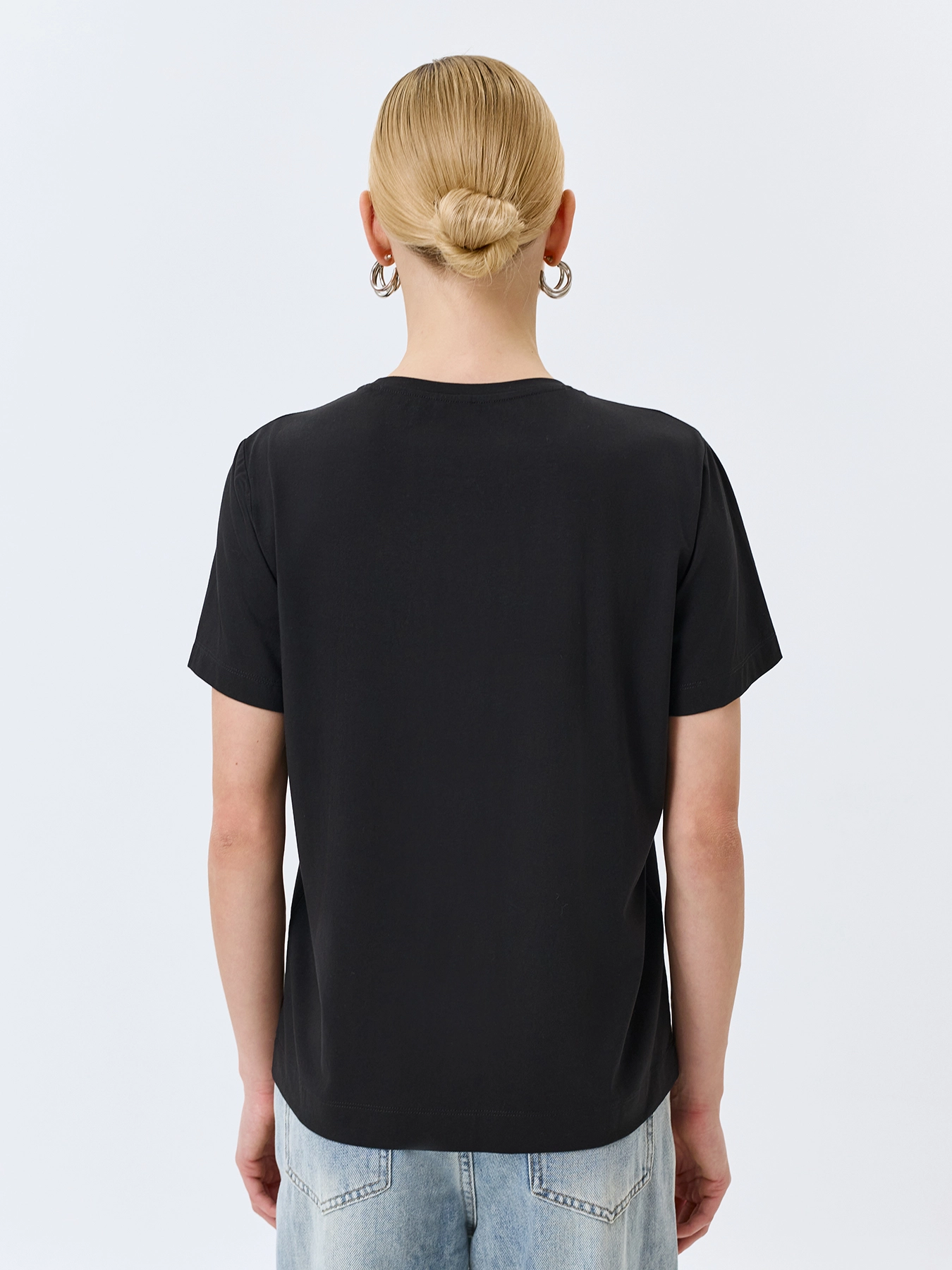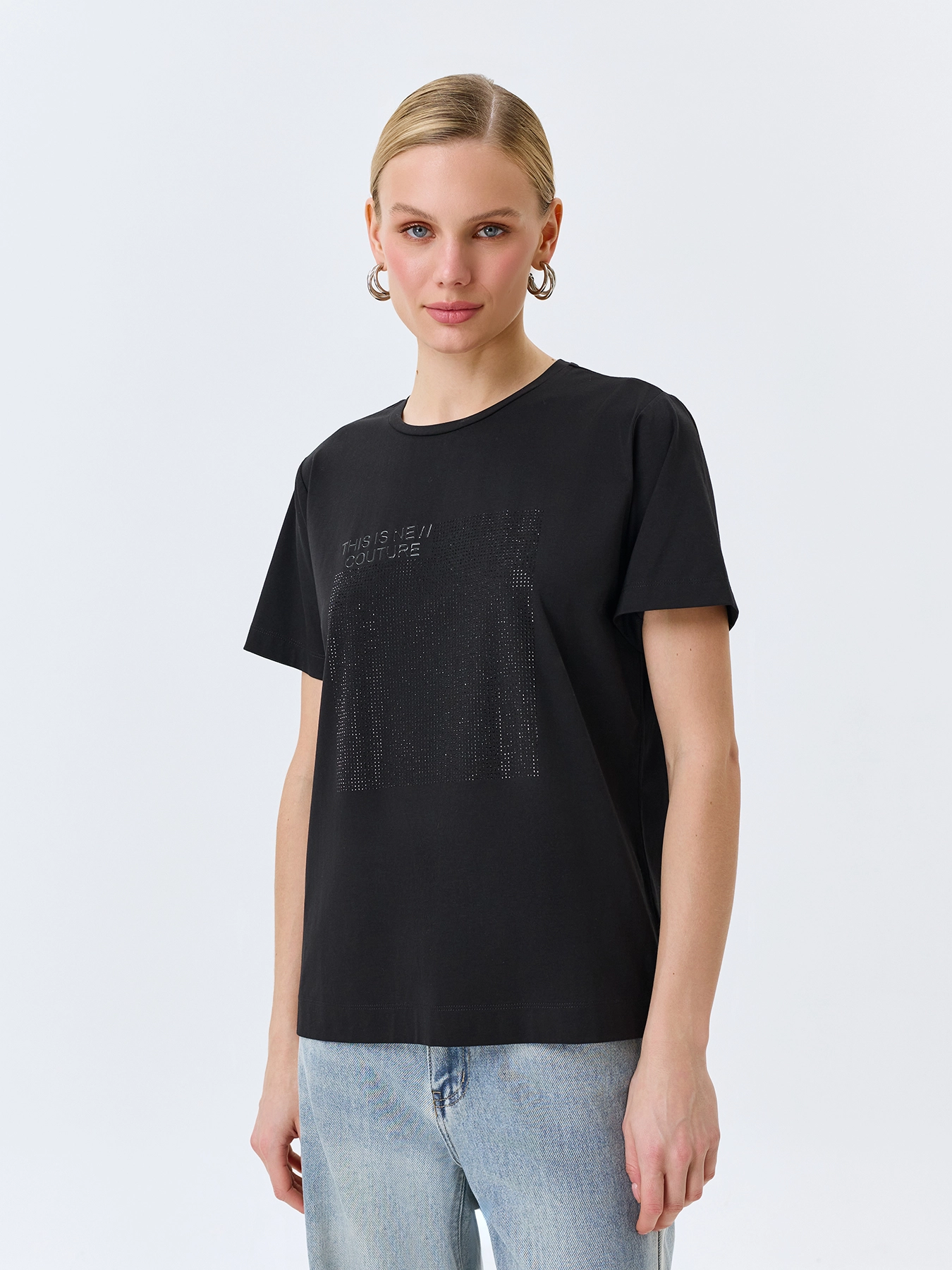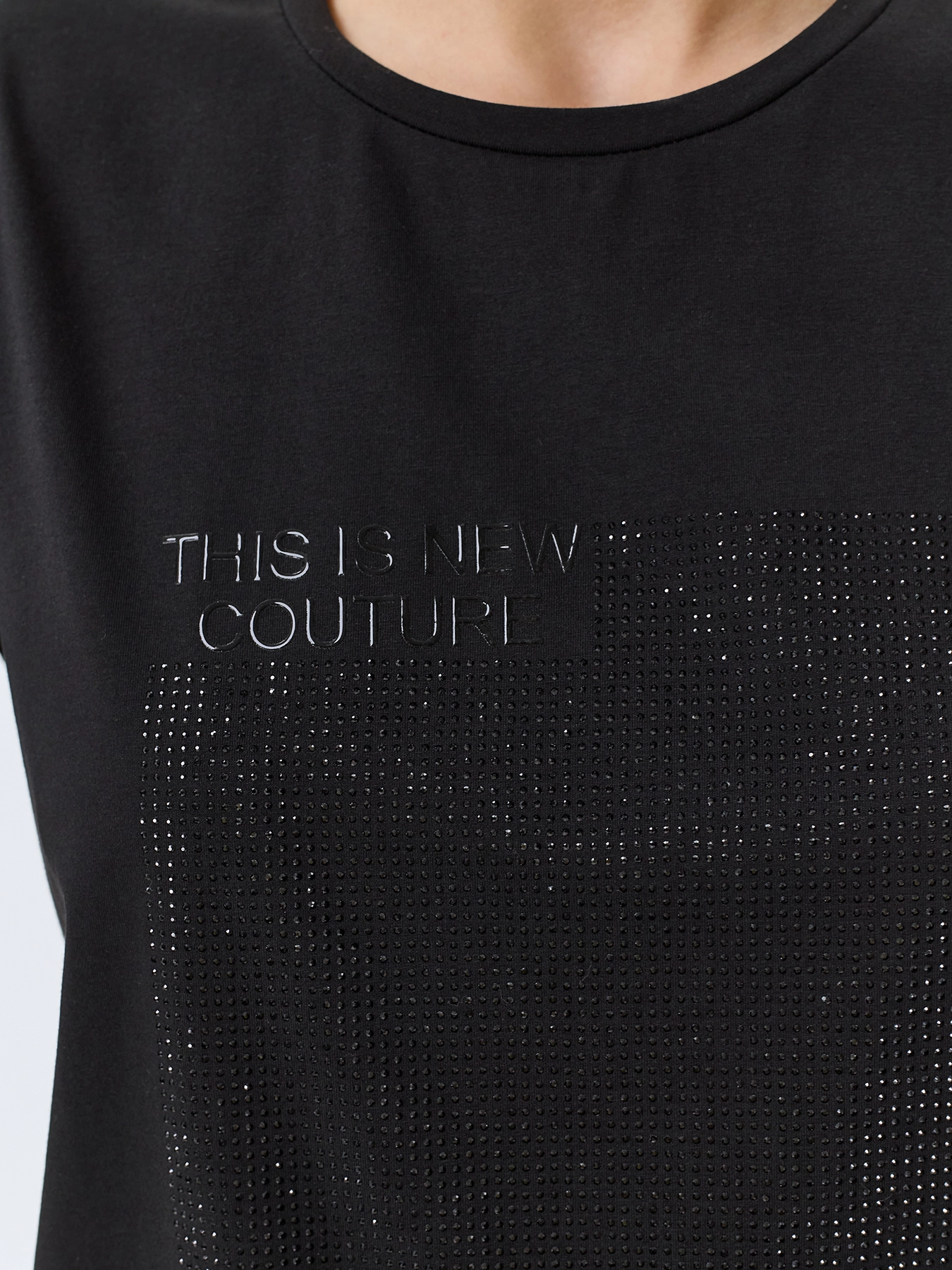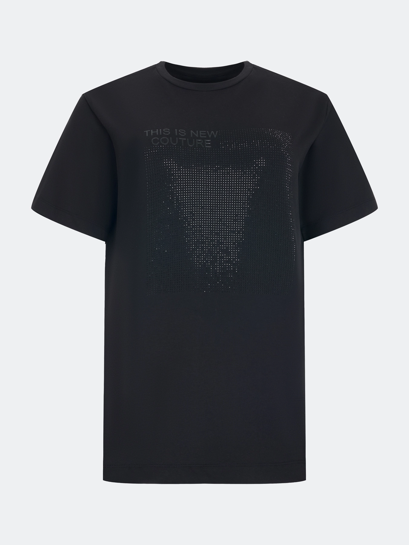 Футболка с искрящимися стразами. Прямой силуэт. Круглый вырез. Короткие рукава. В составе хлопок и модал.