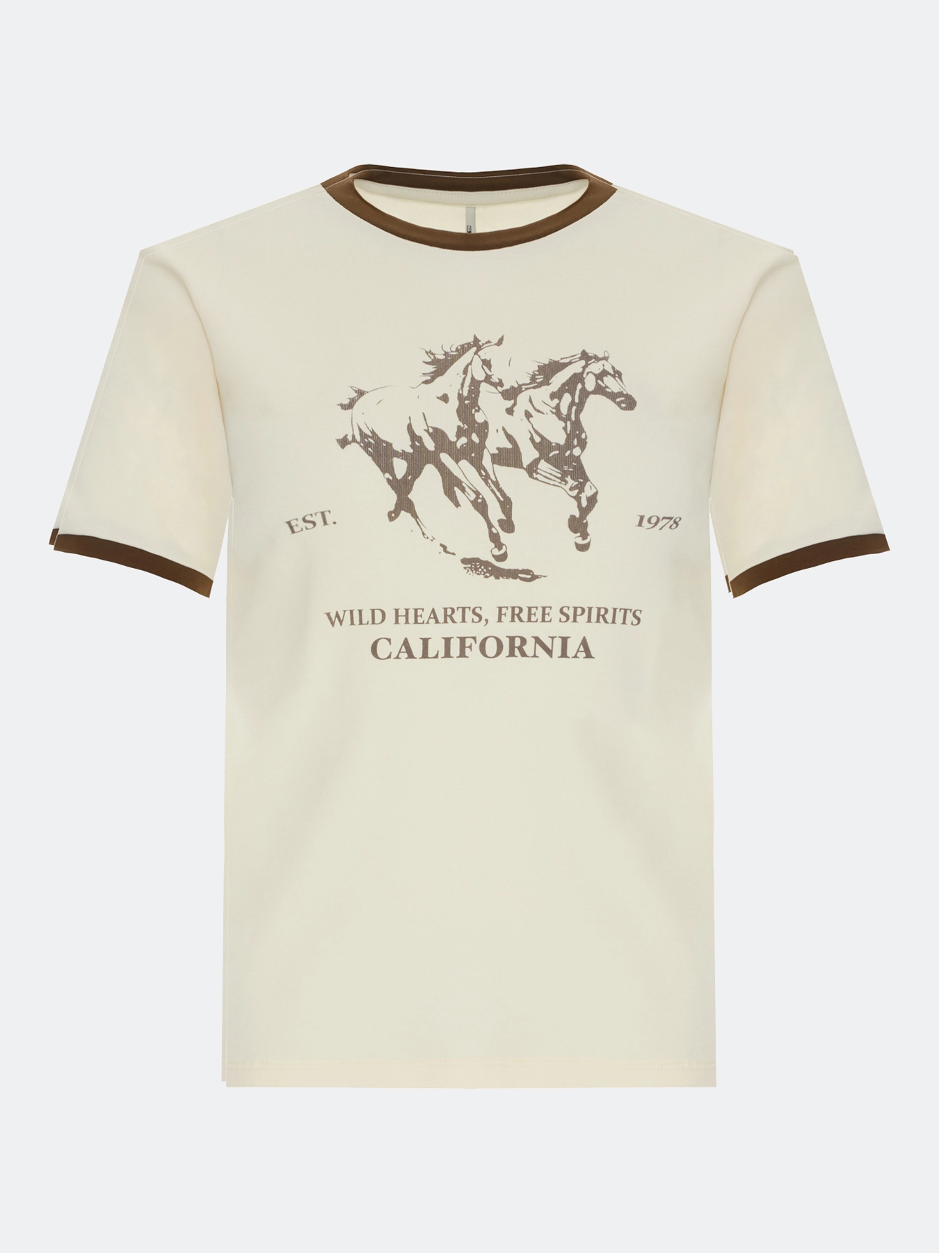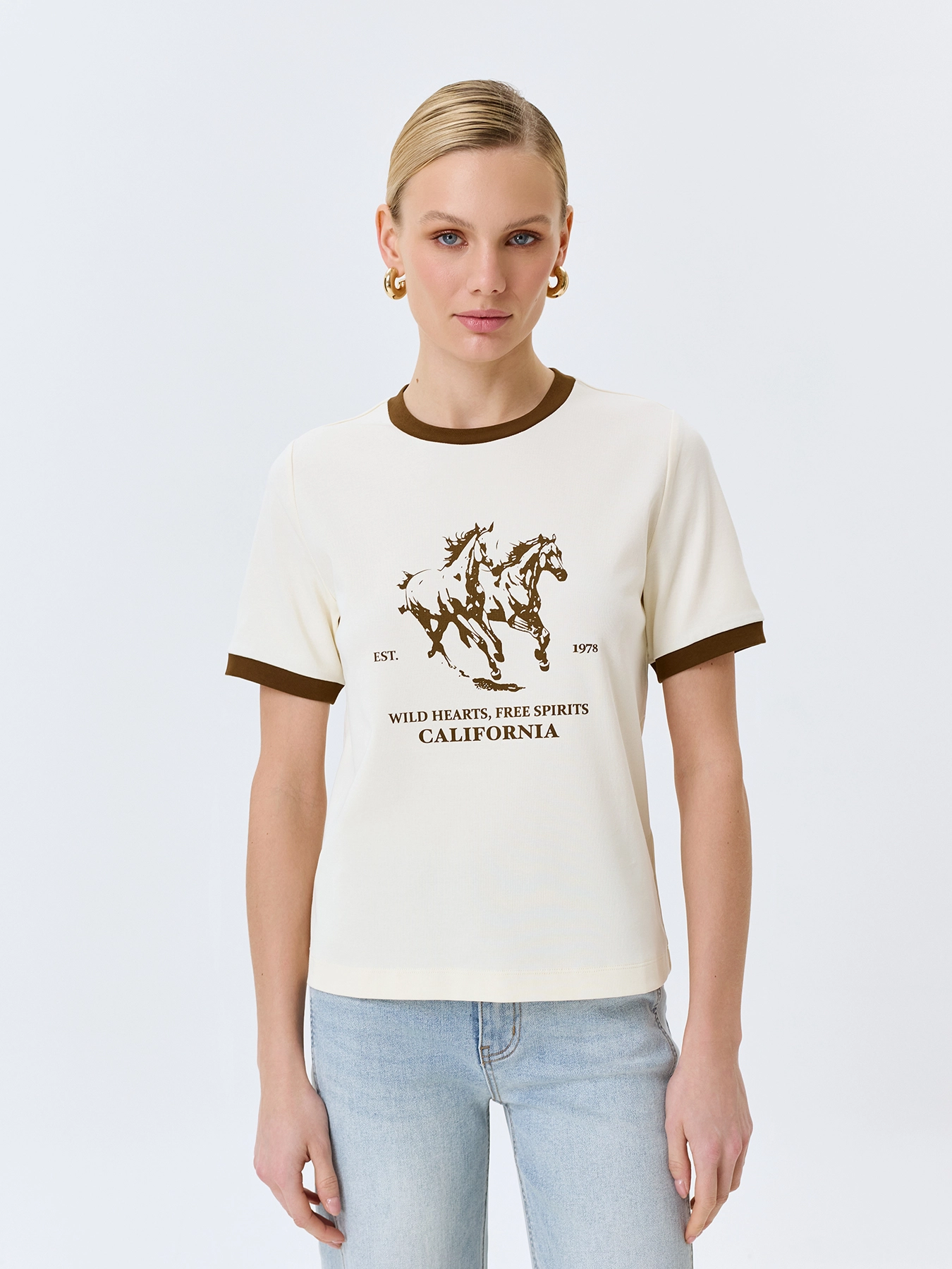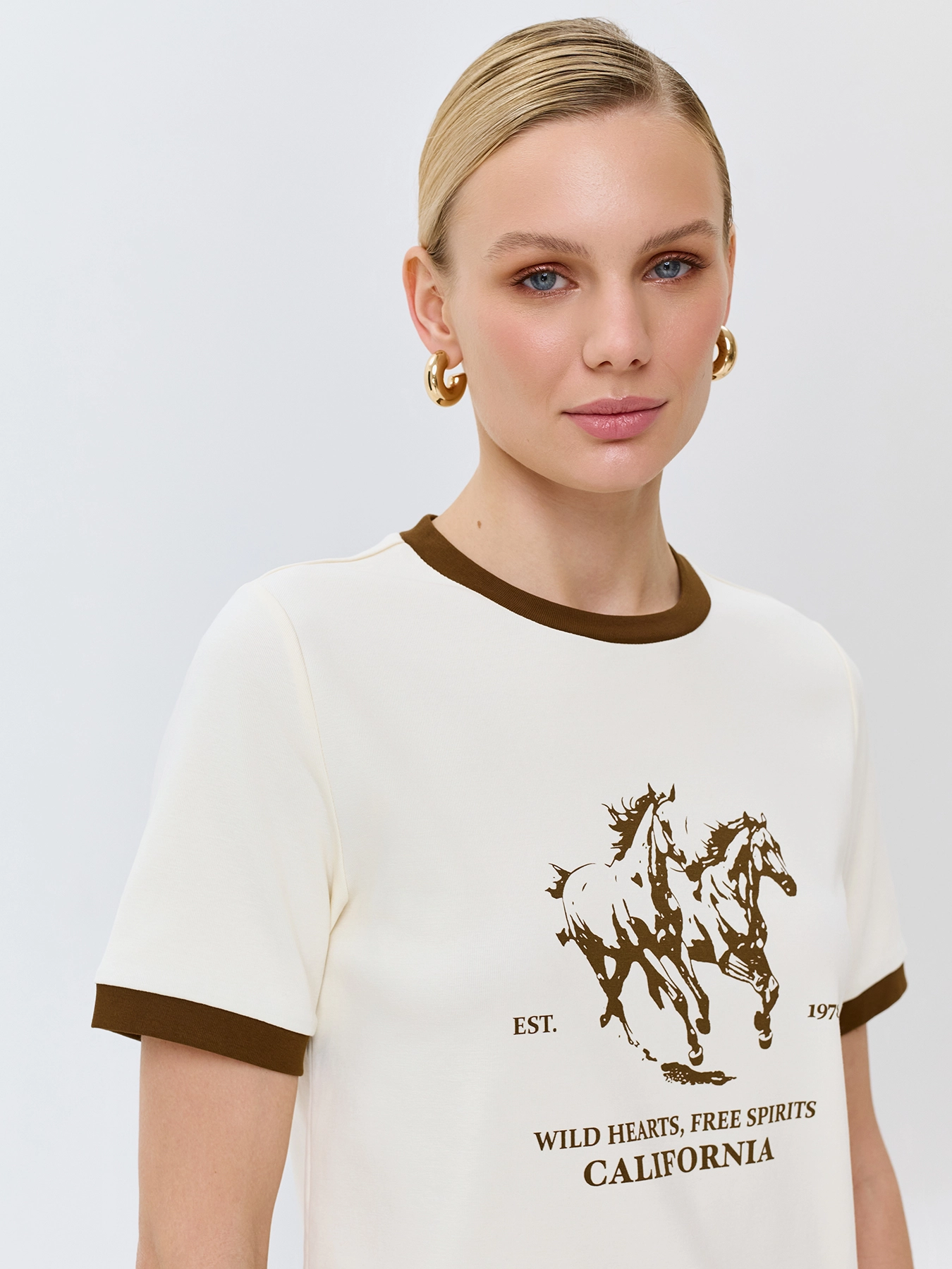 Футболка прямого силуэта. Круглый вырез горловины, дополнен контрастным рибом. Короткие втачные рукава с контрастной отделкой. Спереди крупный принт в стиле ретро. В составе хлопок.