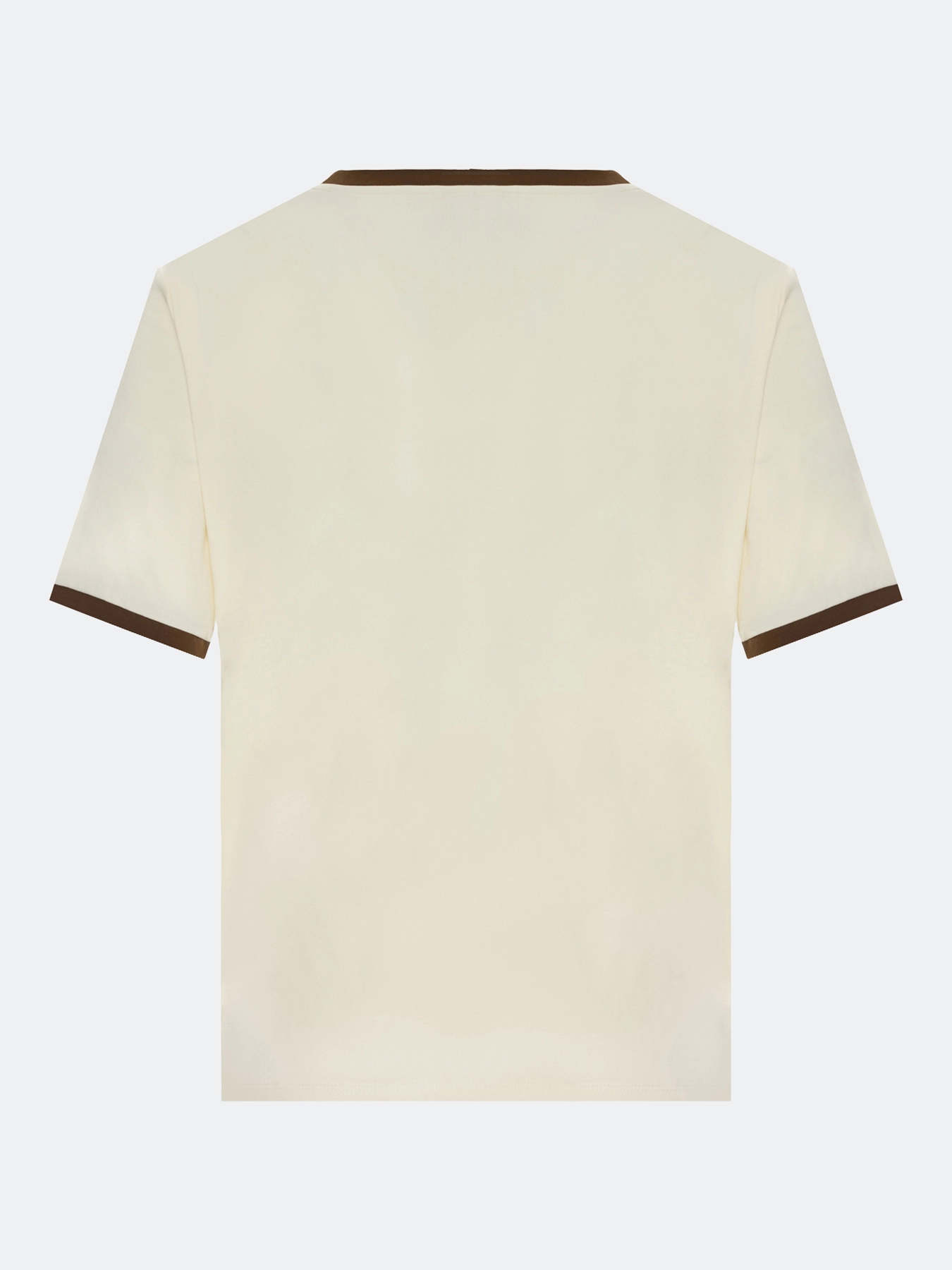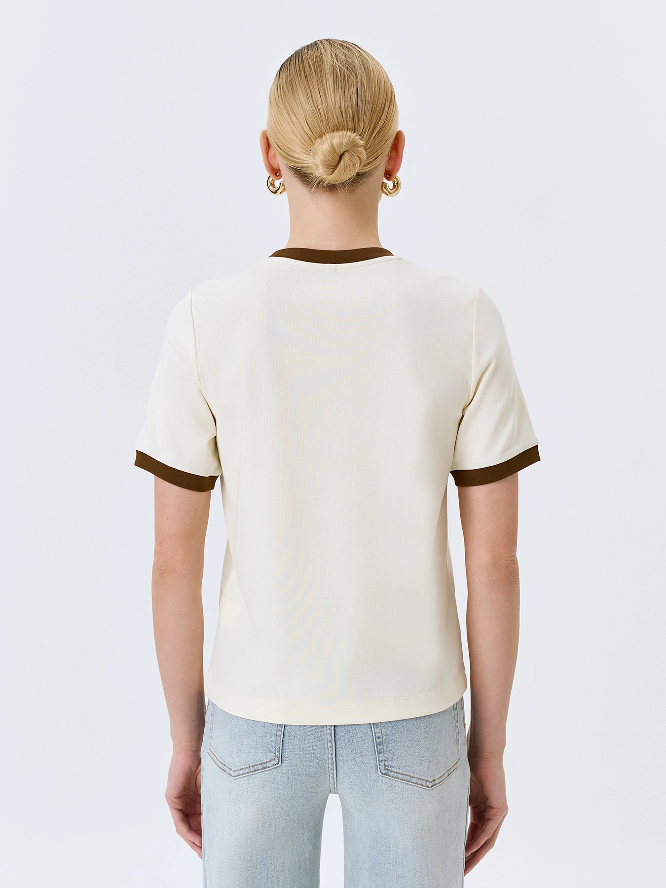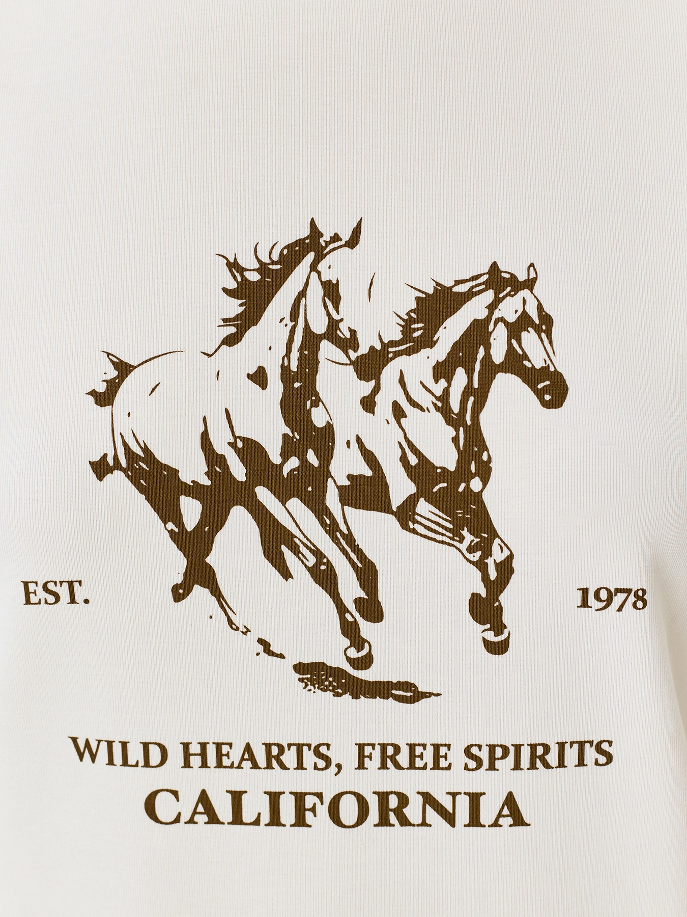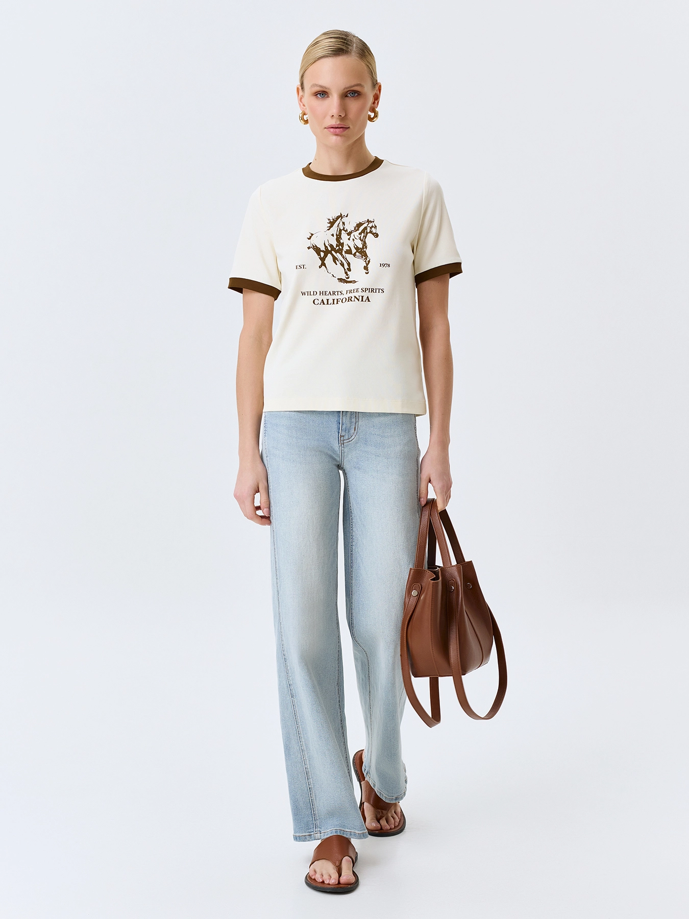 Футболка прямого силуэта. Круглый вырез горловины, дополнен контрастным рибом. Короткие втачные рукава с контрастной отделкой. Спереди крупный принт в стиле ретро. В составе хлопок.