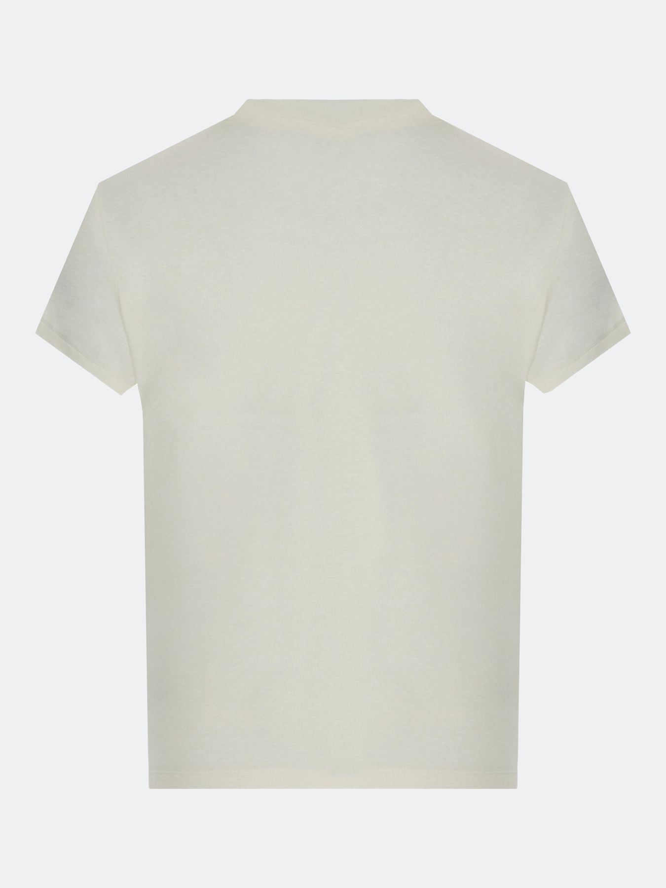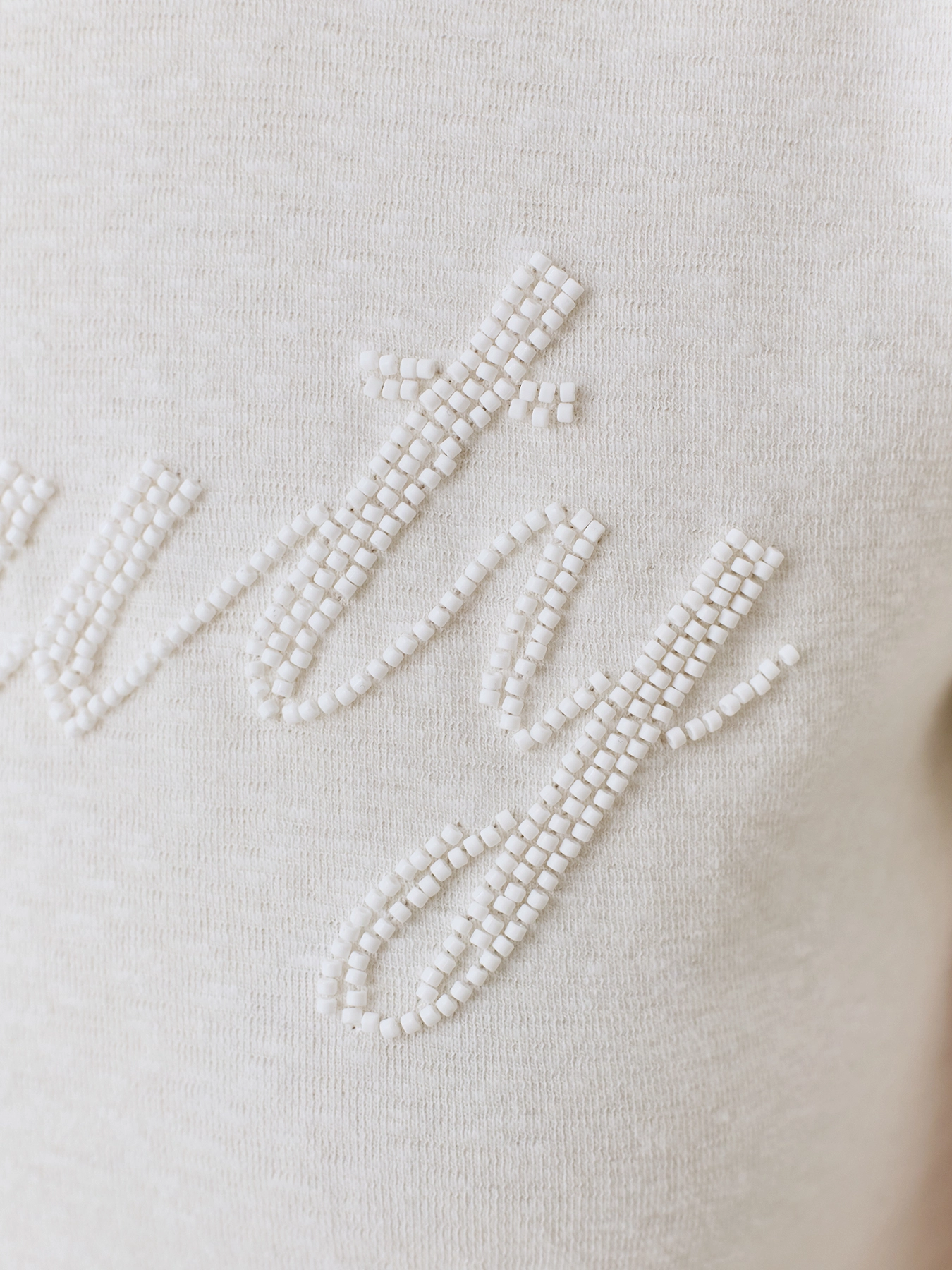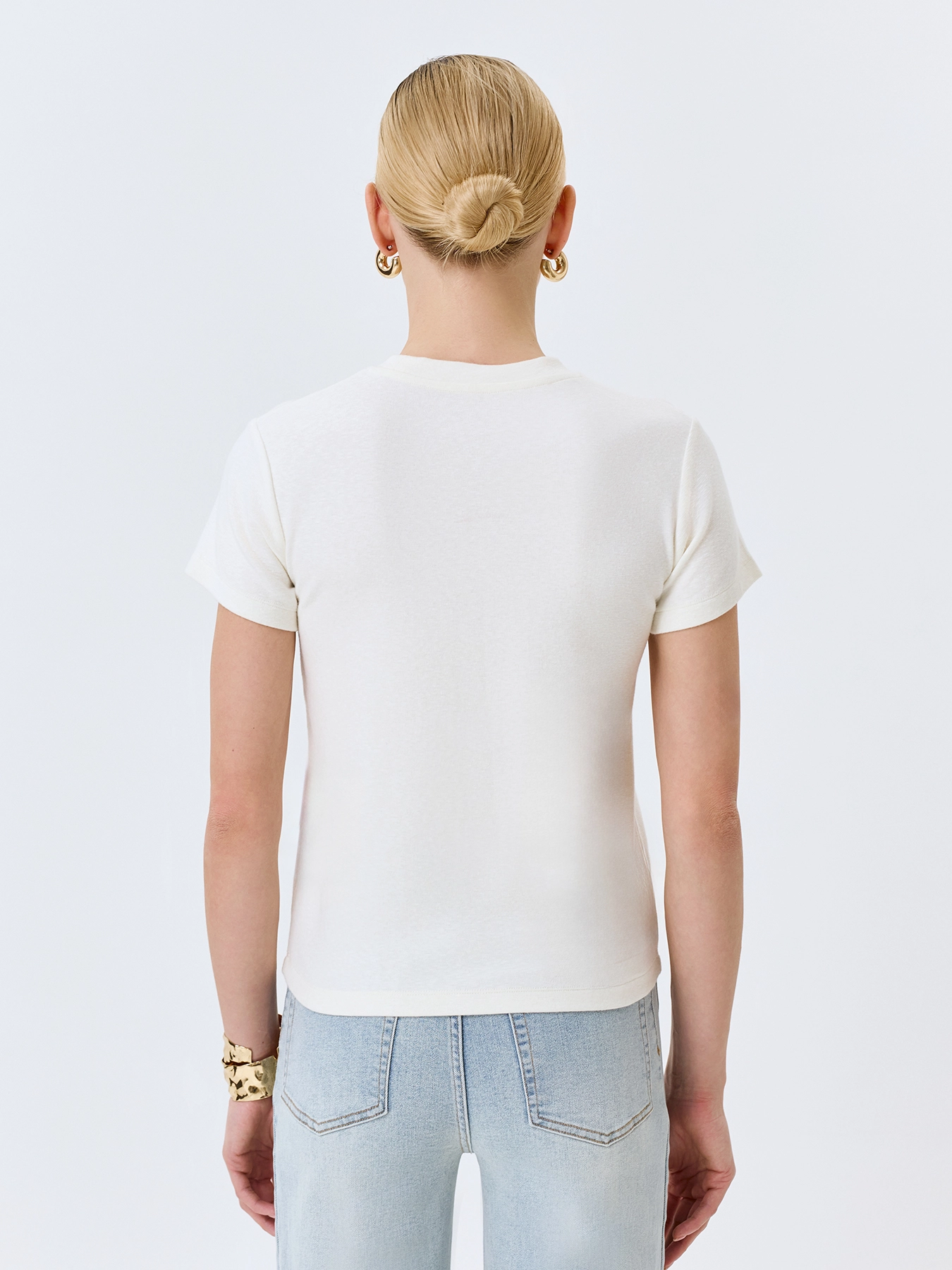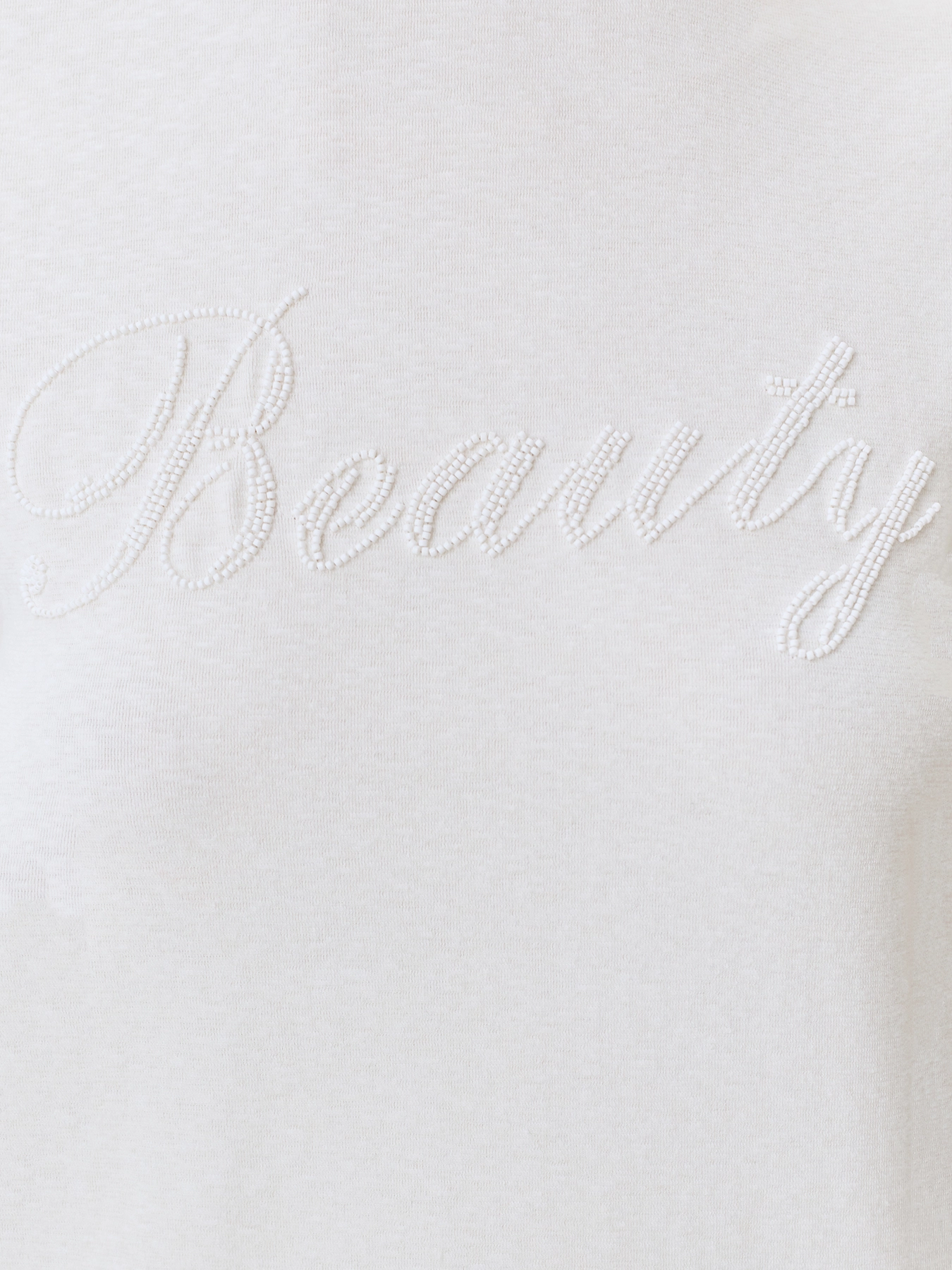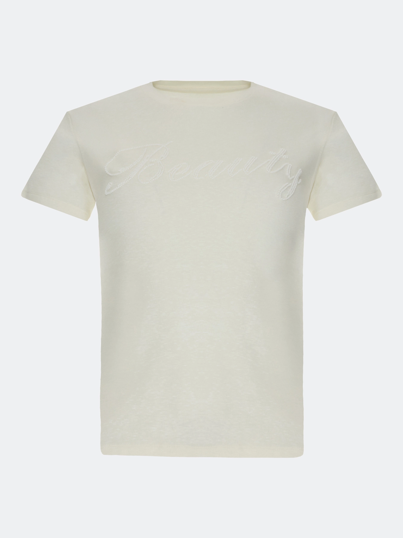 Фактурная футболка с акцентной вышивкой бисером. Полуприлегающий силуэт. Круглый вырез. Короткие втачные рукава. В составе хлопок и вискоза.