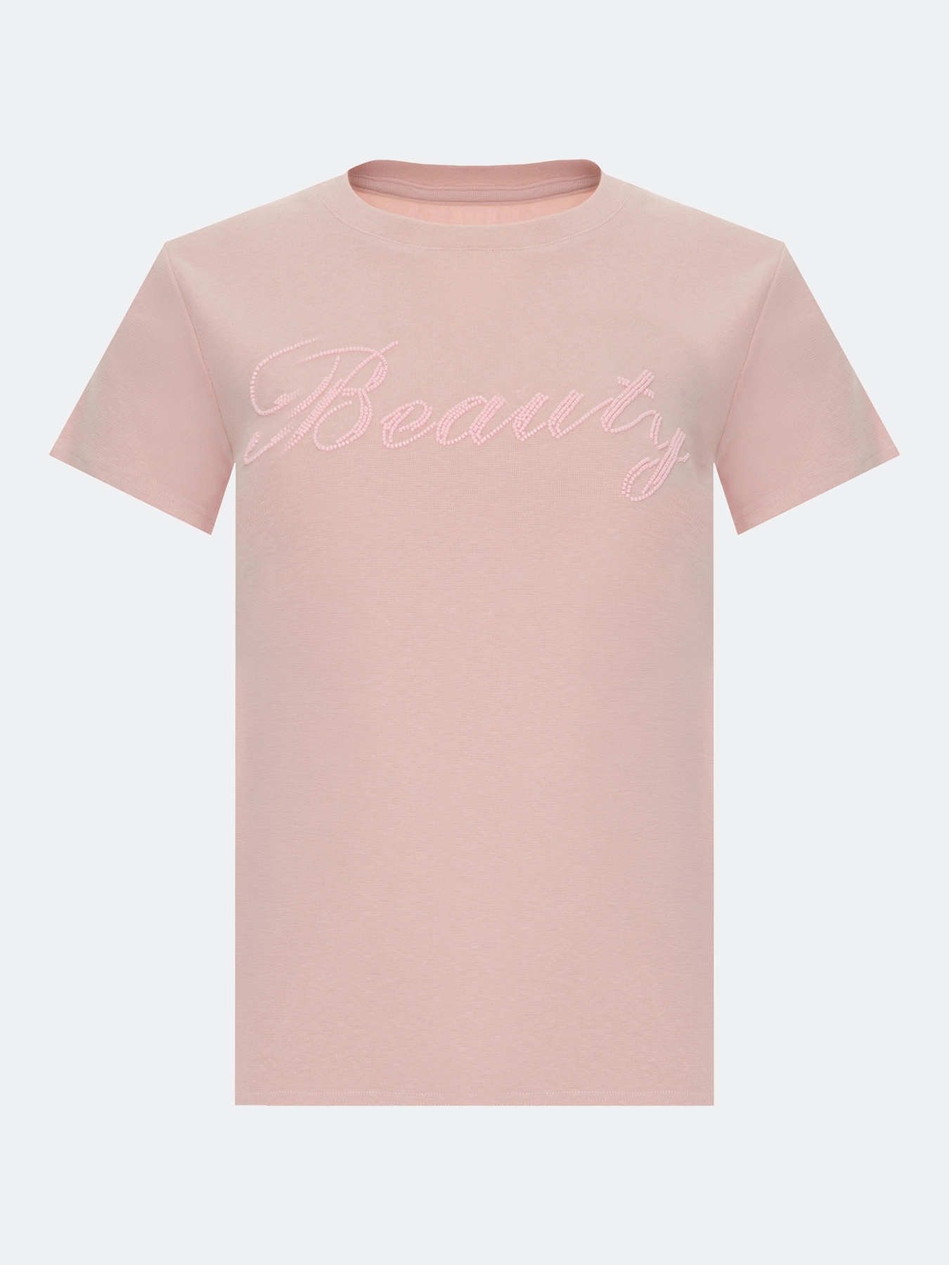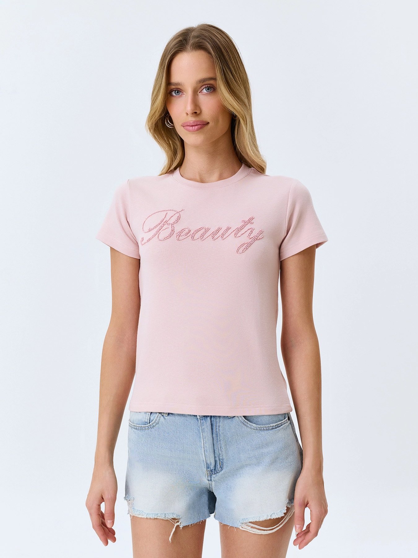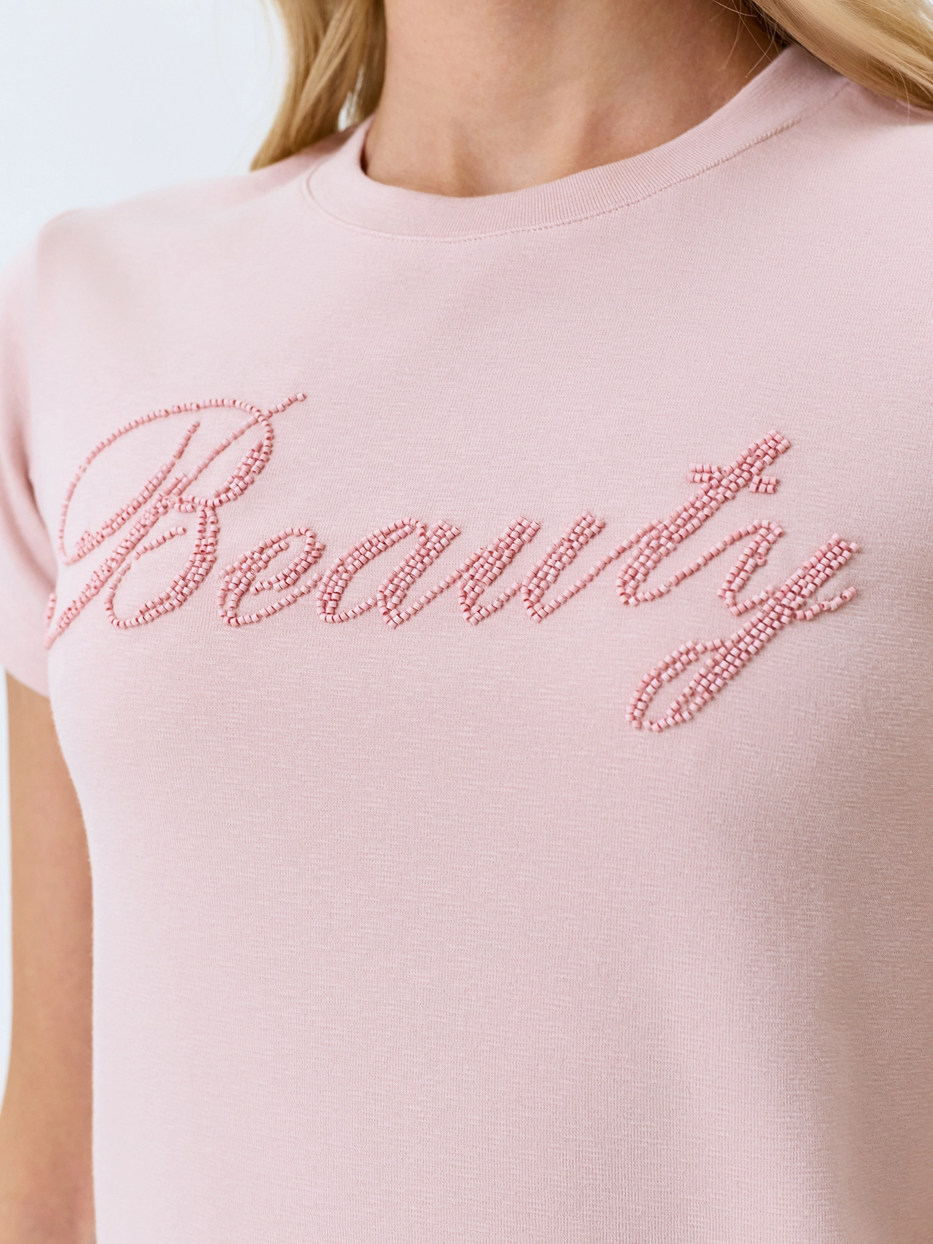 Фактурная футболка с акцентной вышивкой бисером. Полуприлегающий силуэт. Круглый вырез. Короткие втачные рукава. В составе хлопок и вискоза.
