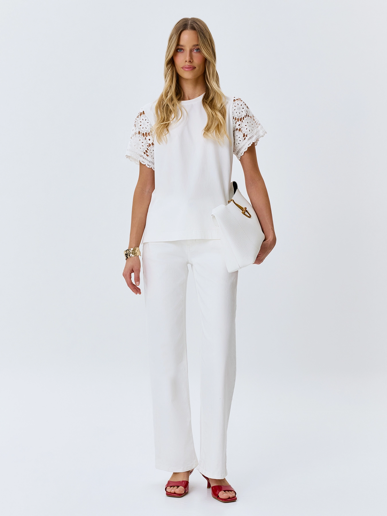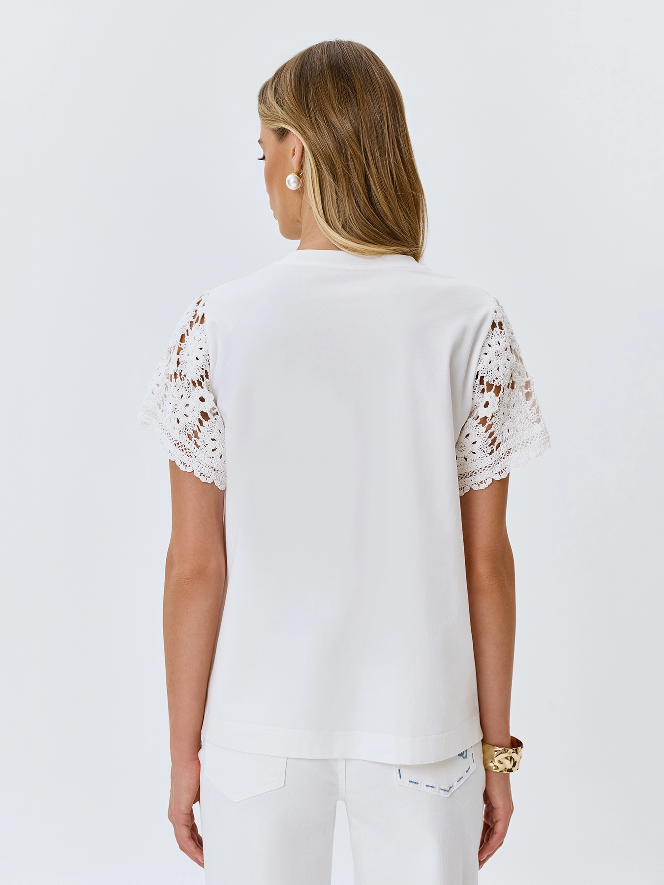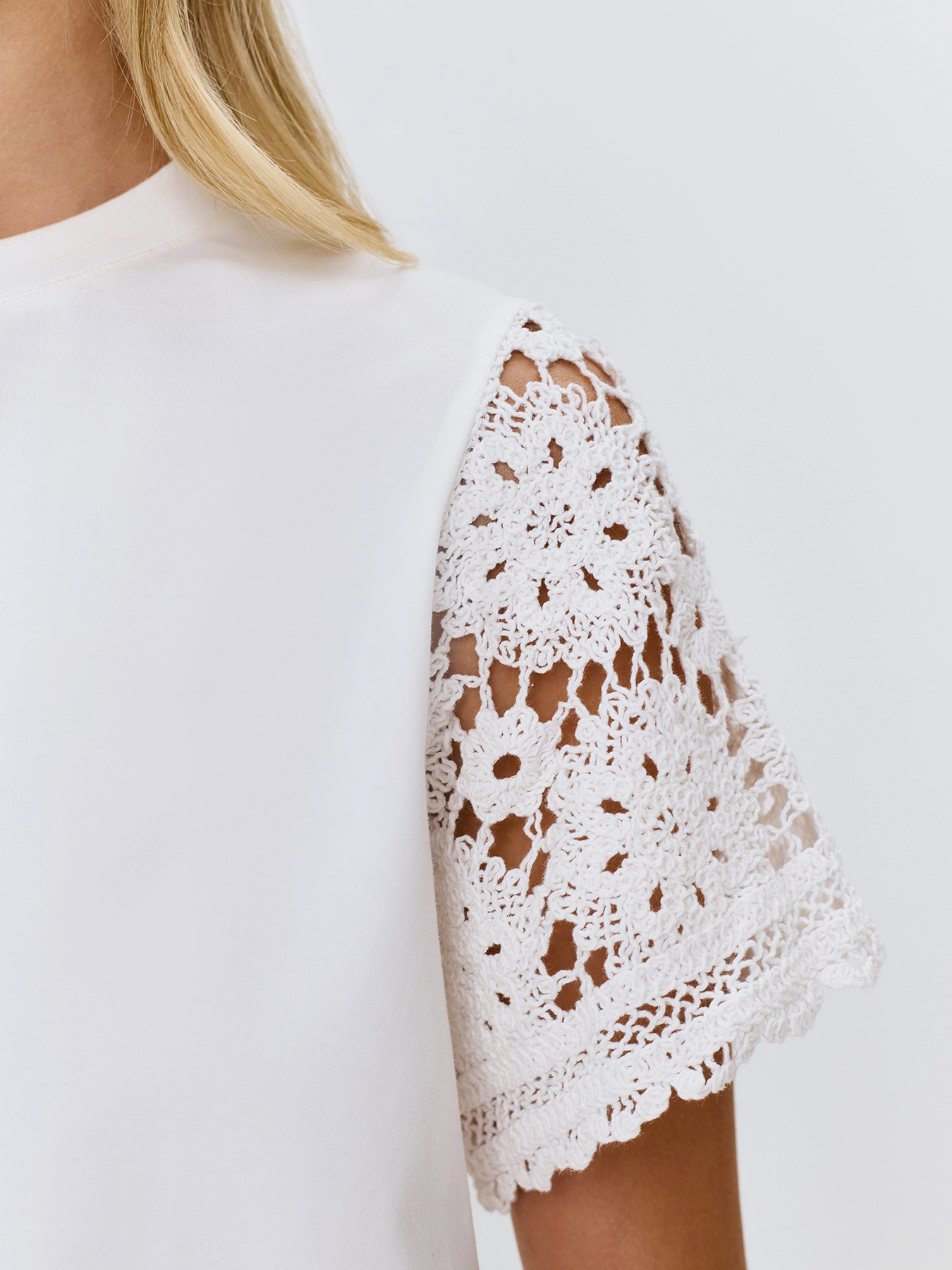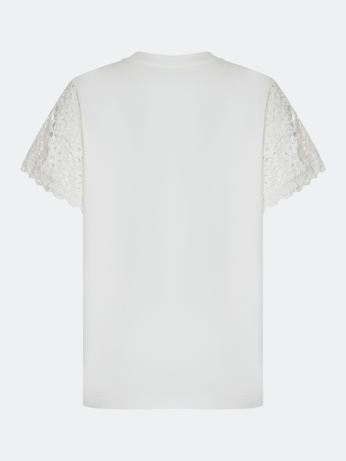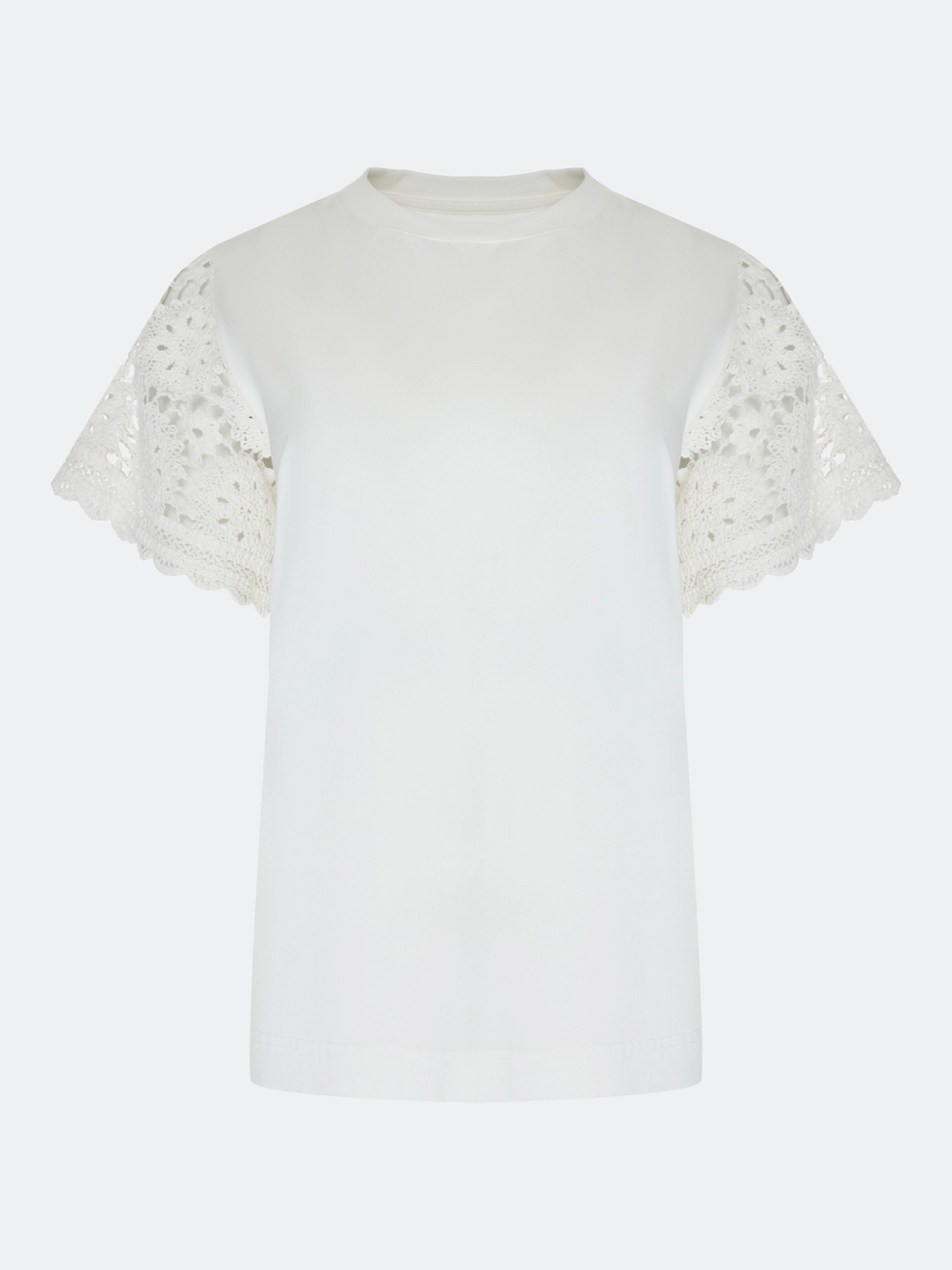 Хлопковая футболка с ажурными рукавами из натурального кружева. Прямой силуэт. Круглый вырез.
