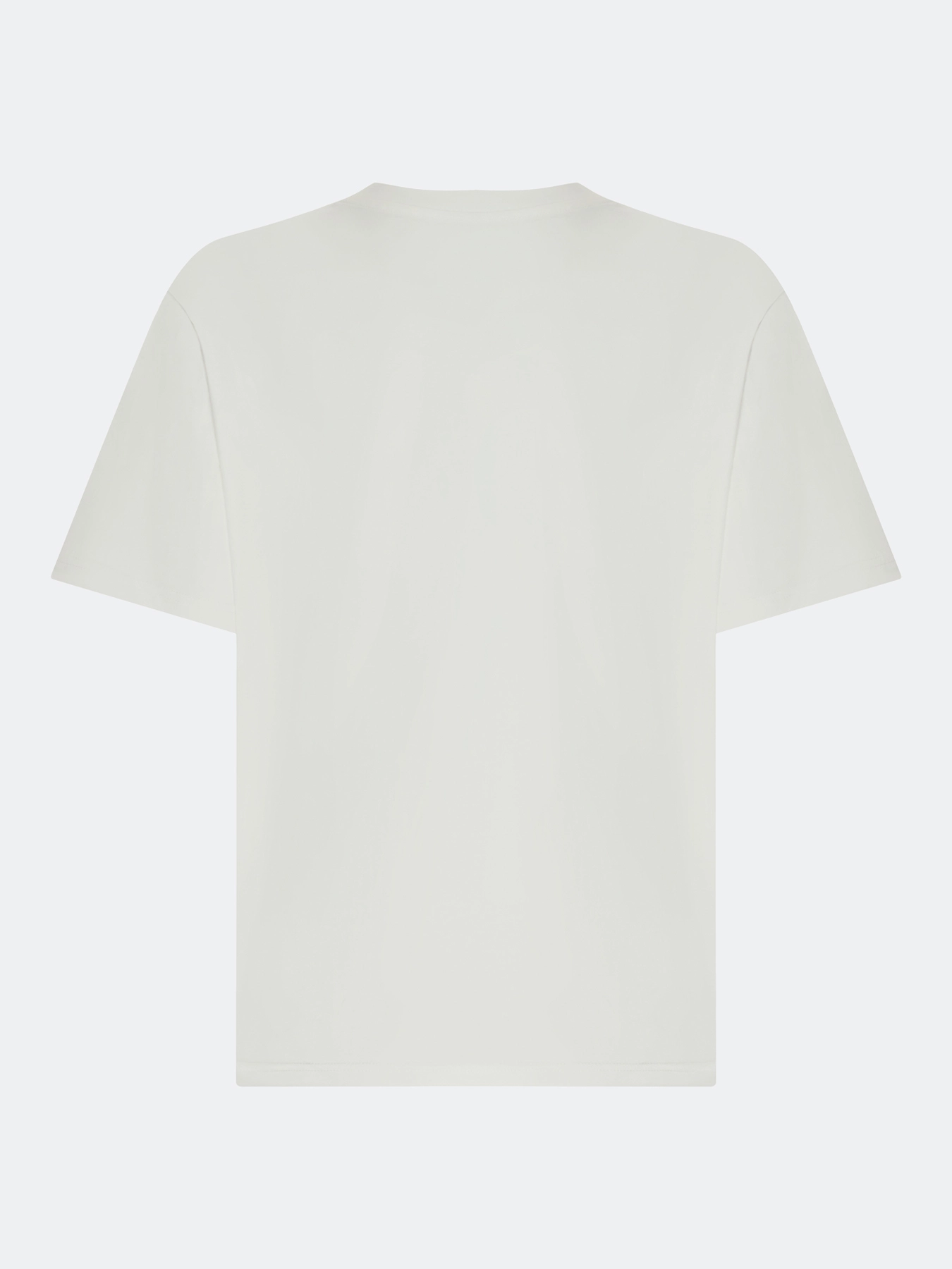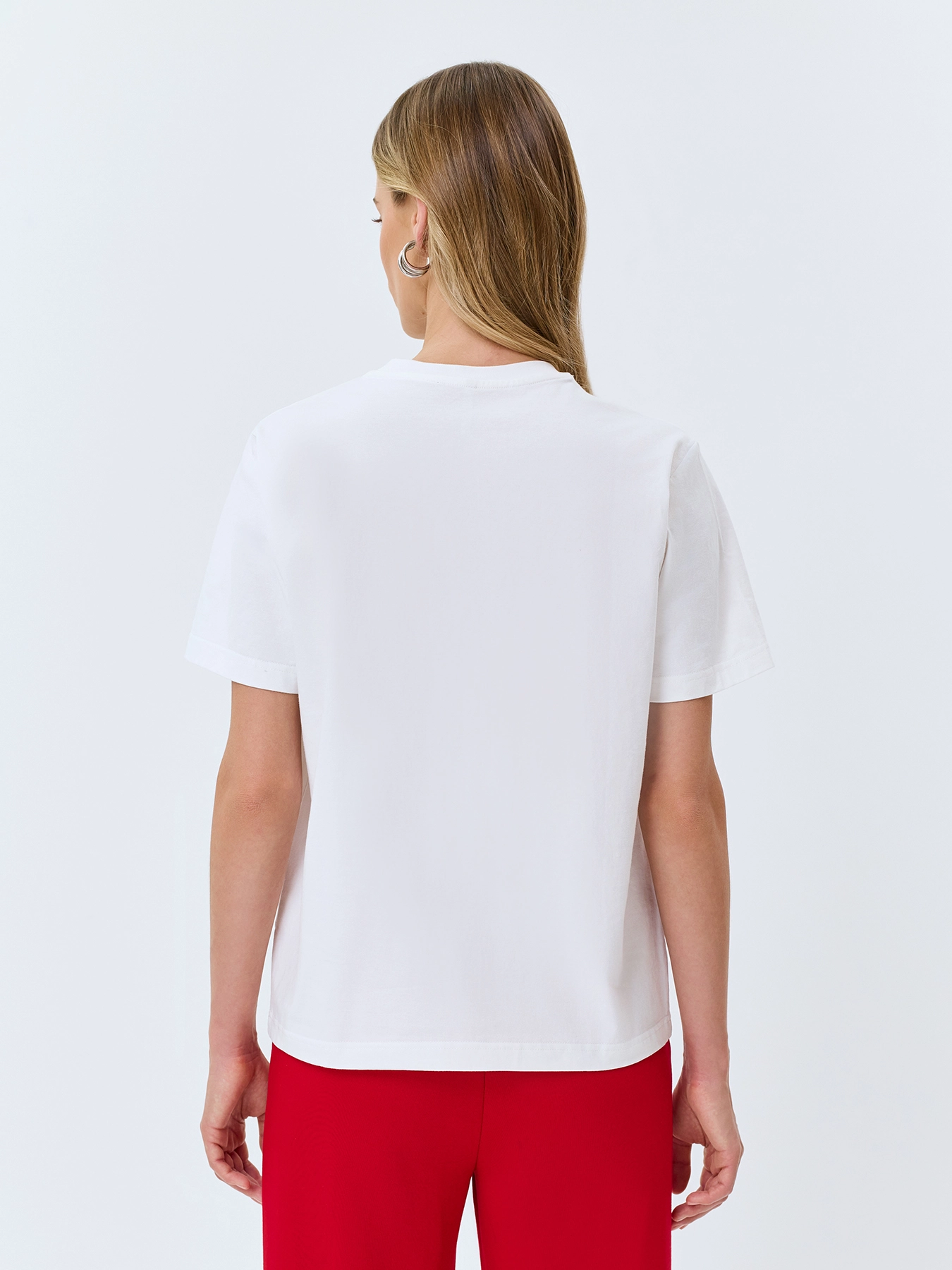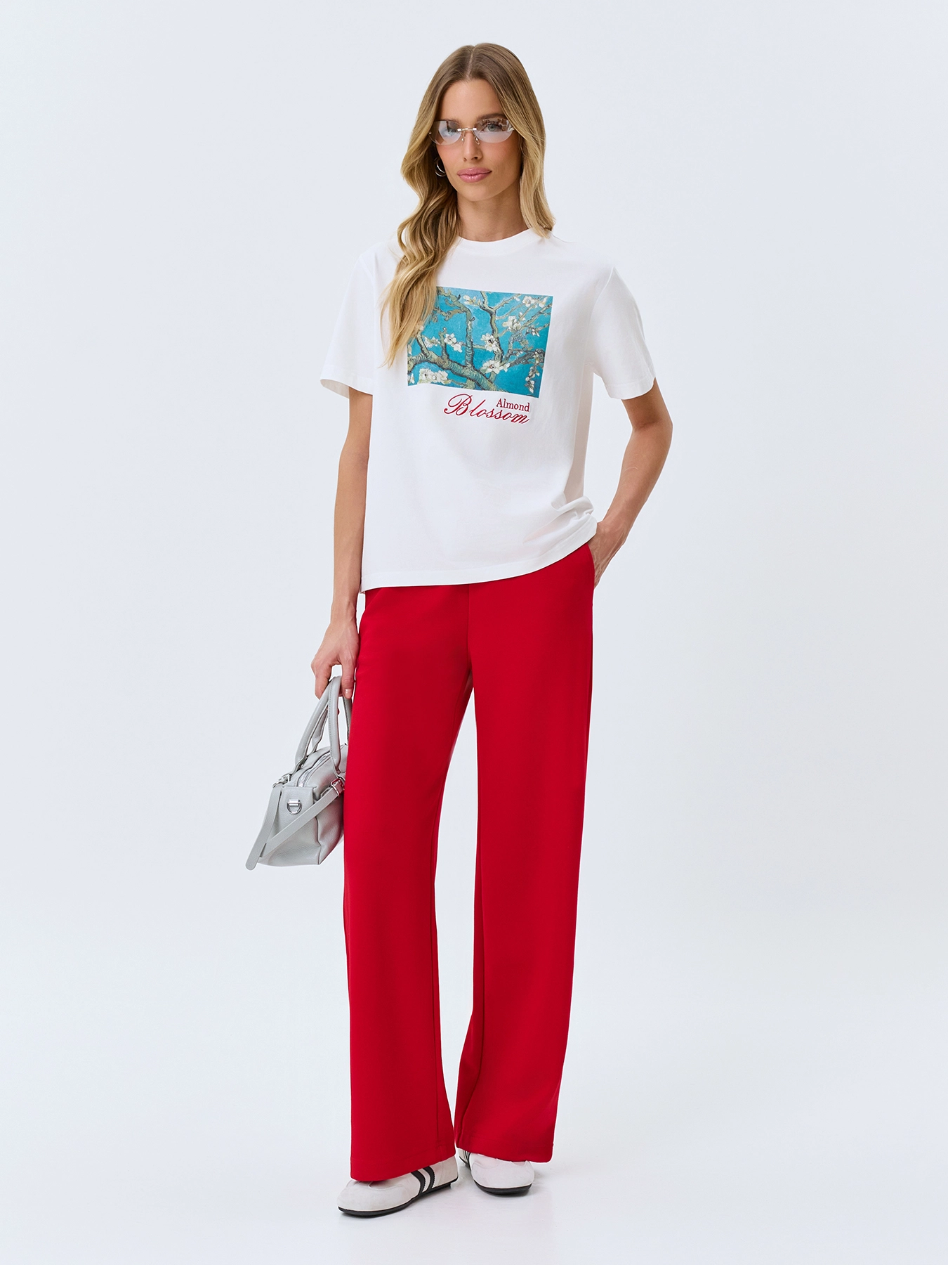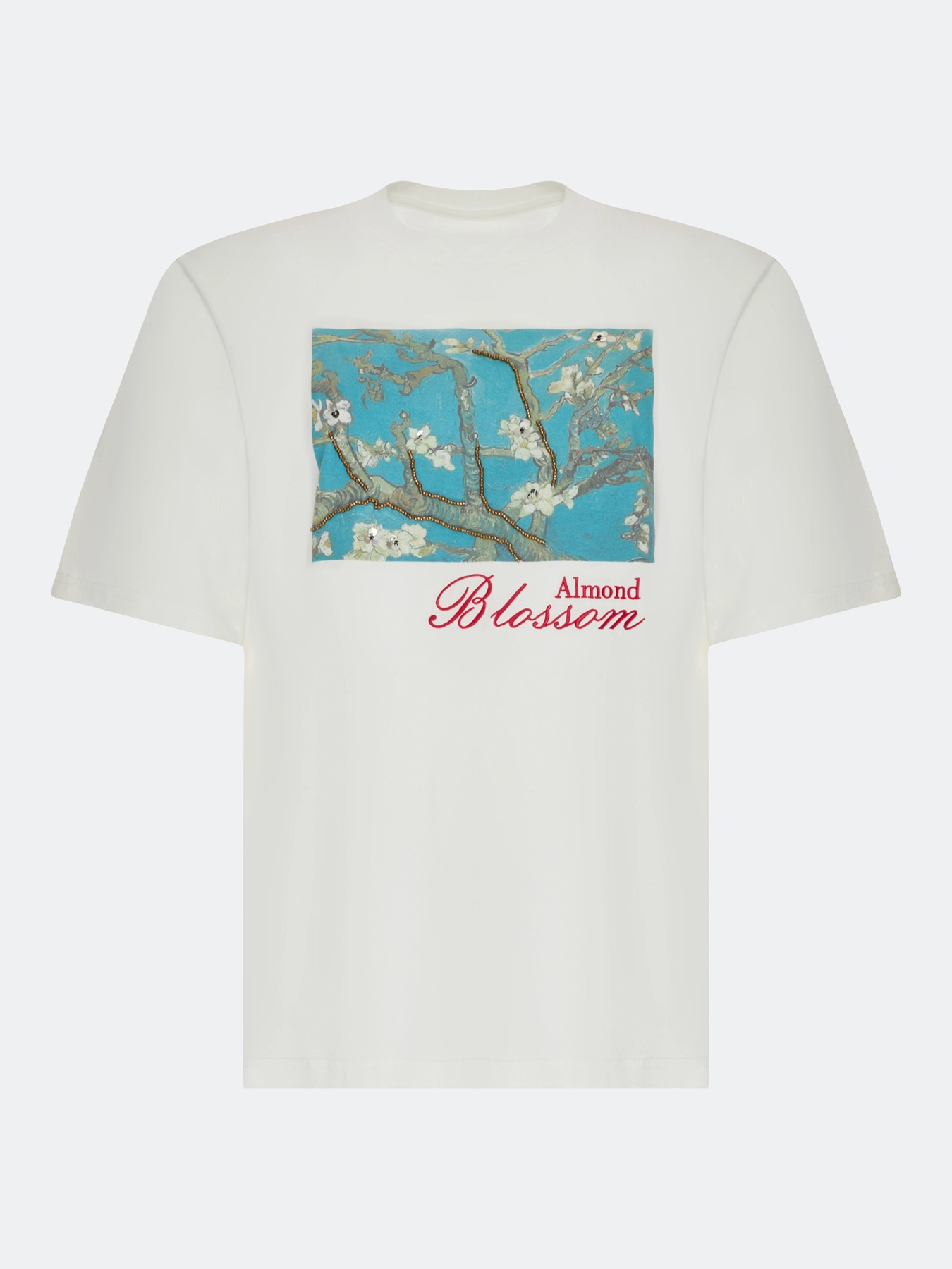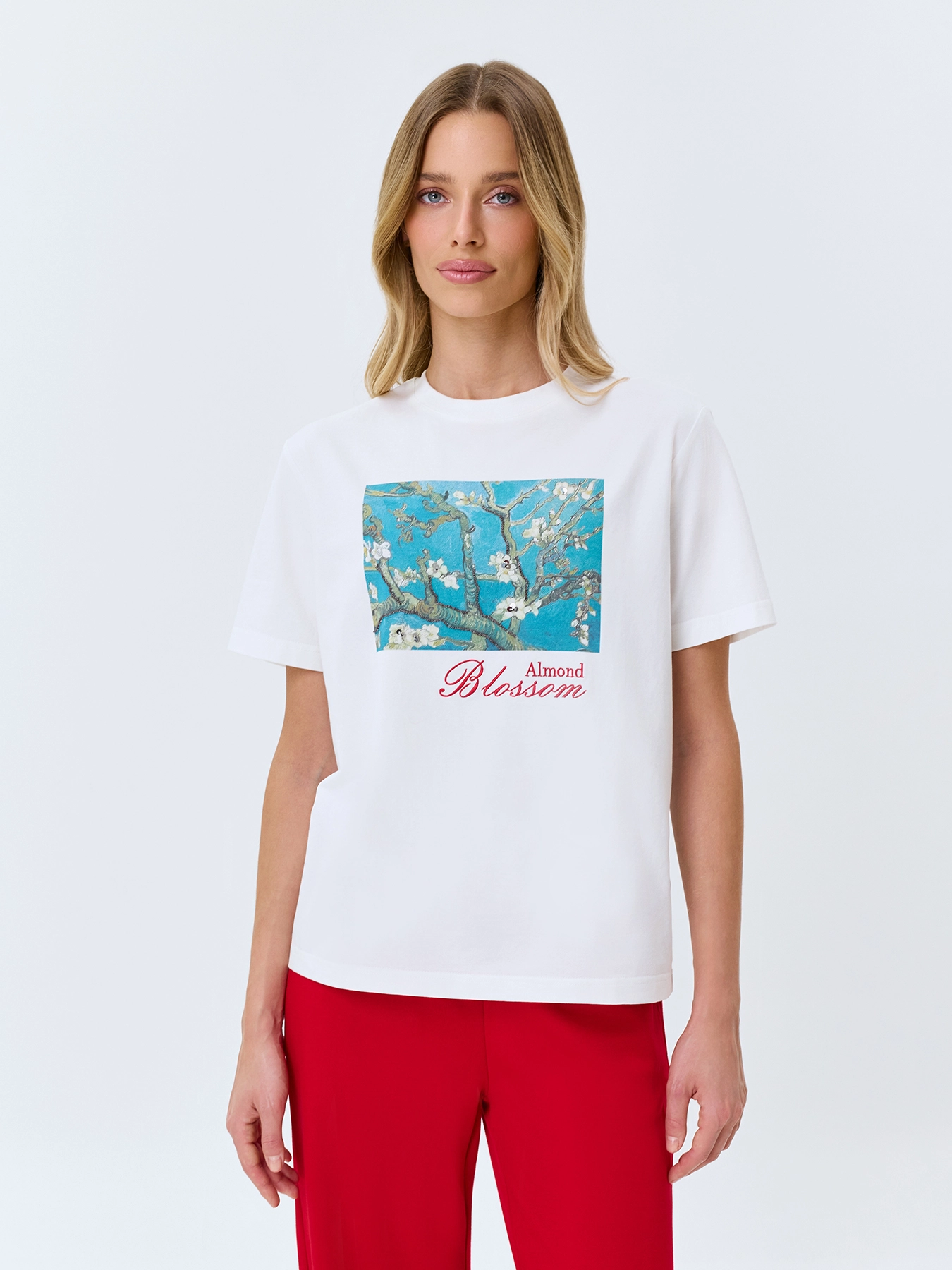 Oversize футболка с флоральным принтом и вышивкой бисером. Свободный силуэт. Круглый вырез. Линия плеч немного спущена. Укороченные втачные рукава.