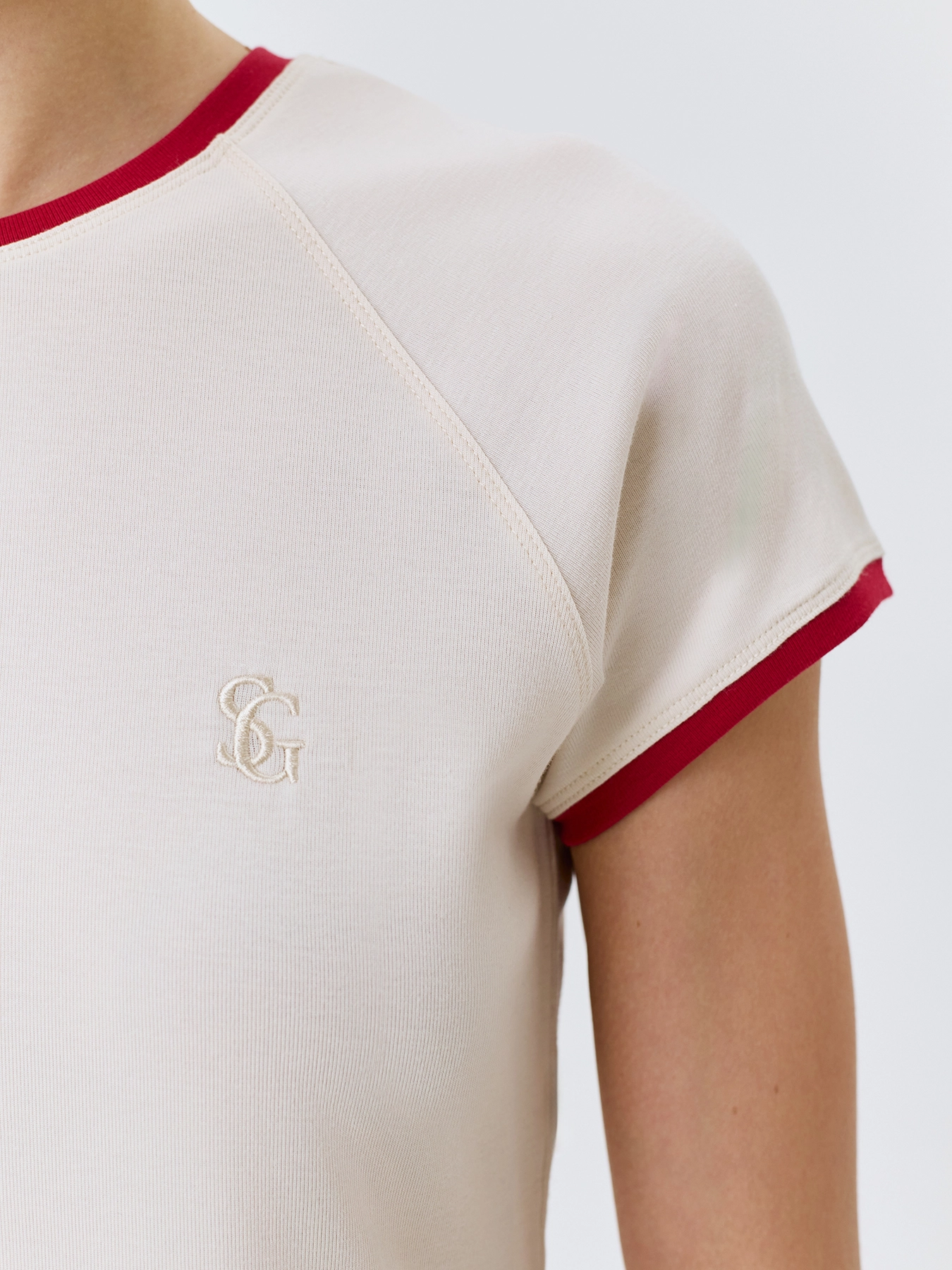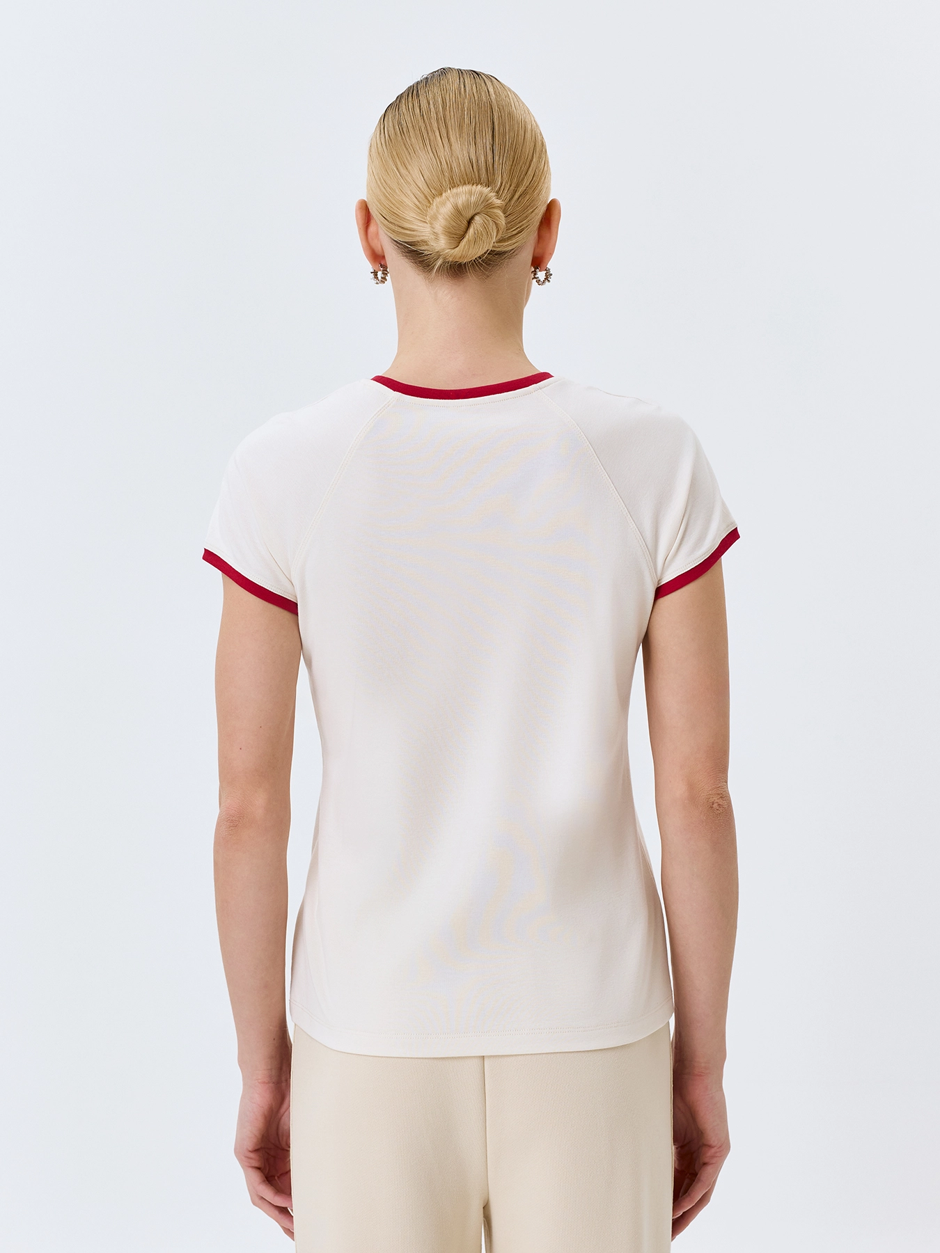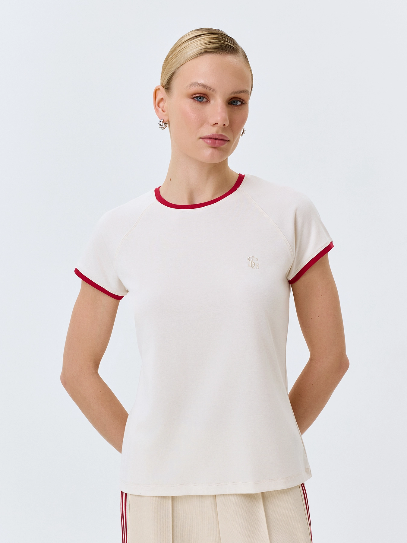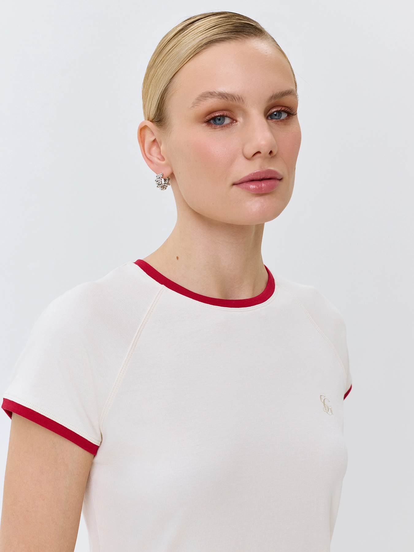 Приталенная футболка с контрастным рибом по горловине и низу рукавов. Короткие рукава реглан. Деликатная вышивка в цвет на груди. В составе хлопок и вискоза.