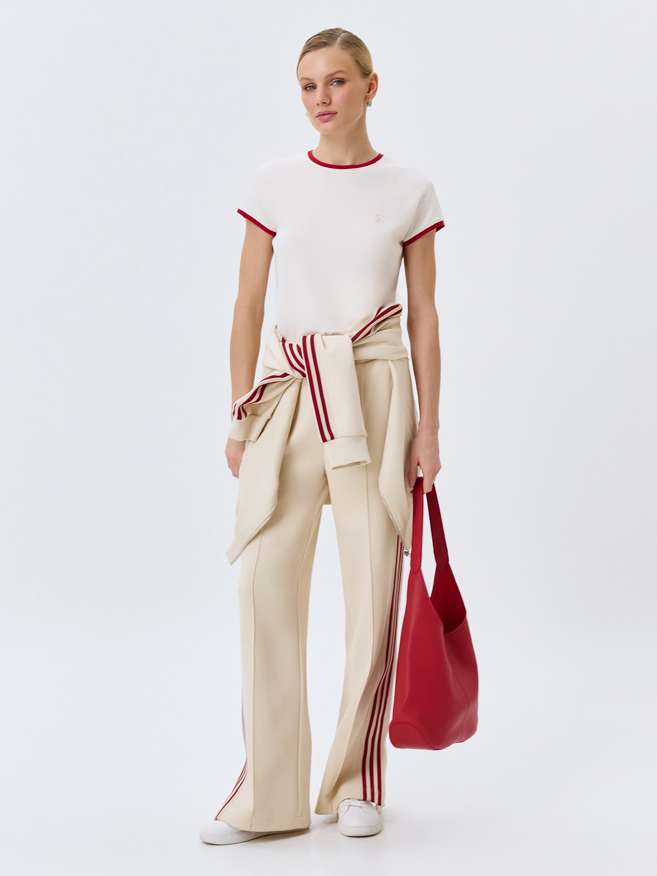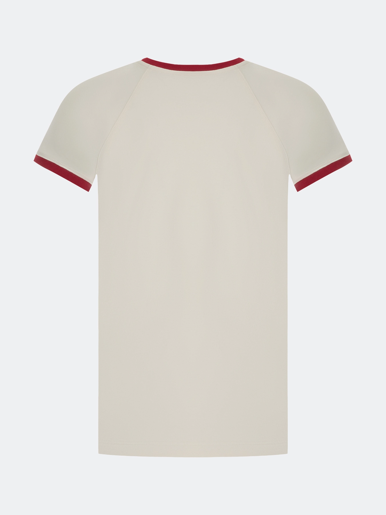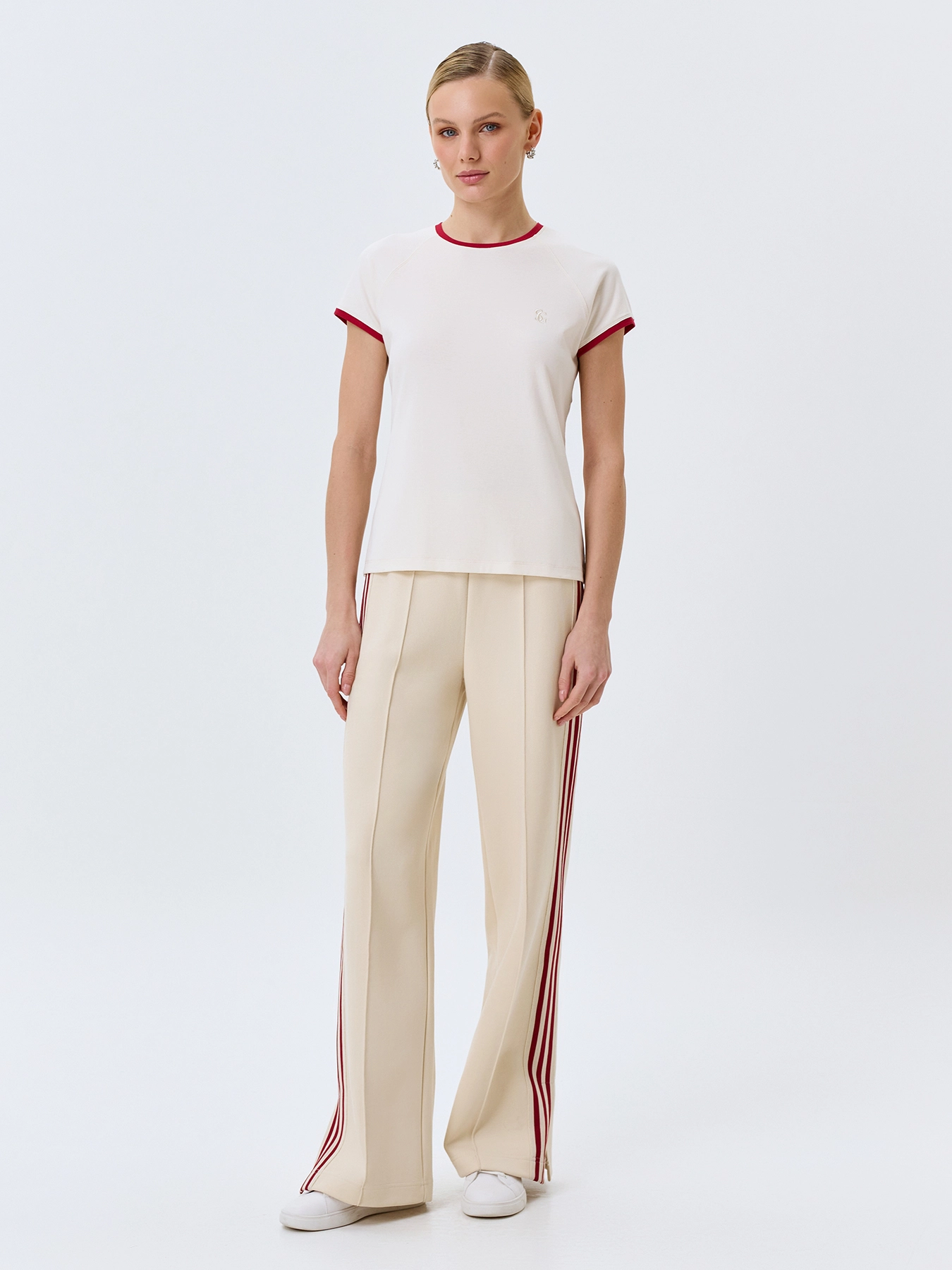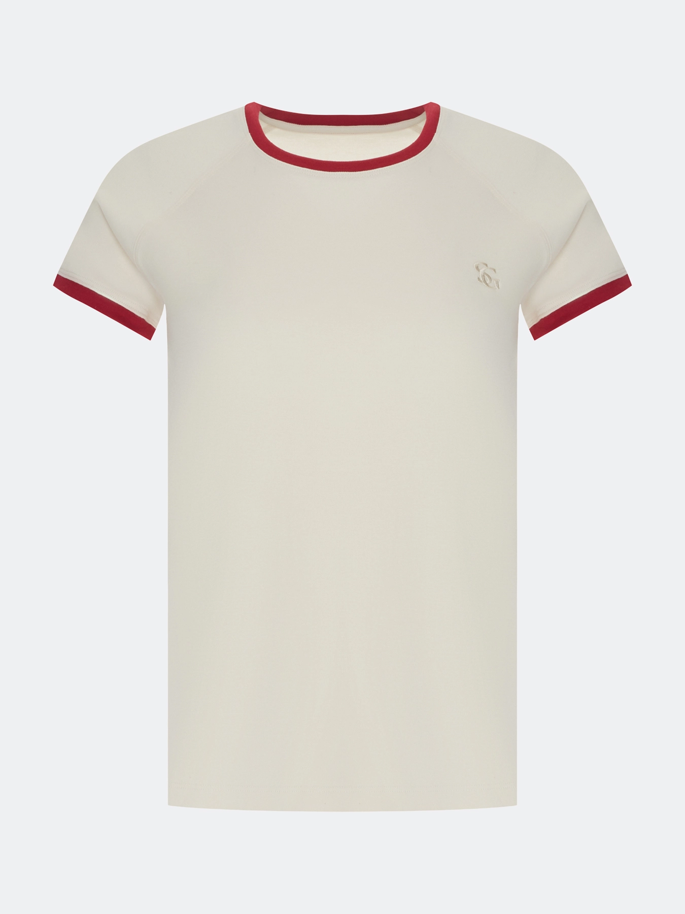 Приталенная футболка с контрастным рибом по горловине и низу рукавов. Короткие рукава реглан. Деликатная вышивка в цвет на груди. В составе хлопок и вискоза.