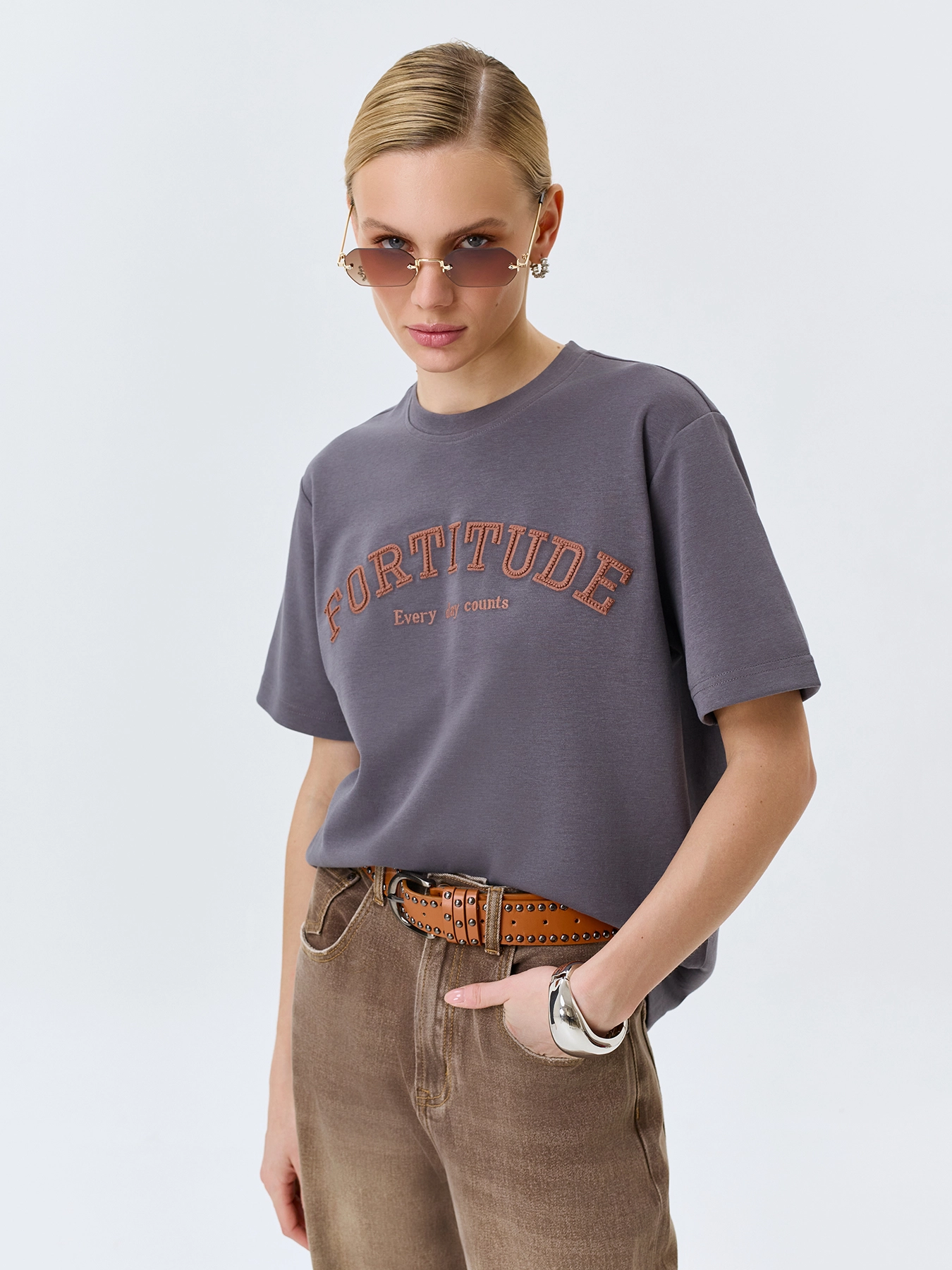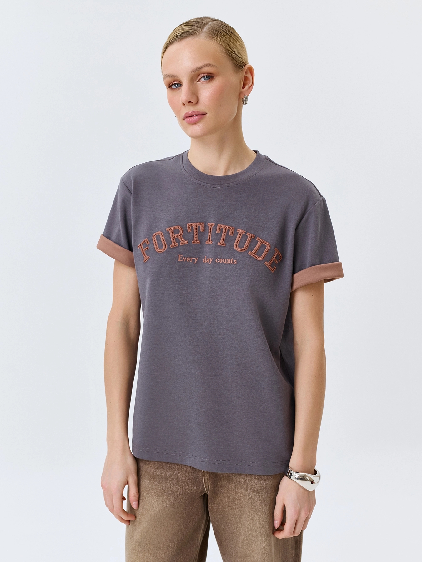 Футболка в стиле "College" из двустороннего трикотажного хлопка. Прямой силуэт. Круглый вырез. Короткие рукава. Линия плеч немного спущена. Дополнена контрастной вышивкой в тон изнанки. В составе хлопок.