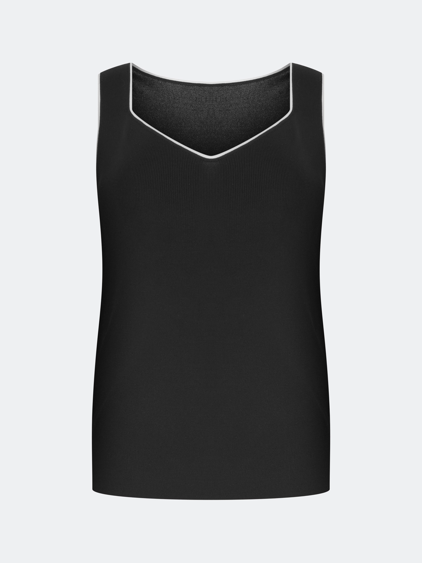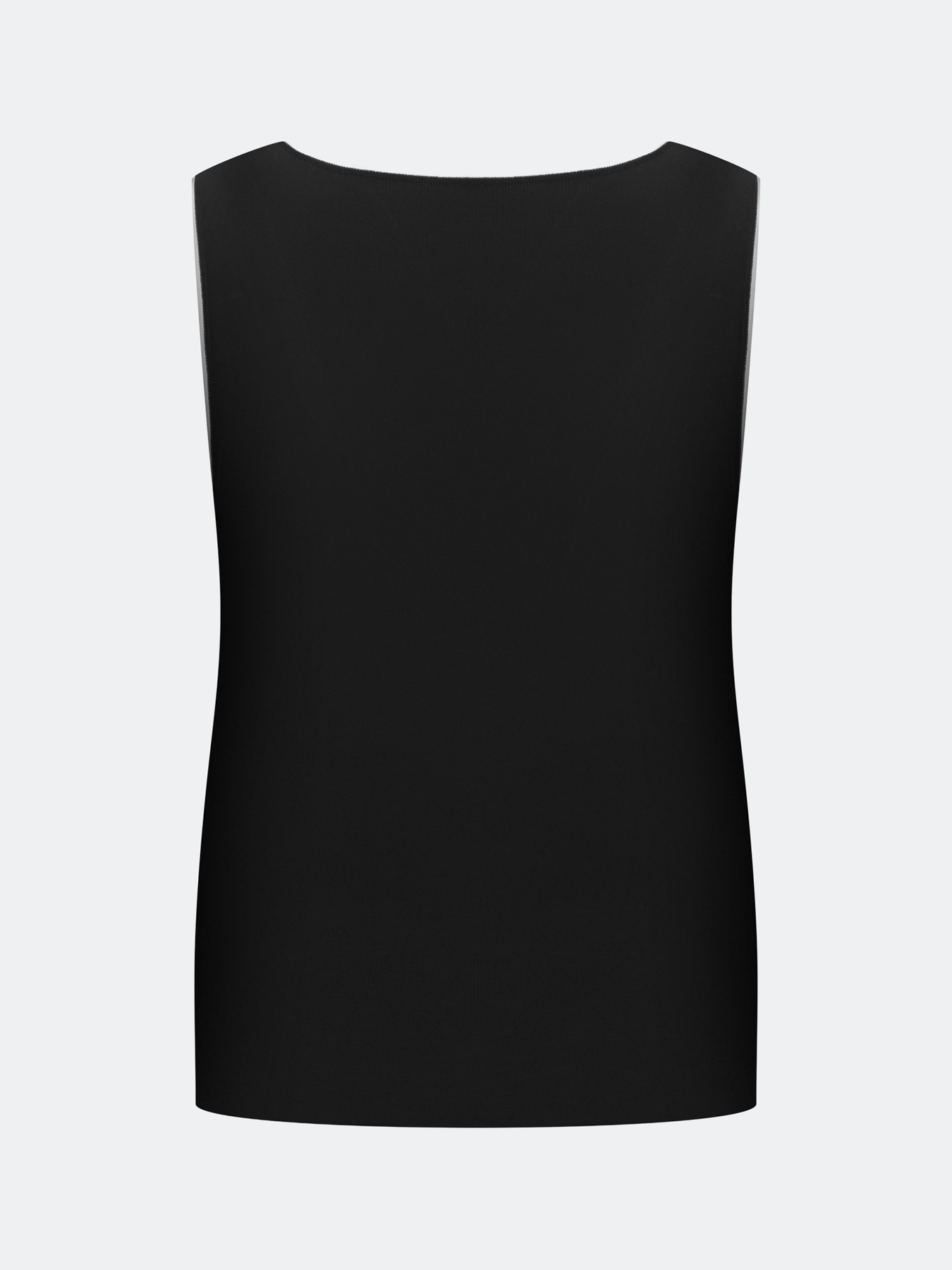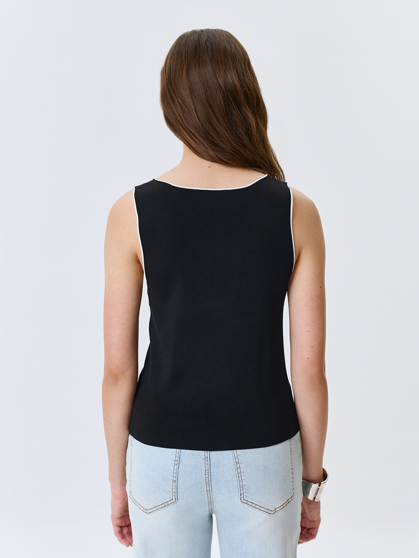 Вязаный топ из вискозы. Прямой силуэт. V-образный вырез с широкими бретелями. Дополнен контрастным кантом по линии горловины и проймы.