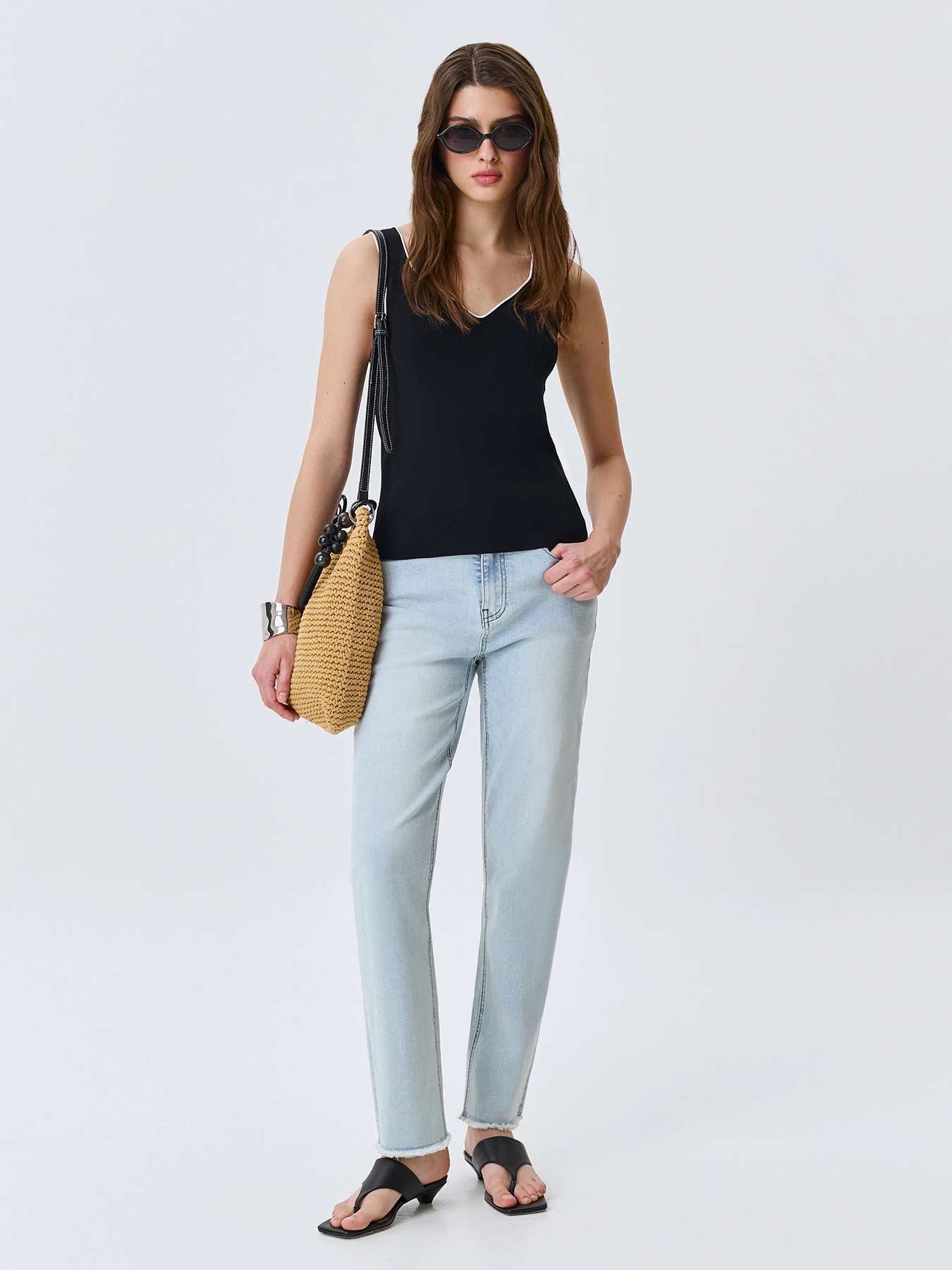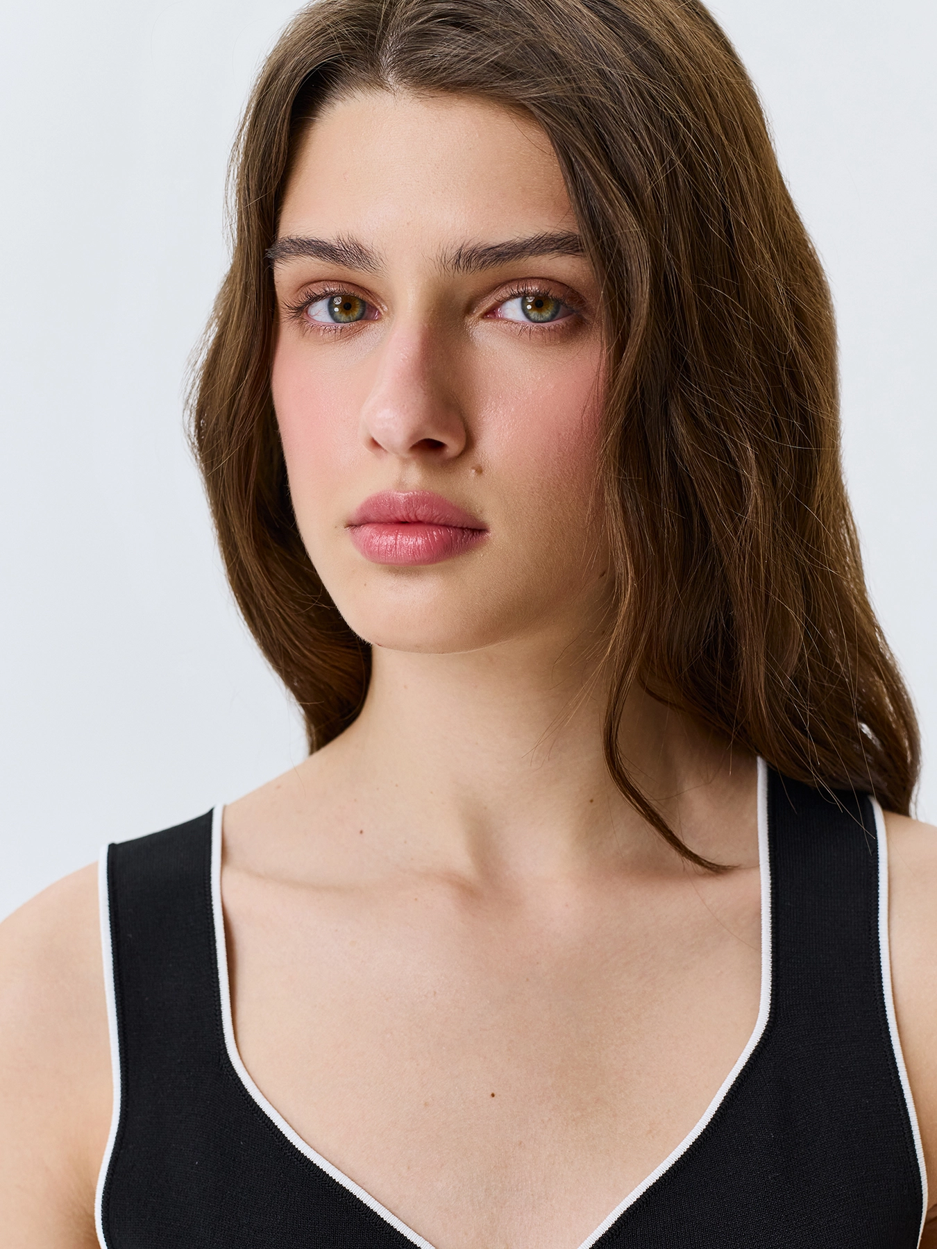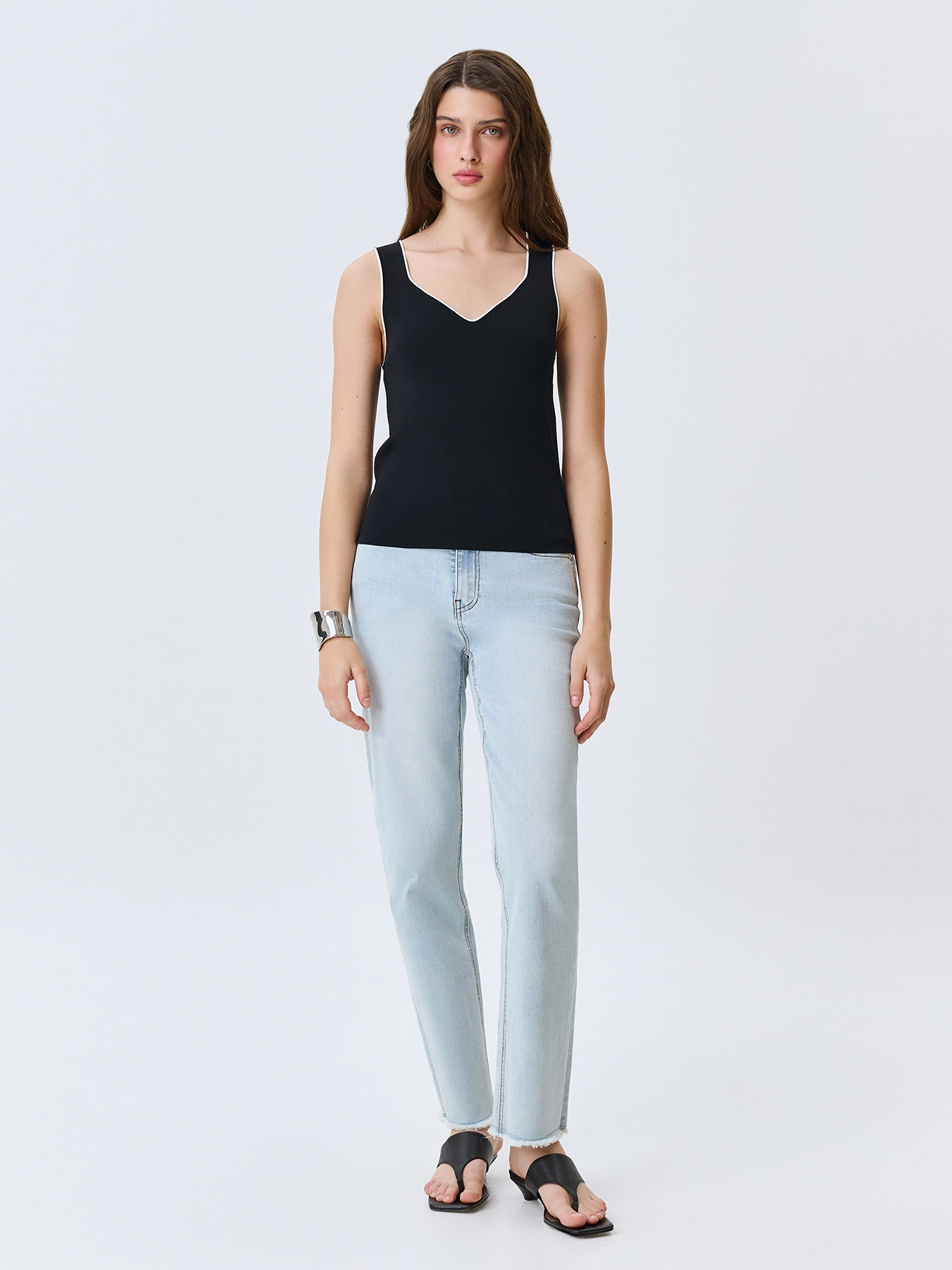 Вязаный топ из вискозы. Прямой силуэт. V-образный вырез с широкими бретелями. Дополнен контрастным кантом по линии горловины и проймы.