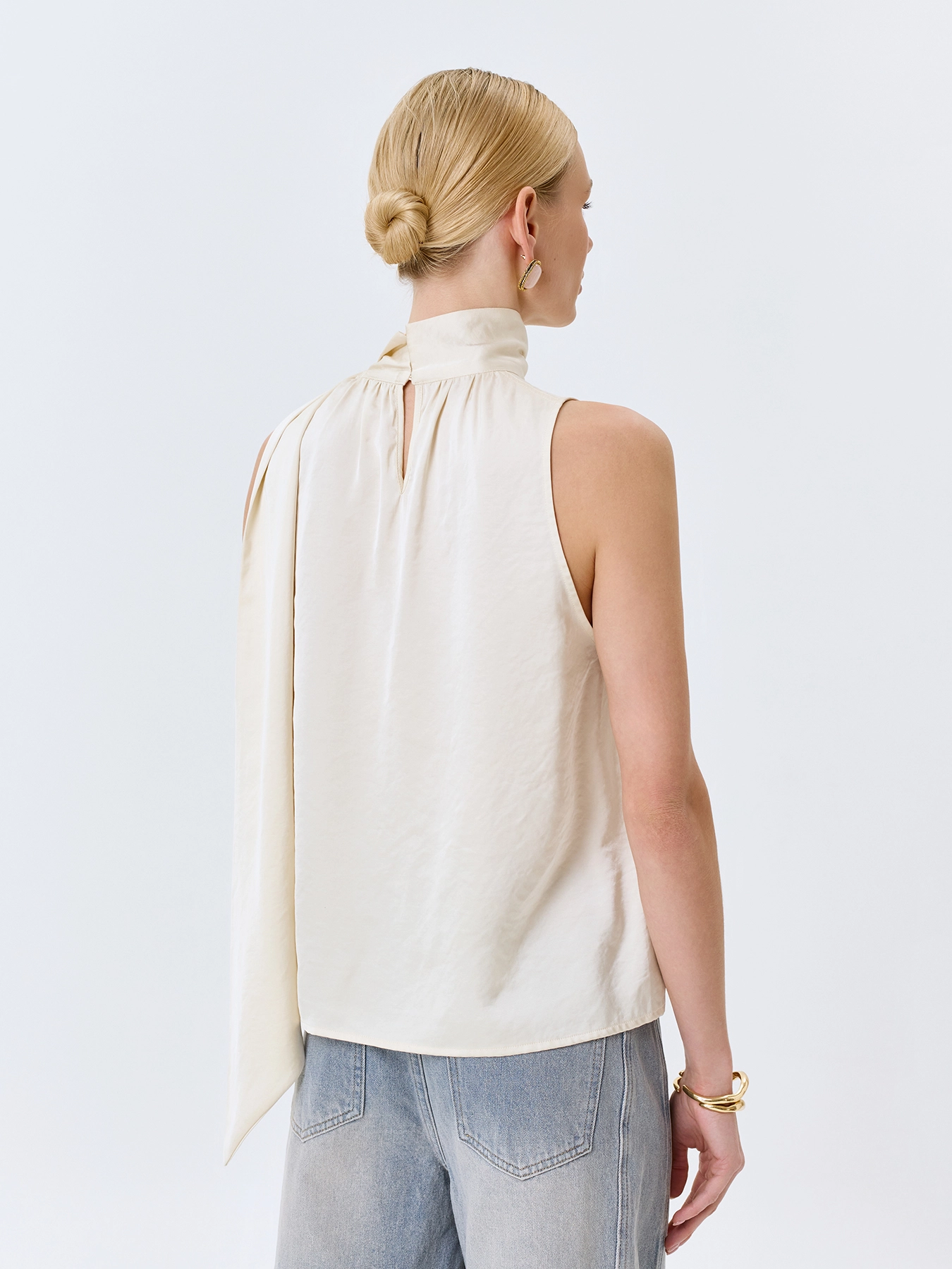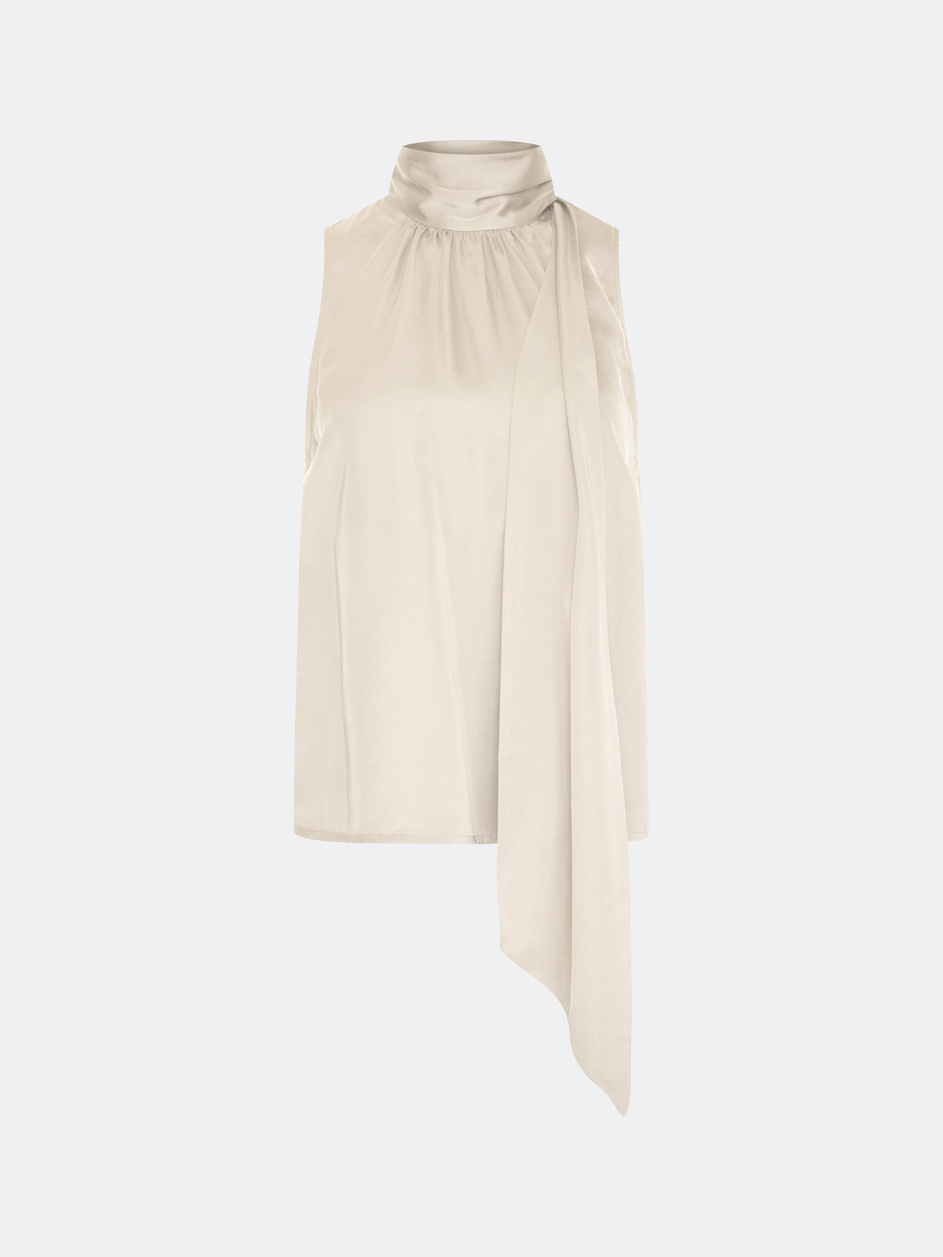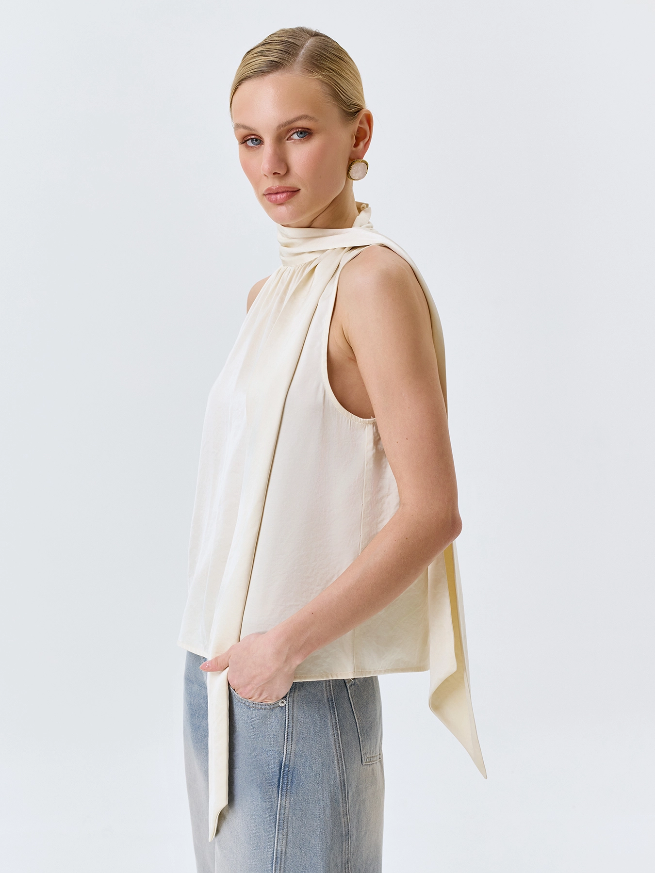 Топ халтер свободного силуэта из сатиновой вискозы. Воротник стойка дополнен струящимся шарфом. Мягкая драпировка по линии горловины.