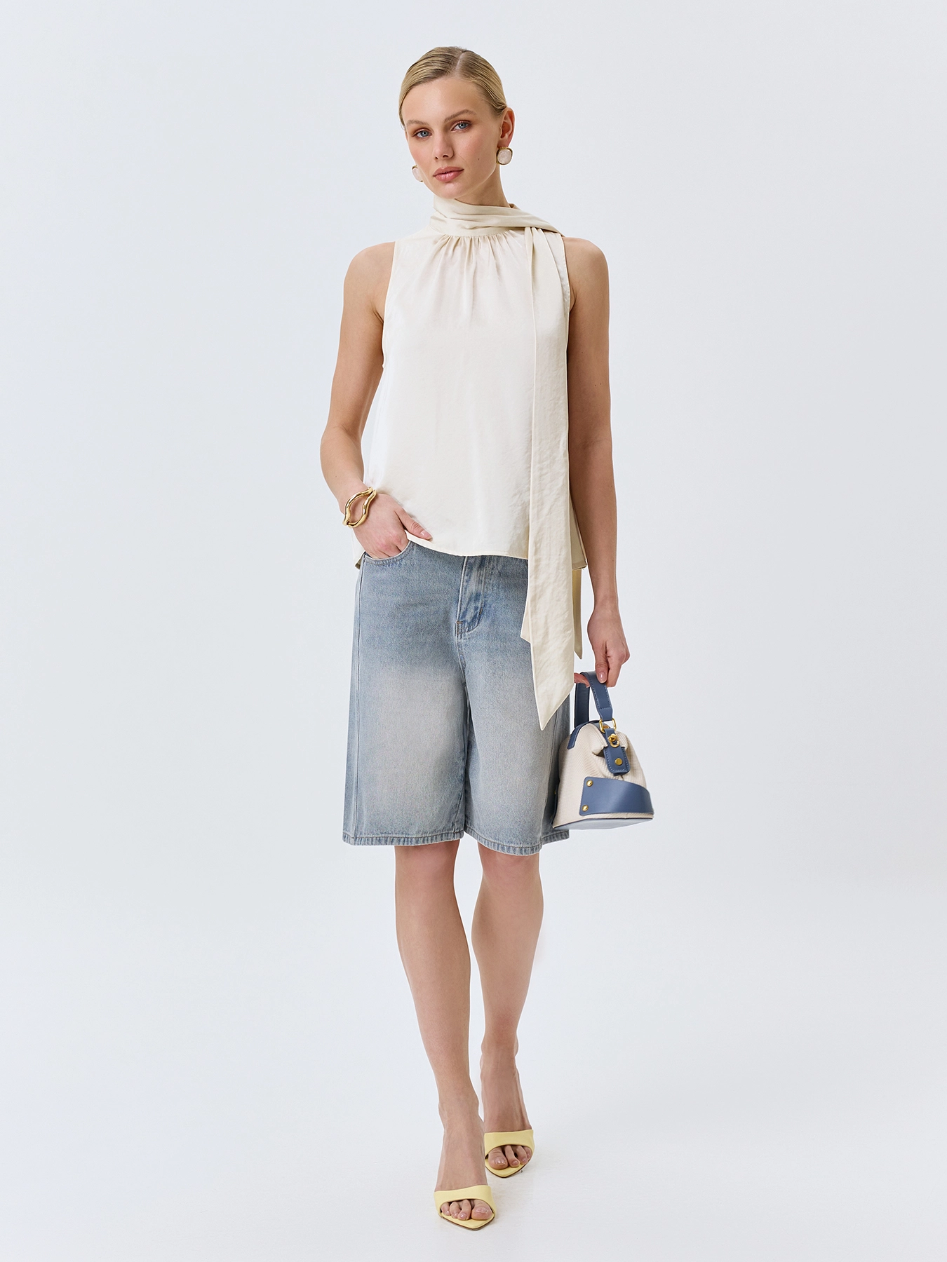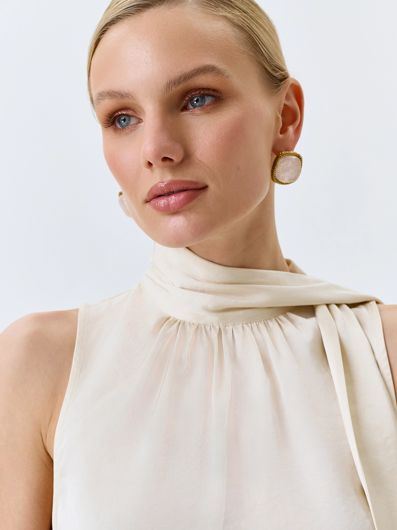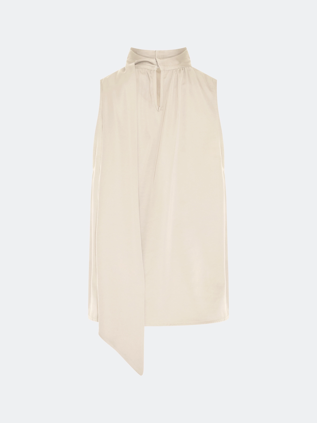 Топ халтер свободного силуэта из сатиновой вискозы. Воротник стойка дополнен струящимся шарфом. Мягкая драпировка по линии горловины.