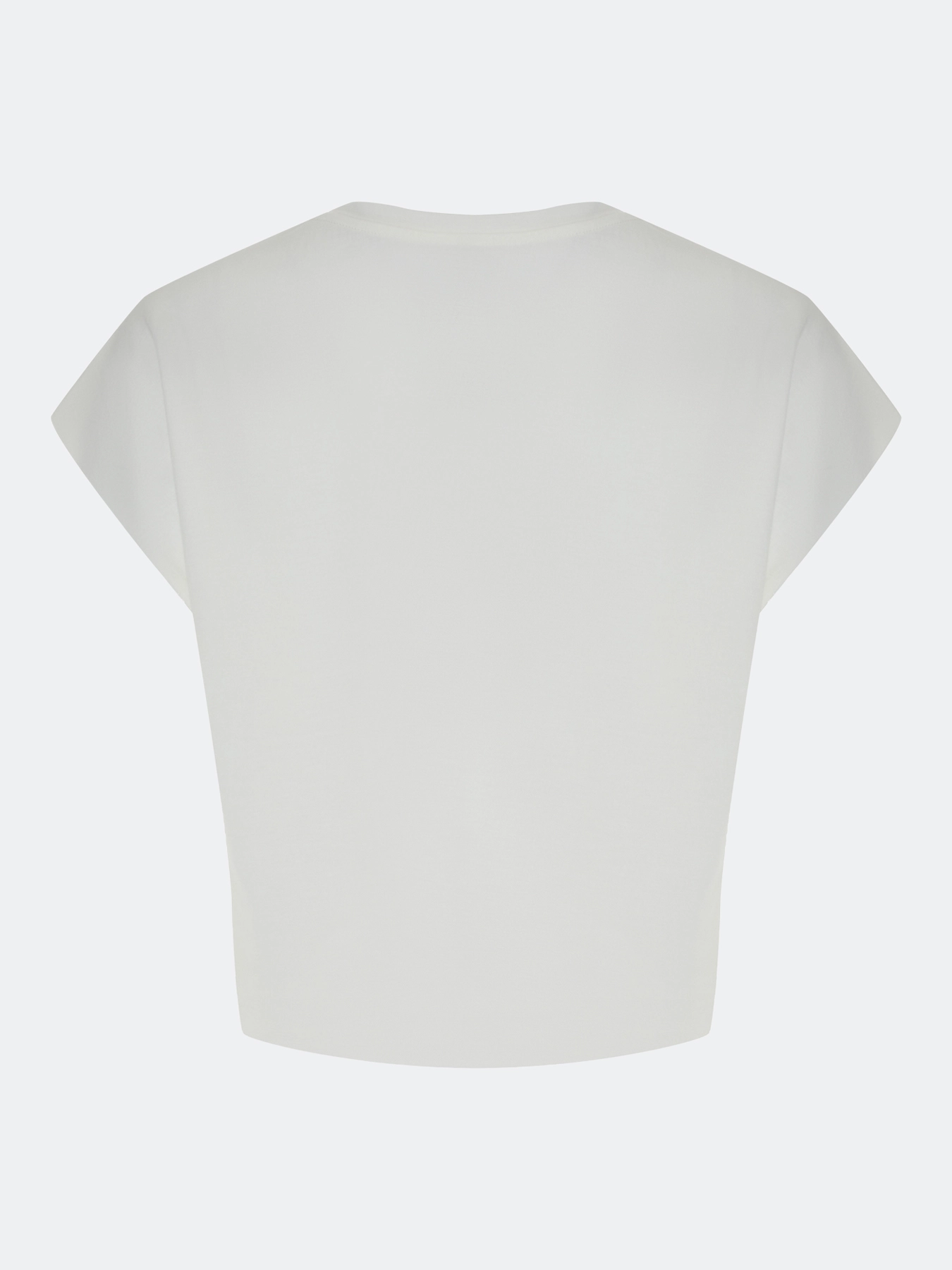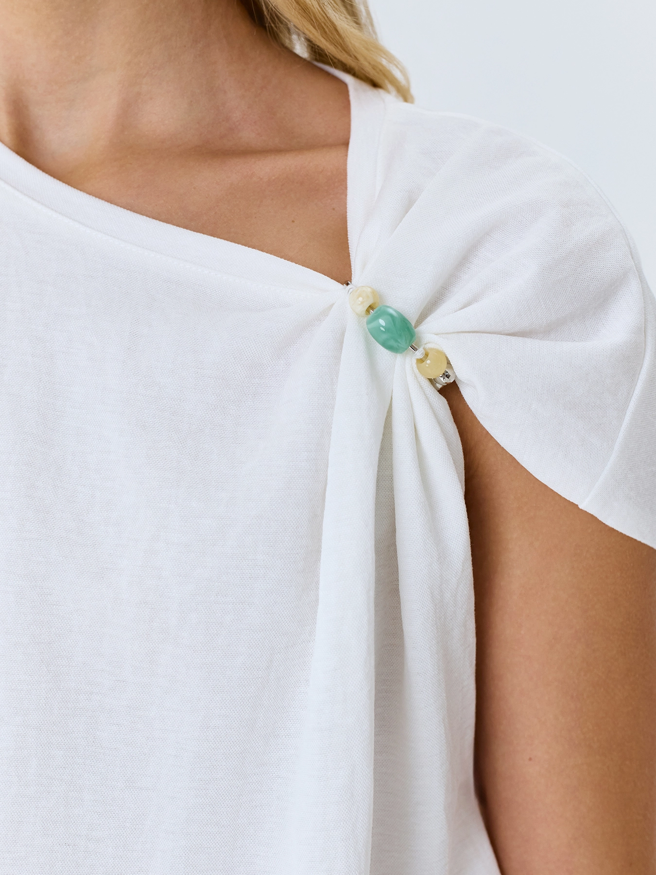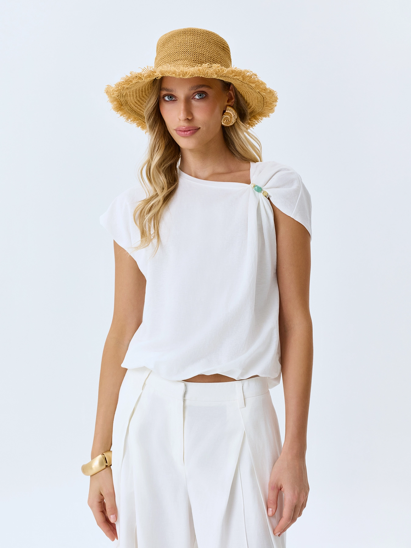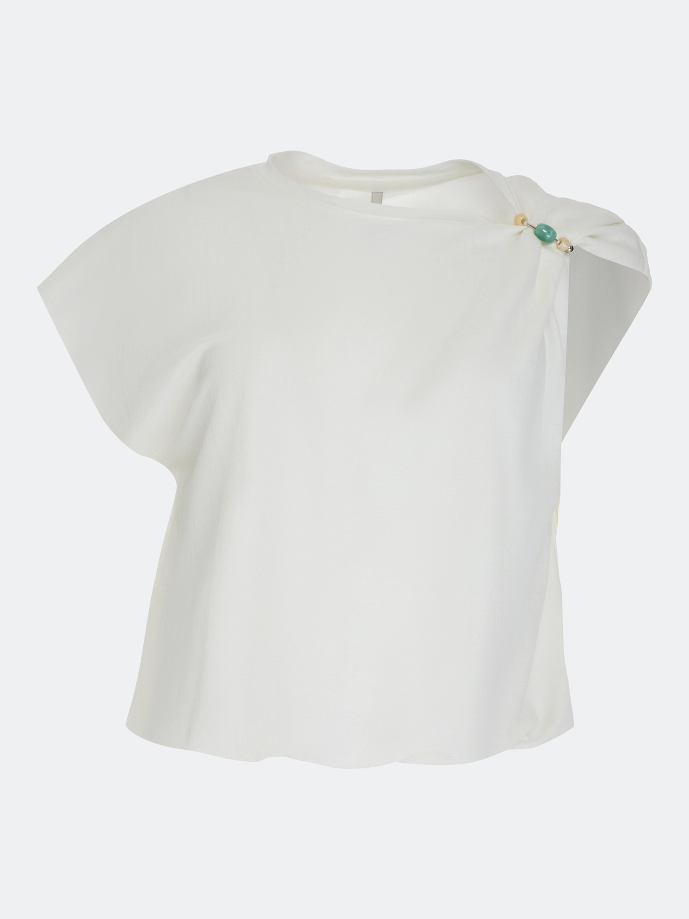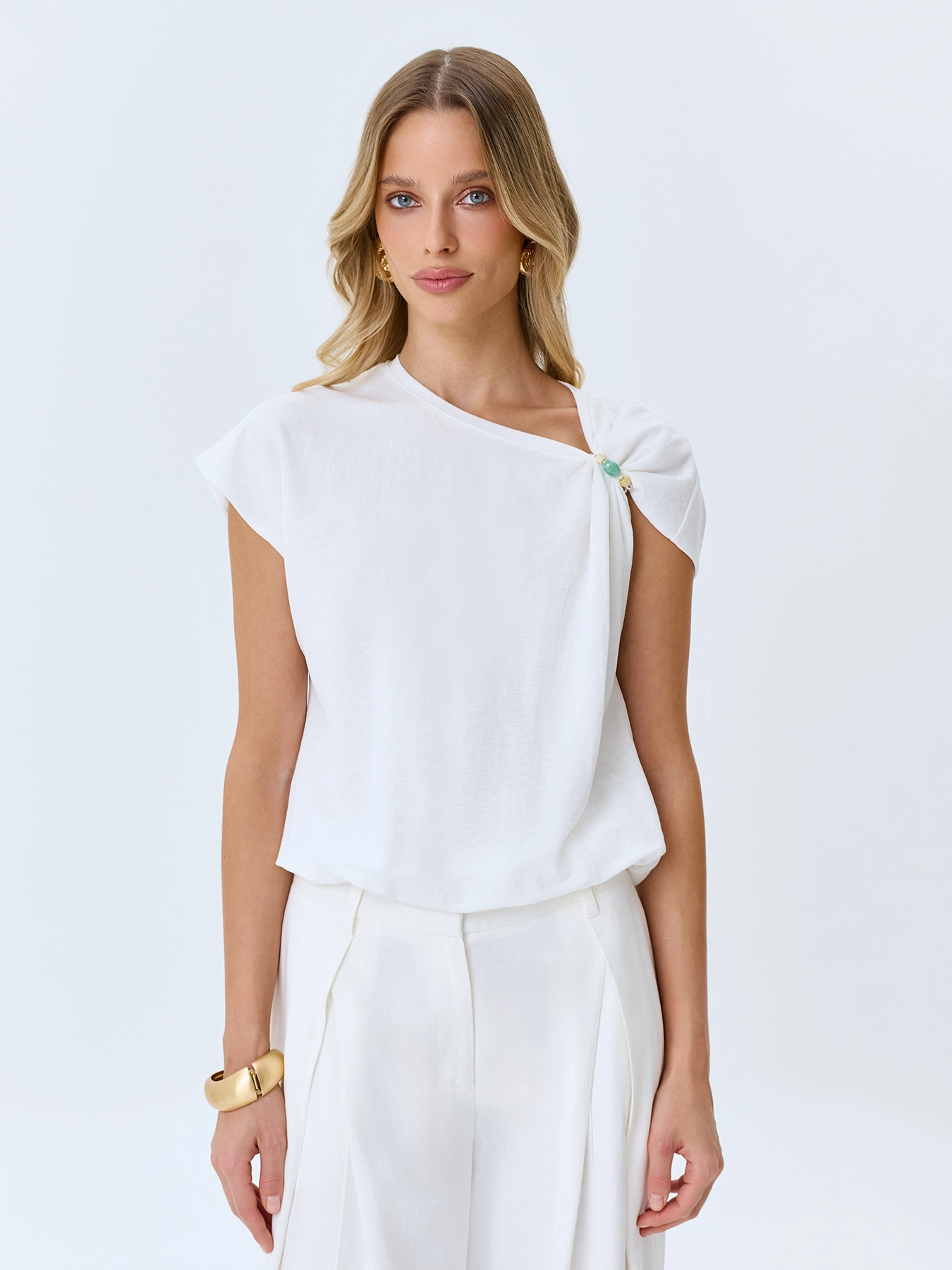 Укороченный топ с металлическим декором на плече. Свободный силуэт. Асимметричный вырез на одно плечо. В составе вискоза и нейлон.