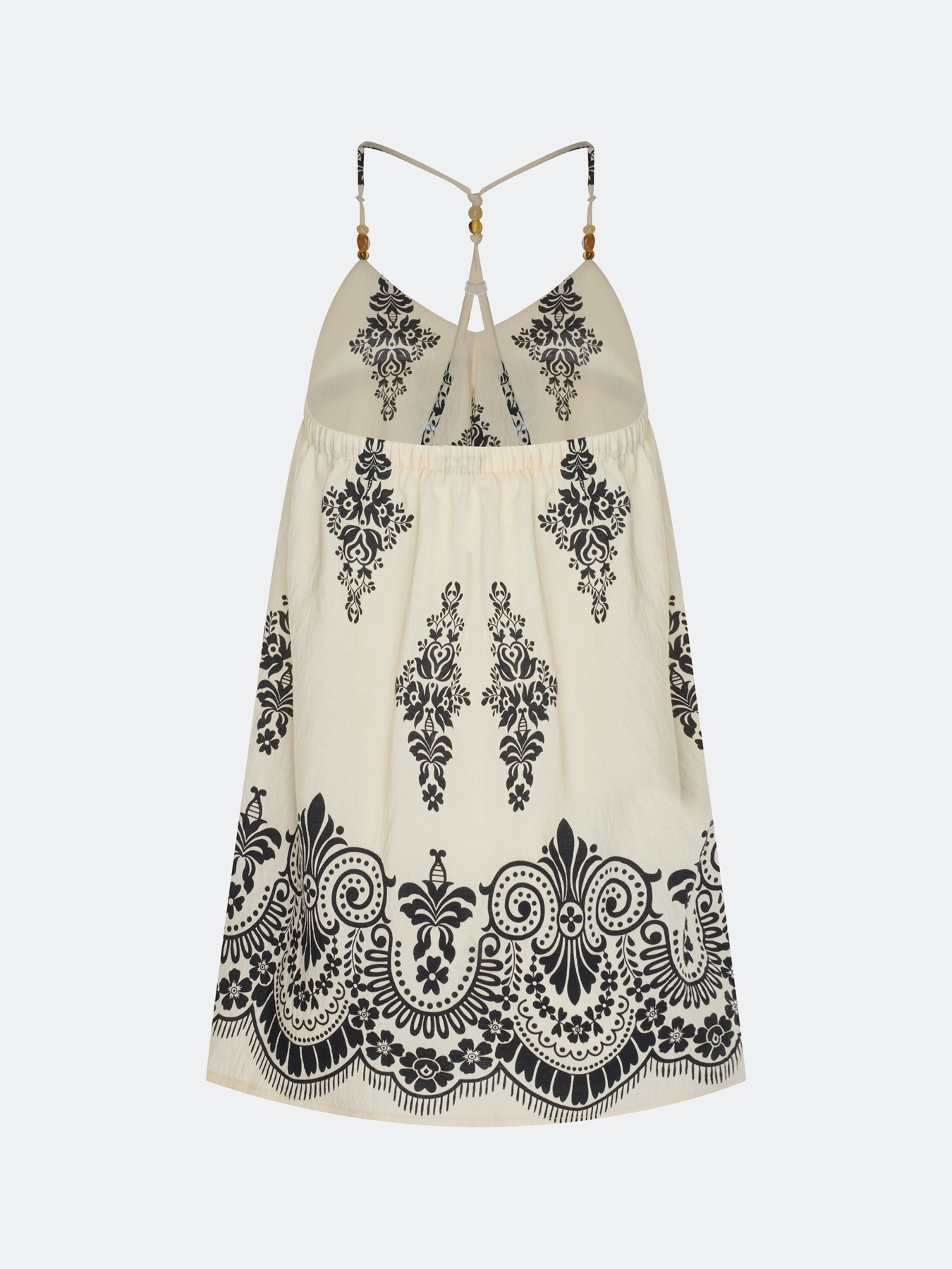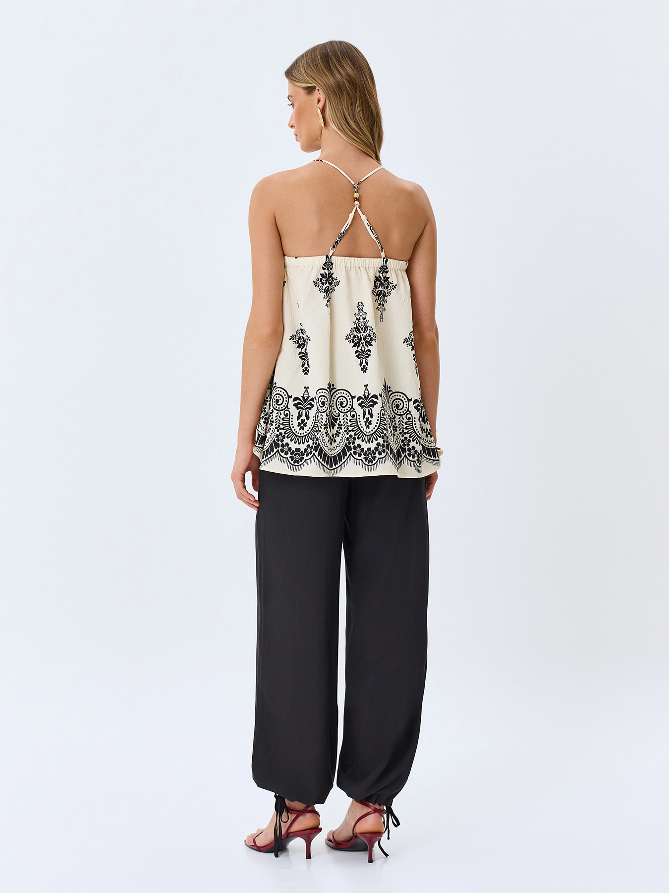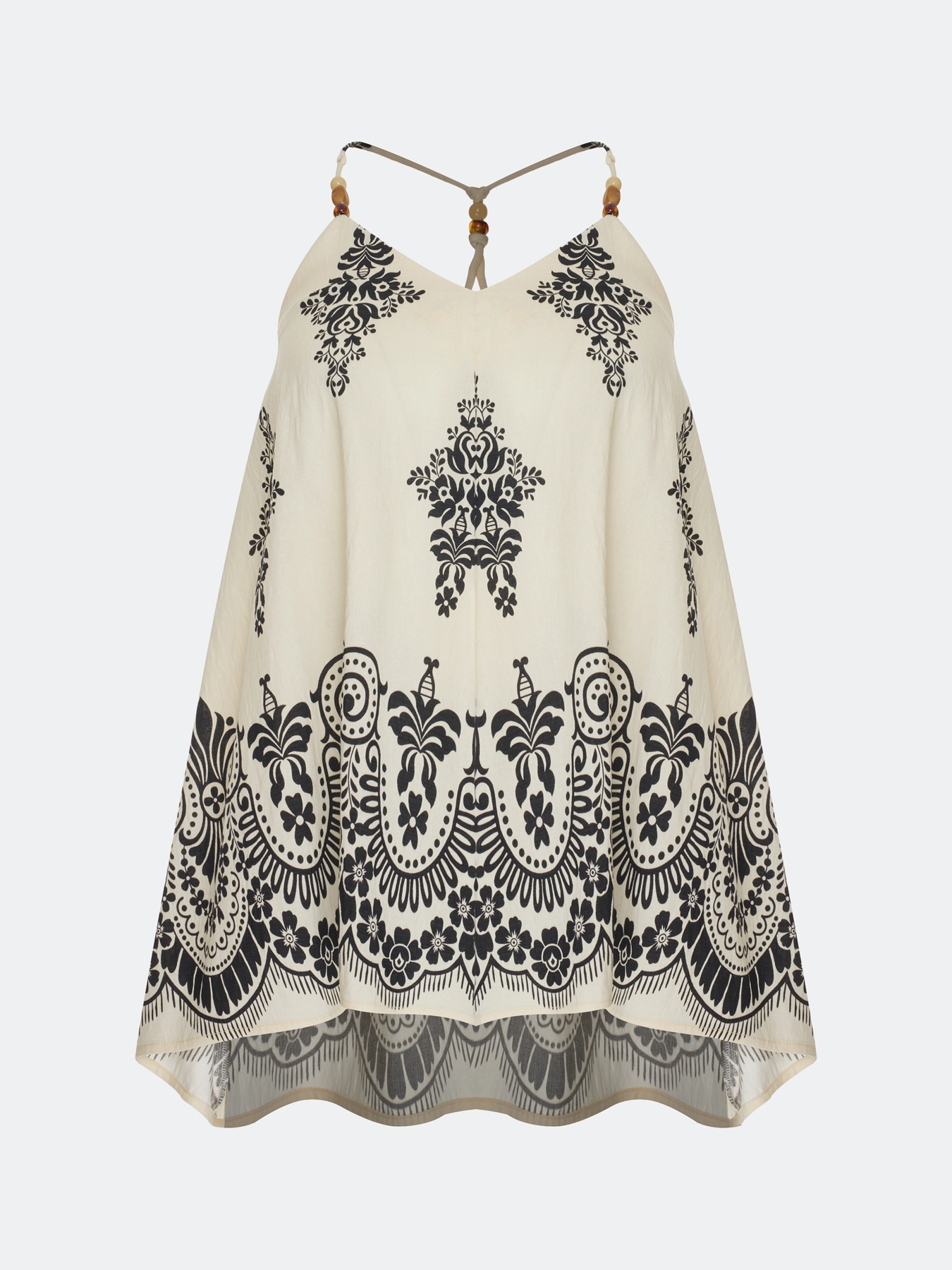 Топ с орнаментом в этническом стиле. Свободный силуэт. V-образный вырез. Тонкие регулируемые бретели дополнены декоративными бусинами. Спинка немного удлинена. Резинка по спинке. В составе вискоза.