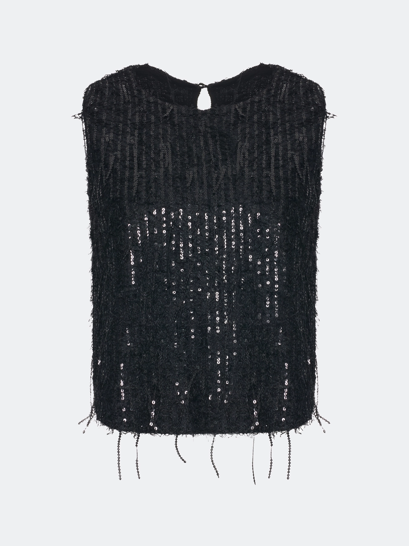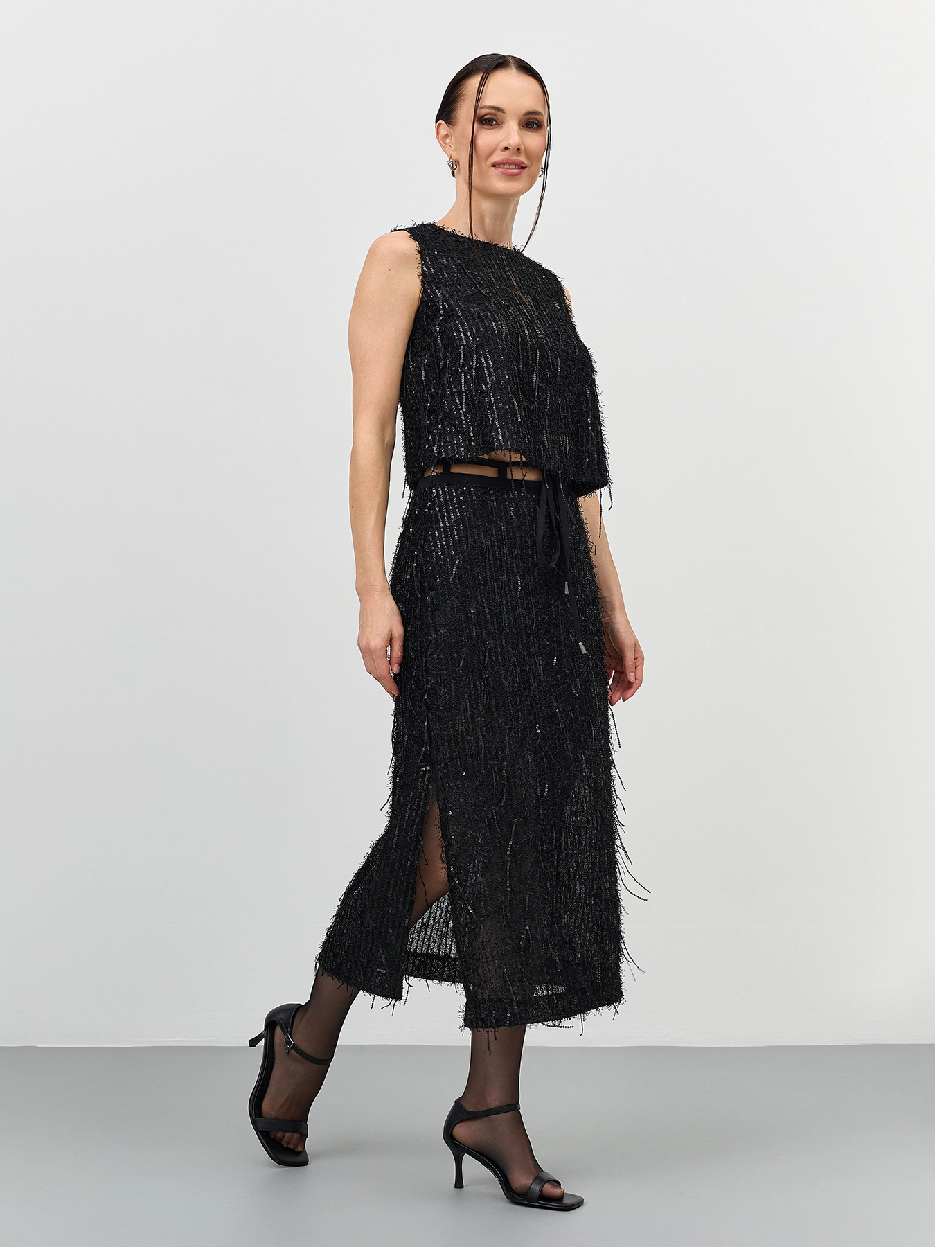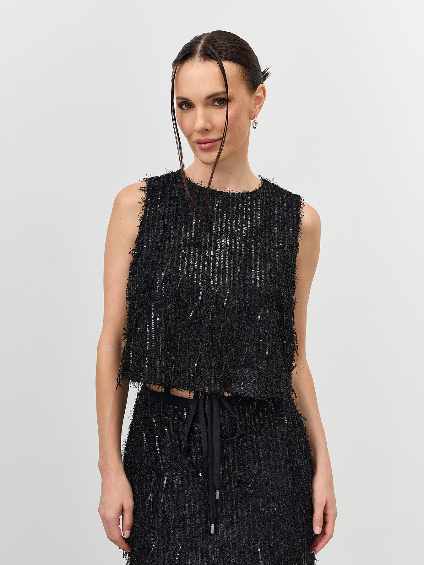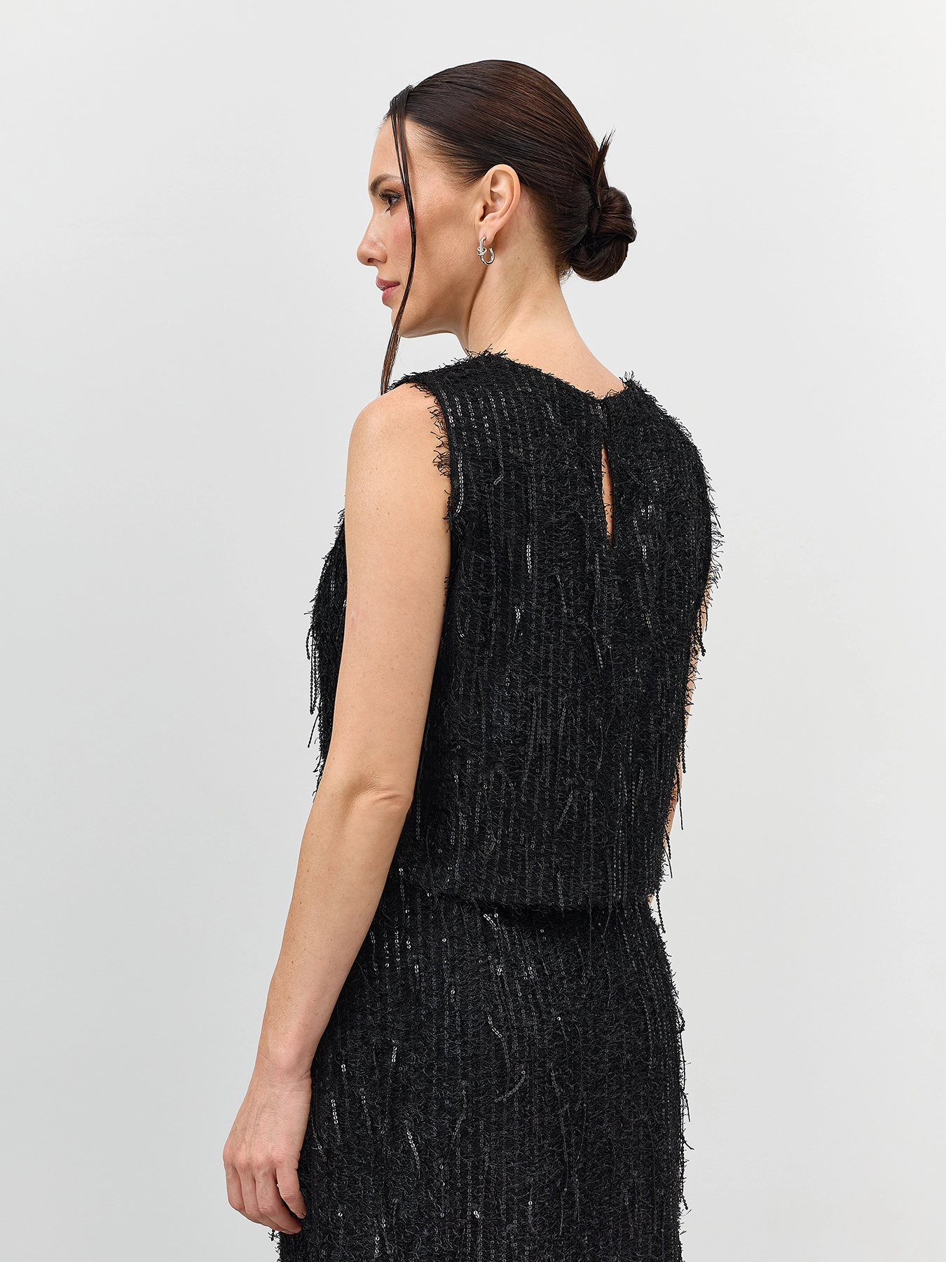 Нарядный топ прямого силуэта из текстурной ткани с пайетками и бахромой. Круглый вырез. Застежка на маленькую пуговицу. Дополнен подкладкой из 100% вискозы. Комплект с арт. 60519.