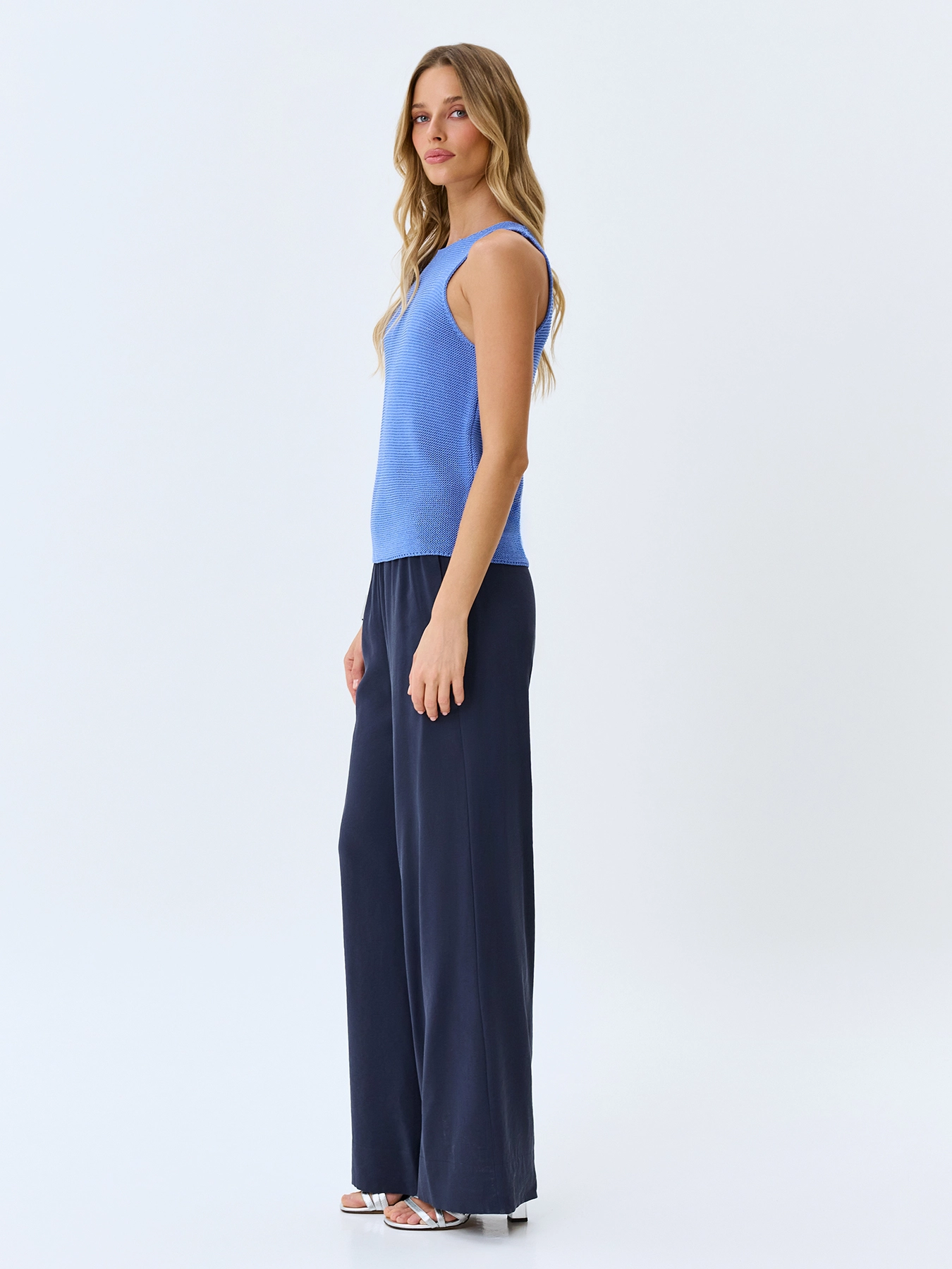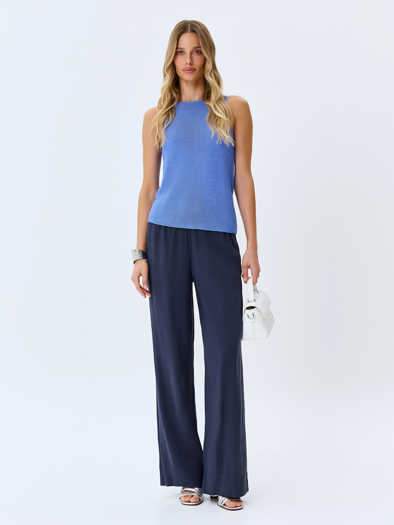 Вязаный топ из смесовой вискозы. Прямой силуэт. Фактурная вязка. Вырез лодочка. Широкие бретели.