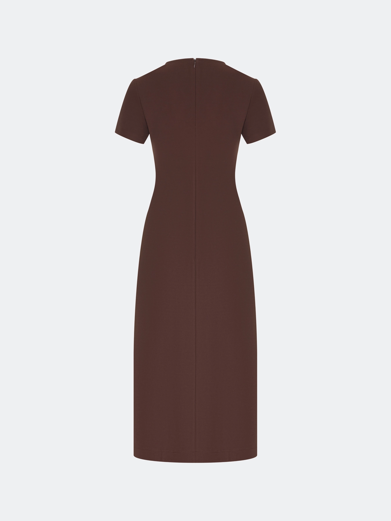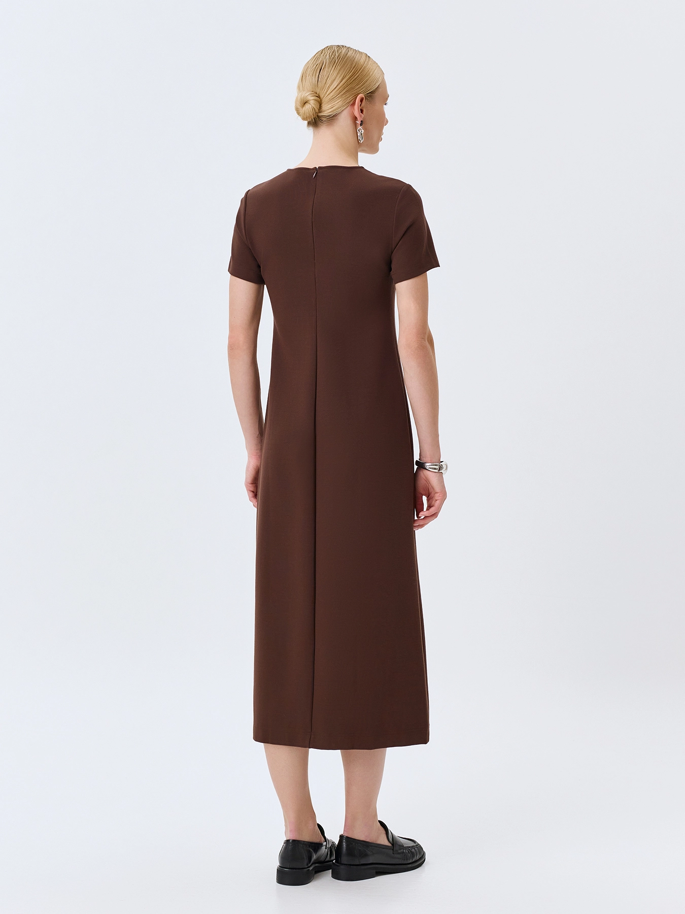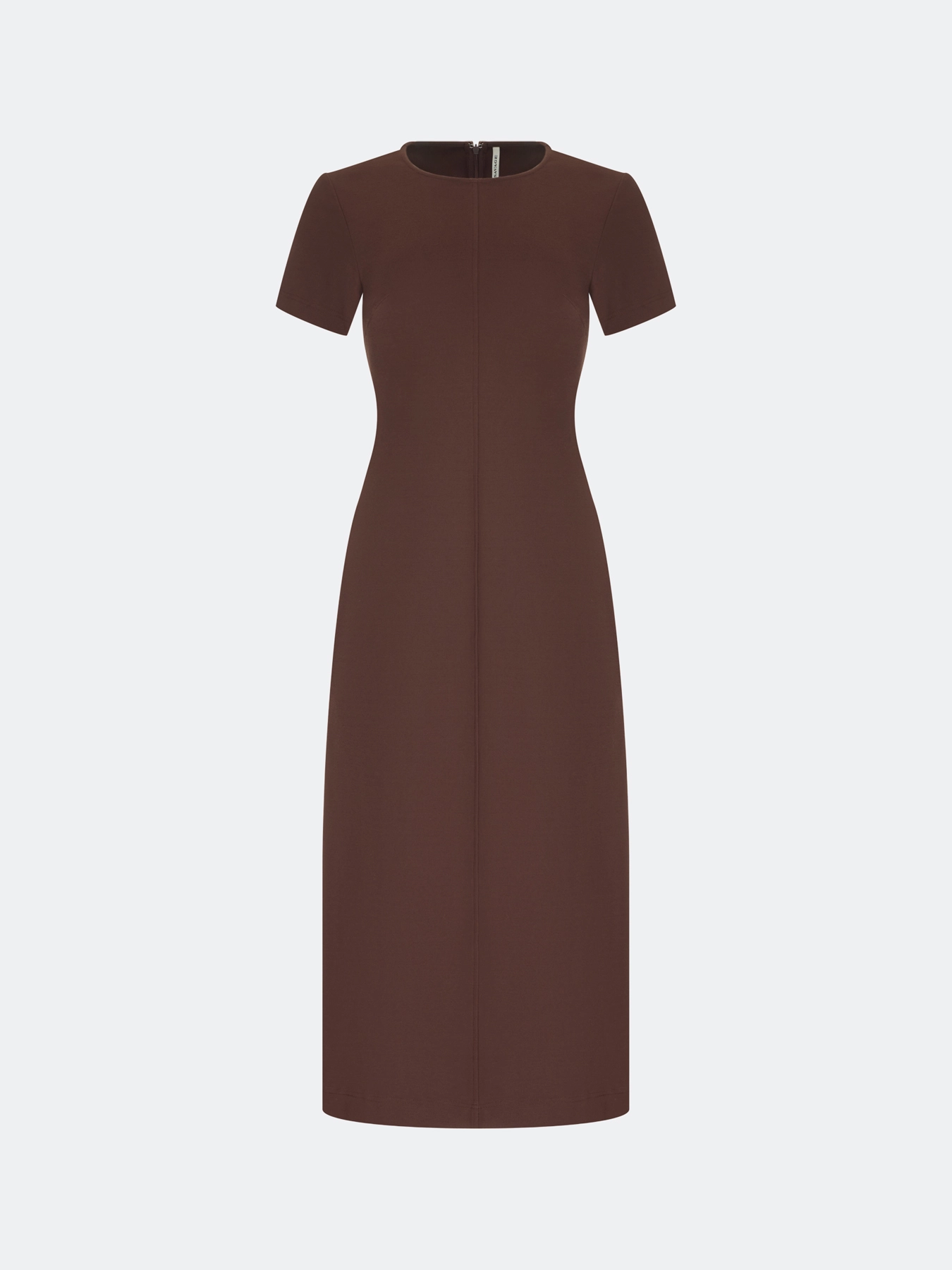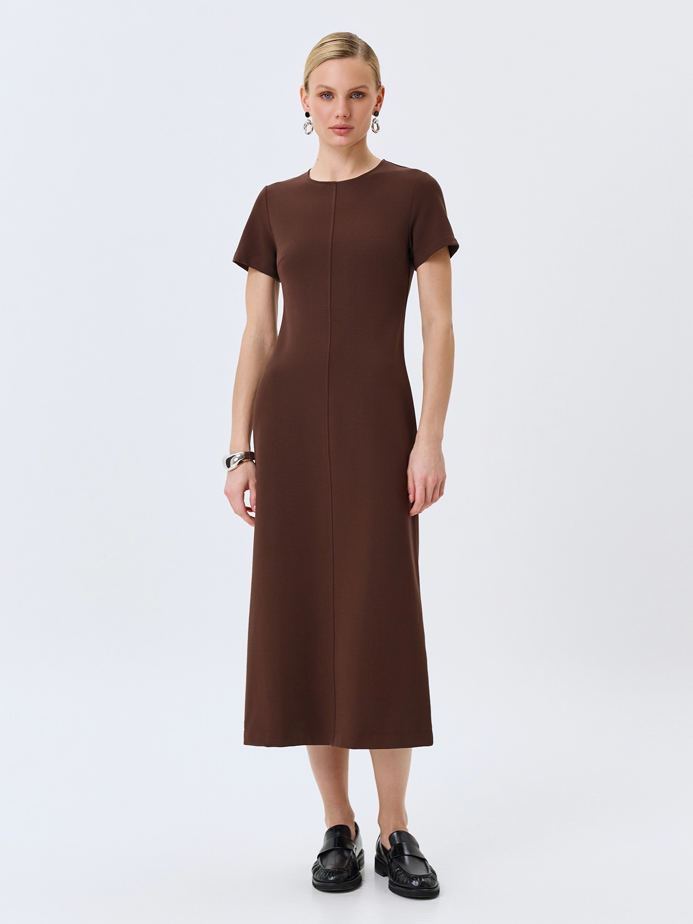 Базовое платье из смесовой вискозы и нейлона. Круглый вырез. Полуприталенный силуэт. Длина миди. Короткие втачные рукава. Застежка на потайную молнию. Дополнено вертикальным швом.