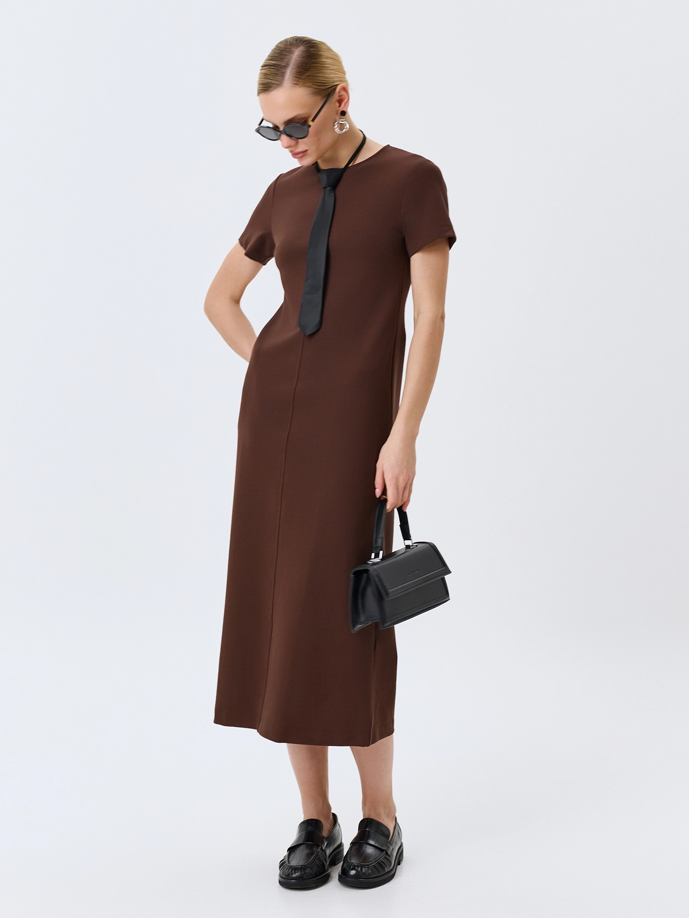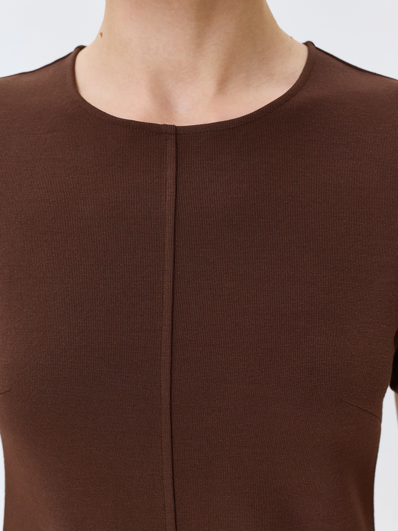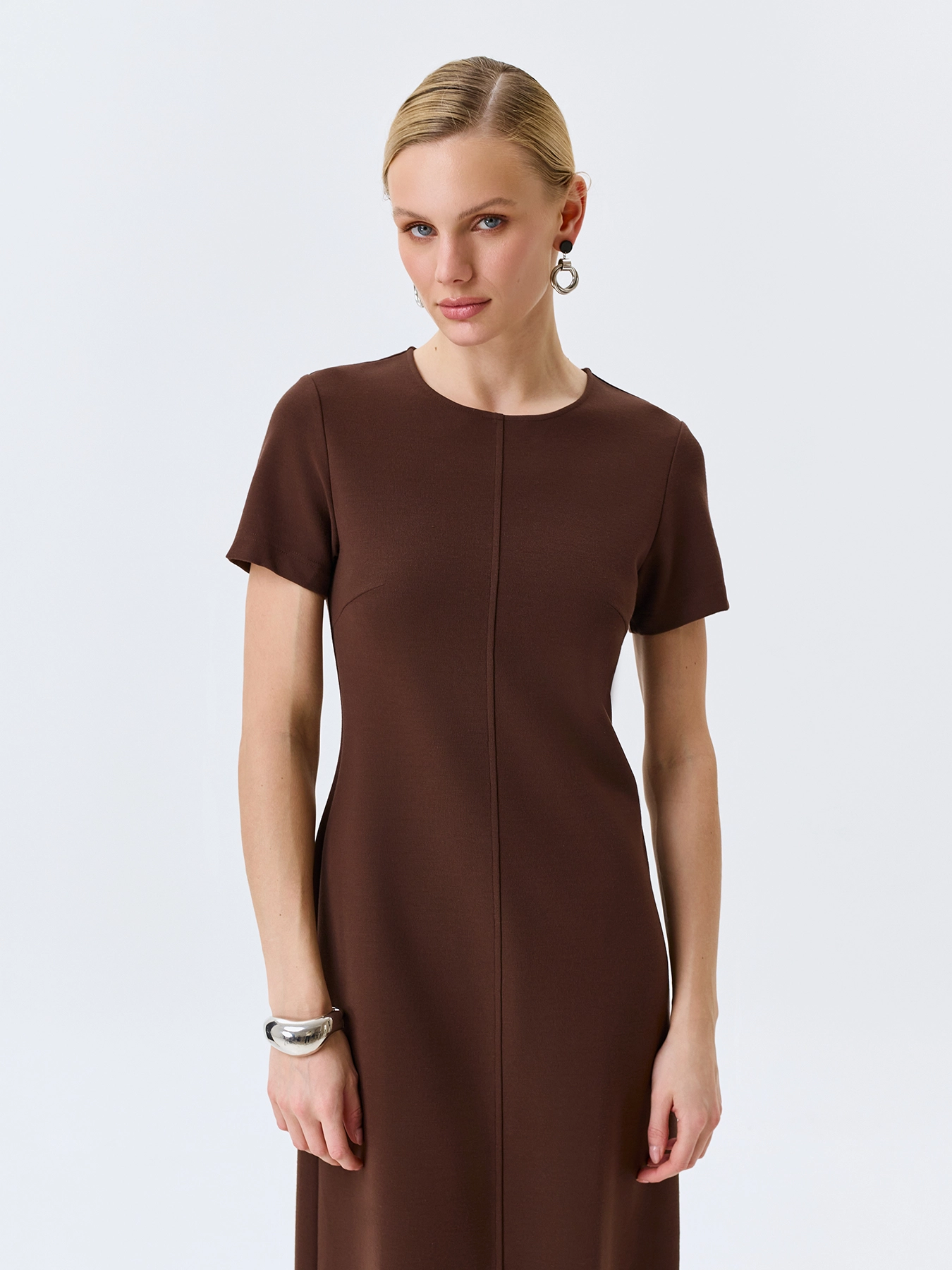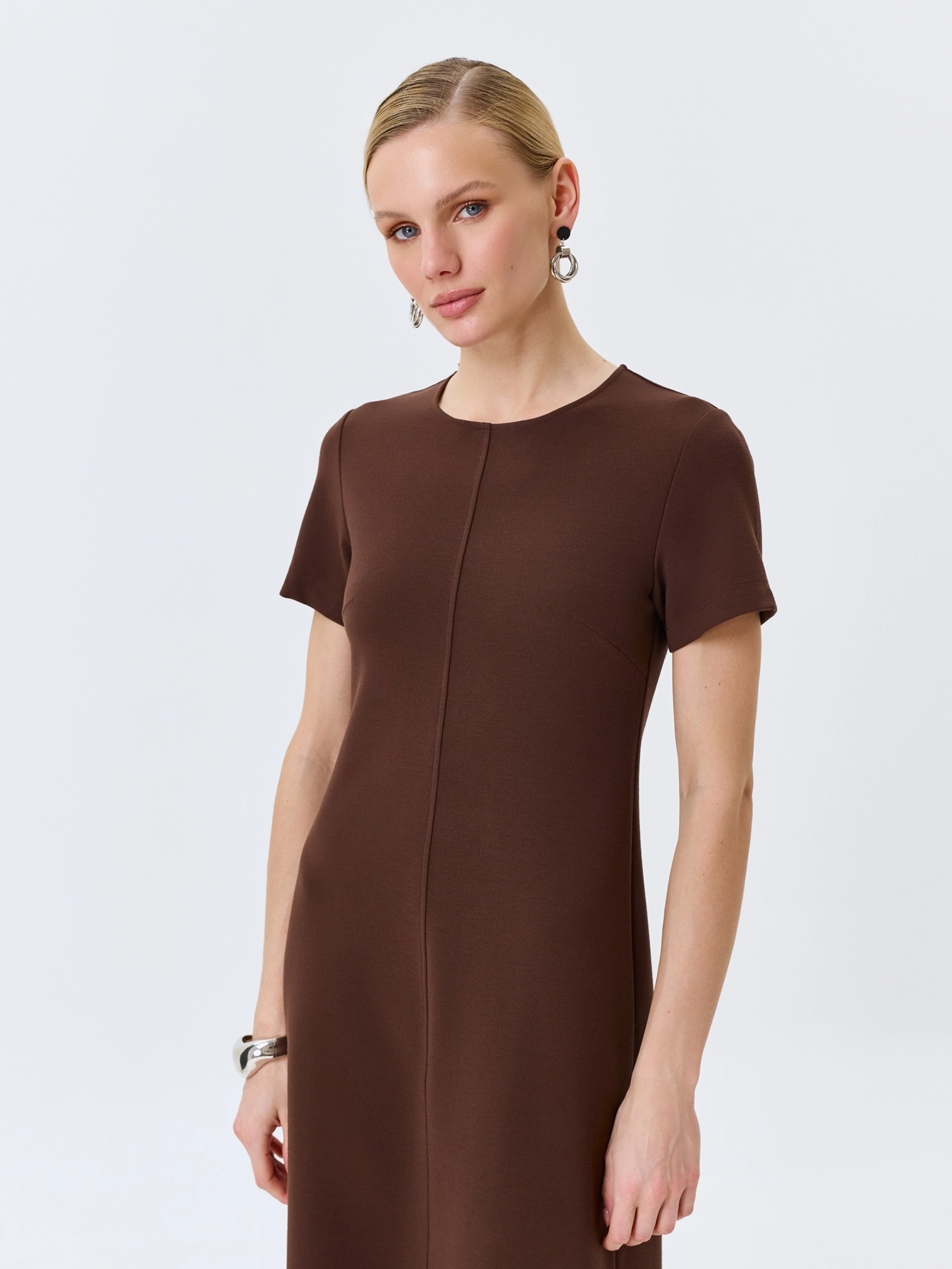 Базовое платье из смесовой вискозы и нейлона. Круглый вырез. Полуприталенный силуэт. Длина миди. Короткие втачные рукава. Застежка на потайную молнию. Дополнено вертикальным швом.