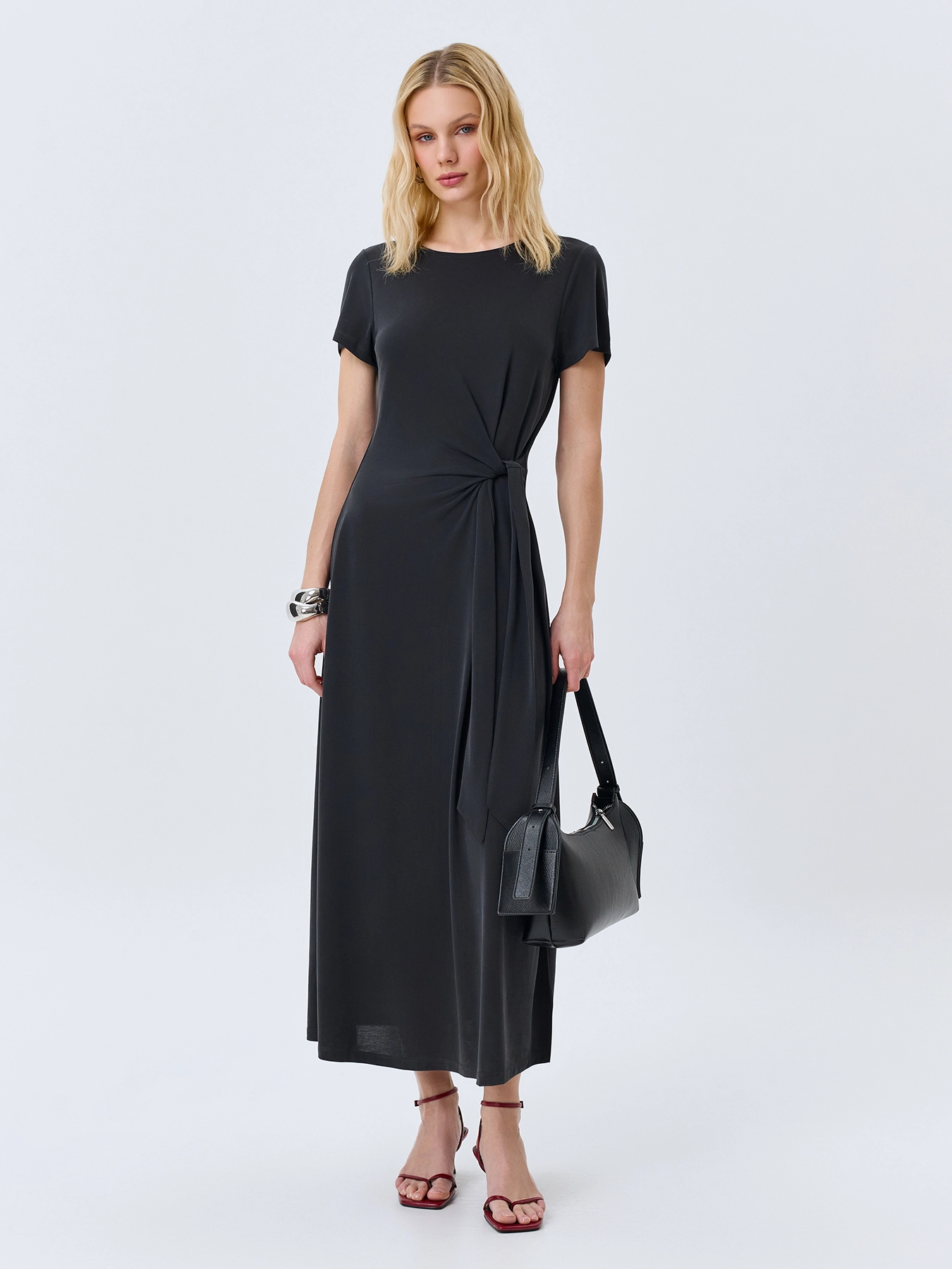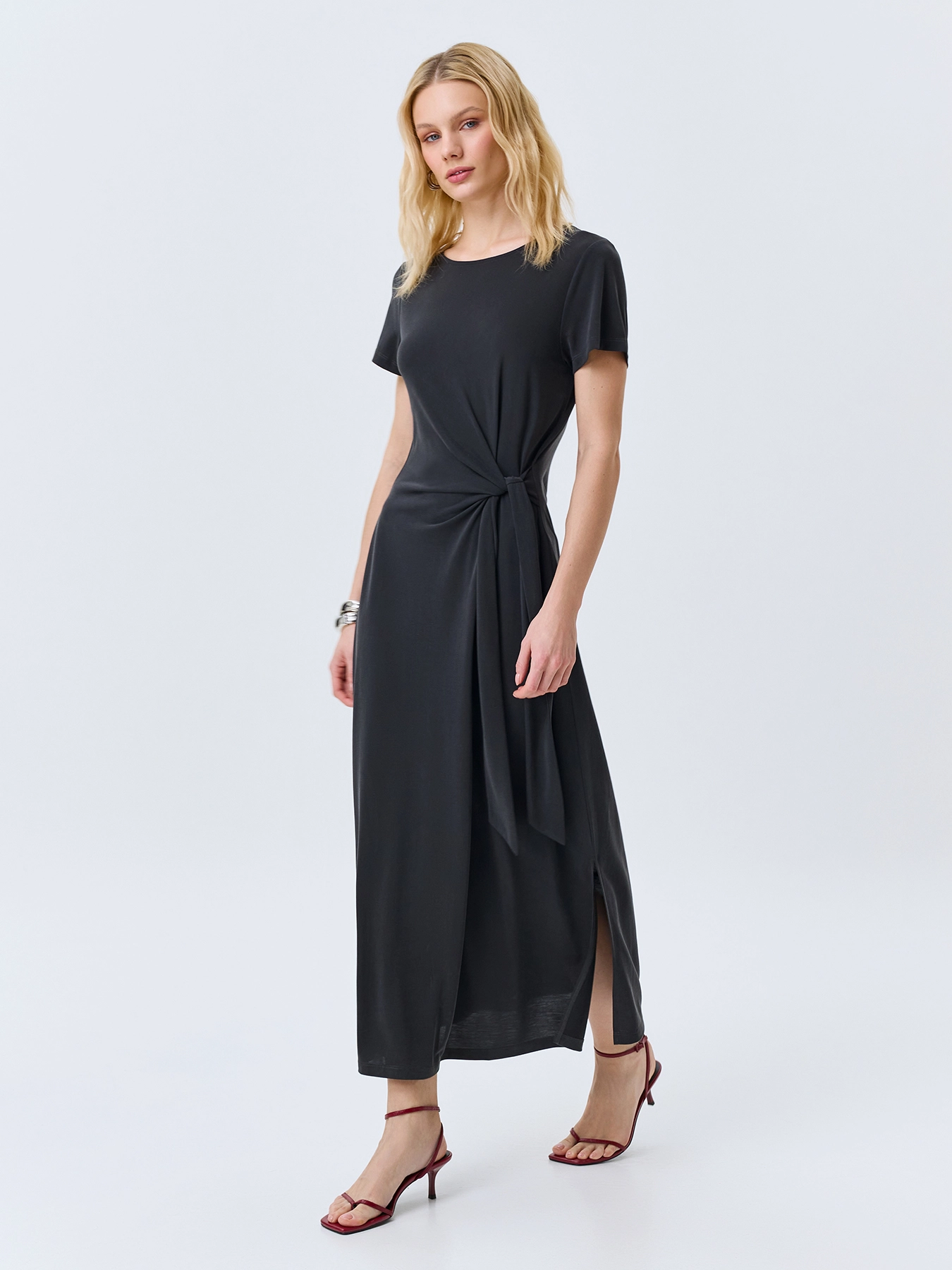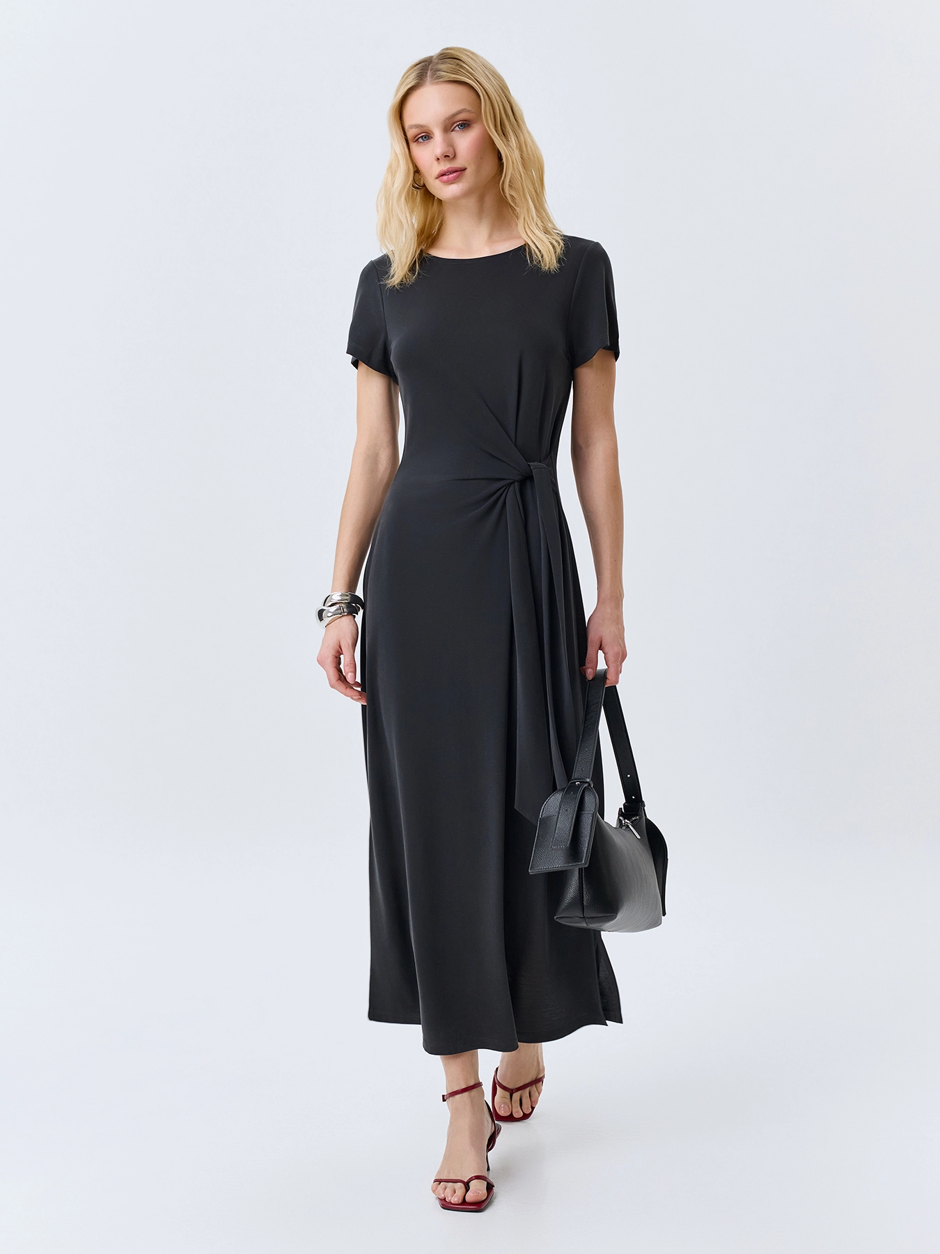 Элегантное платье-миди с акцентной драпировкой по линии талии. Приталенный силуэт. Круглый вырез. Короткие втачные рукава. Высокие разрезы в боковых швах. В составе модал.