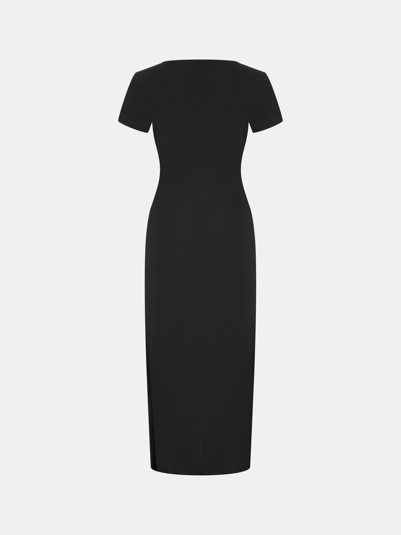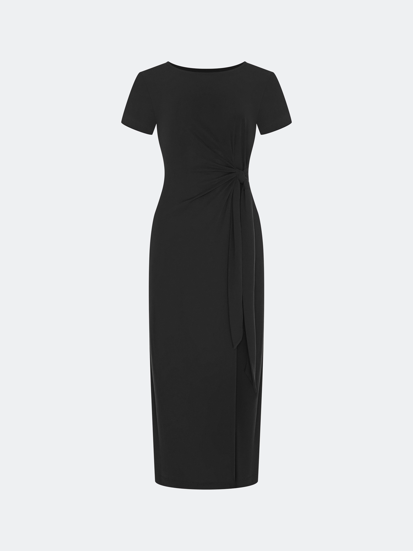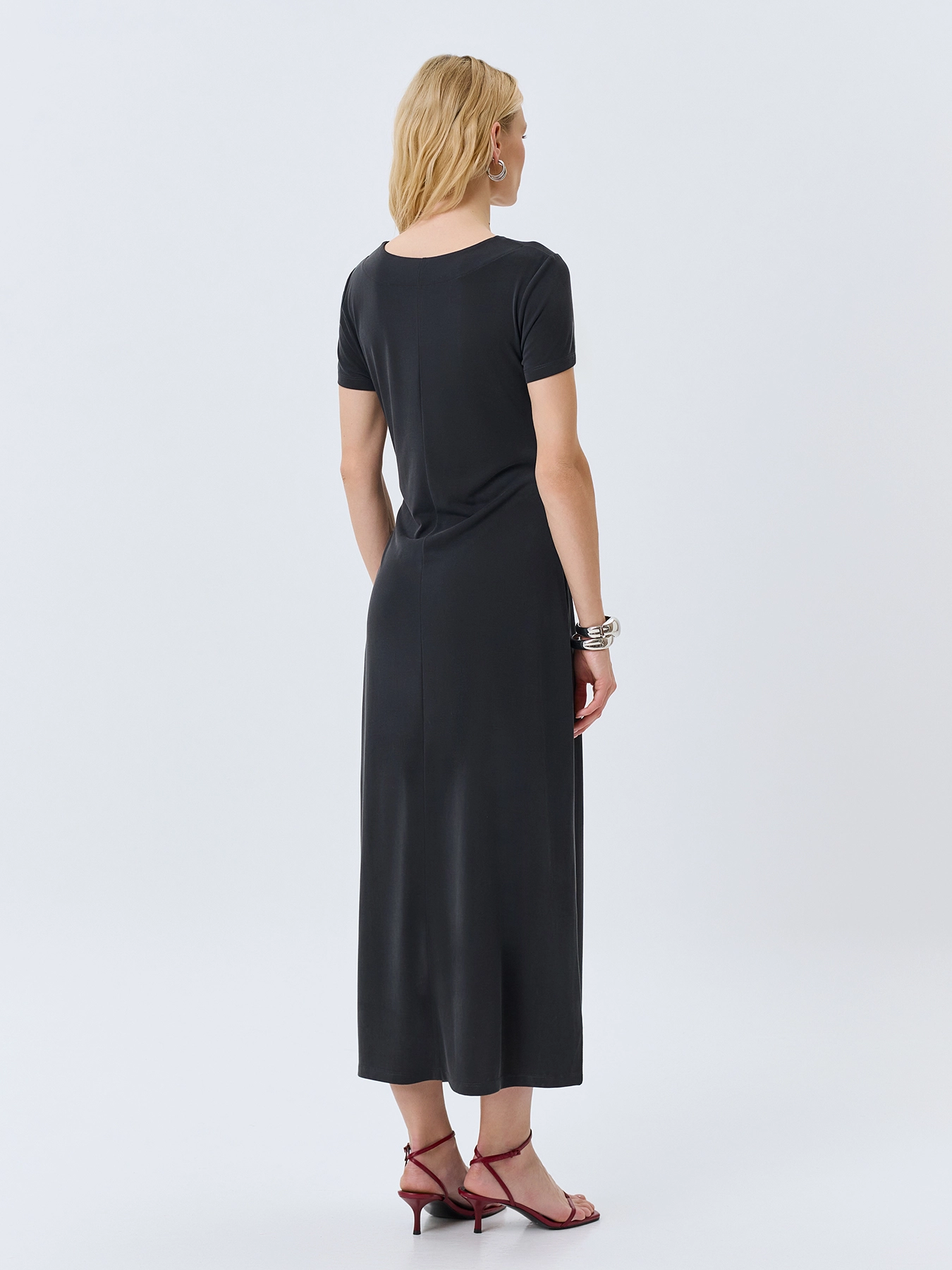 Элегантное платье-миди с акцентной драпировкой по линии талии. Приталенный силуэт. Круглый вырез. Короткие втачные рукава. Высокие разрезы в боковых швах. В составе модал.