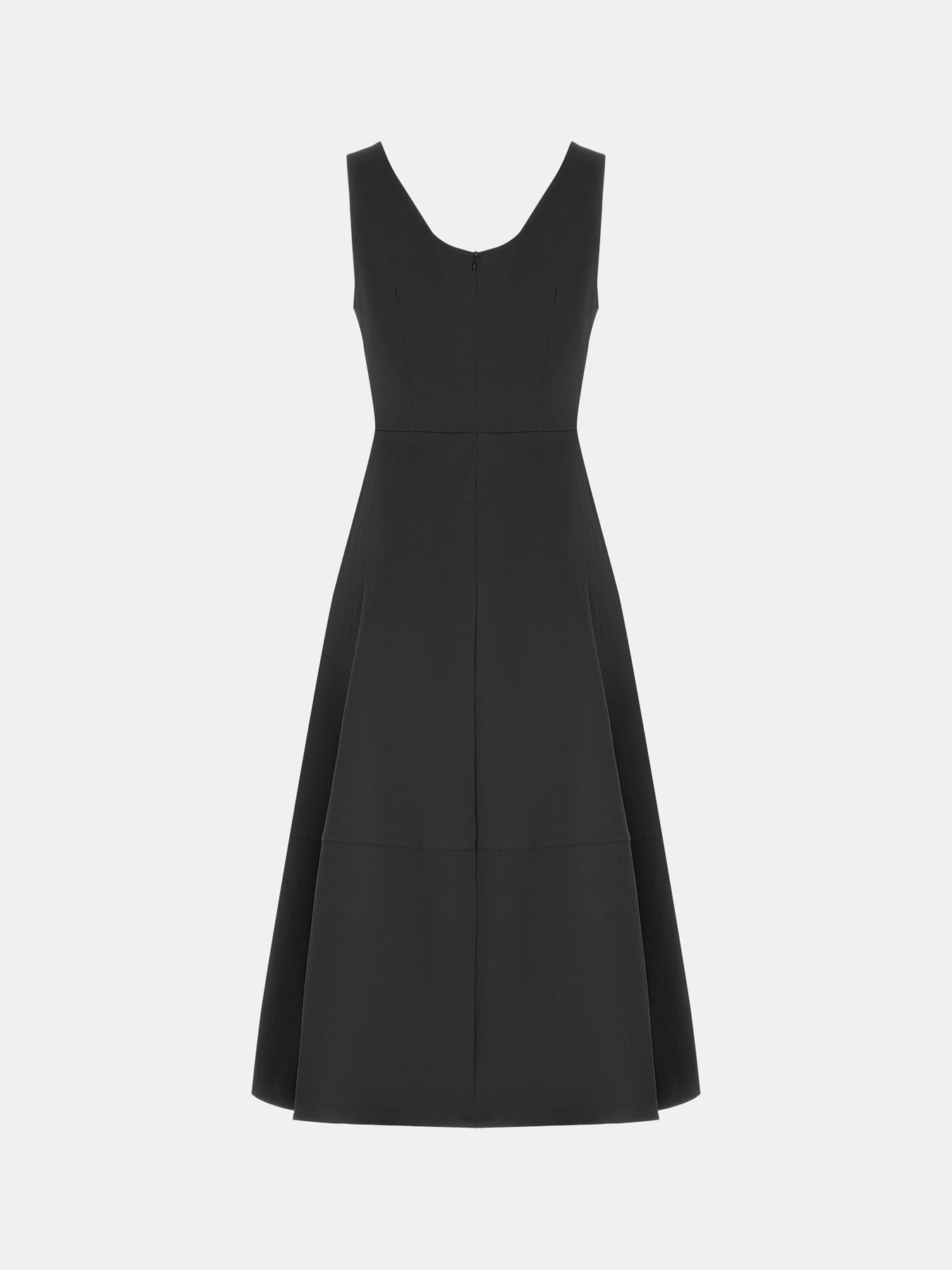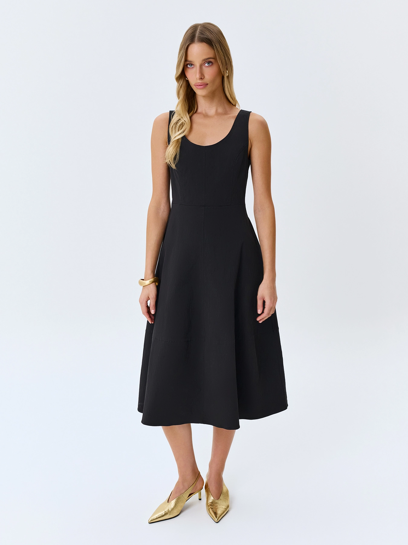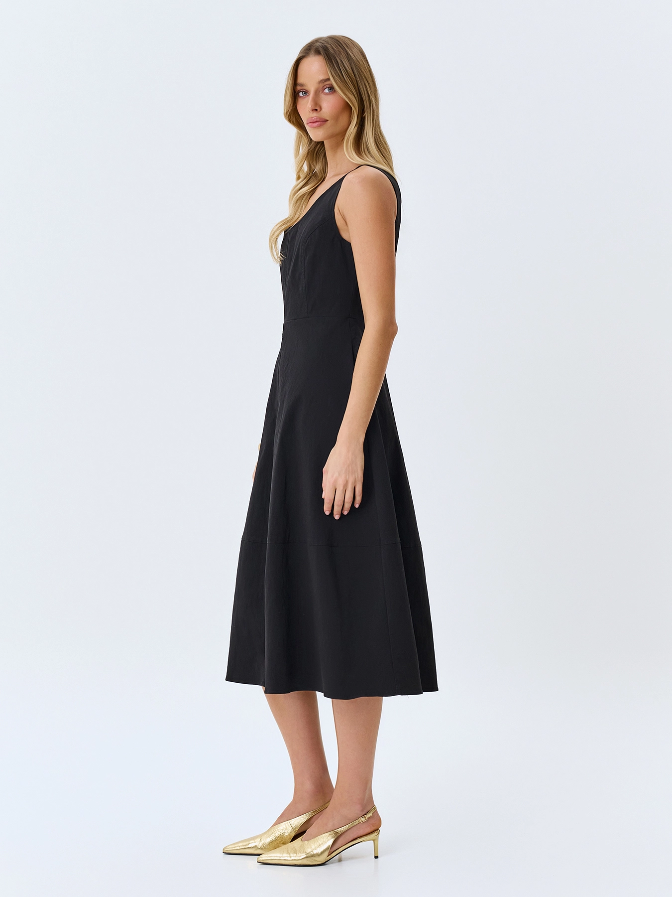 Хлопковое платье-миди приталенного силуэта. Круглый вырез с широкими бретелями. Застежка на потайную молнию. Юбка А-силуэта. Подкладка из 100% хлопка.