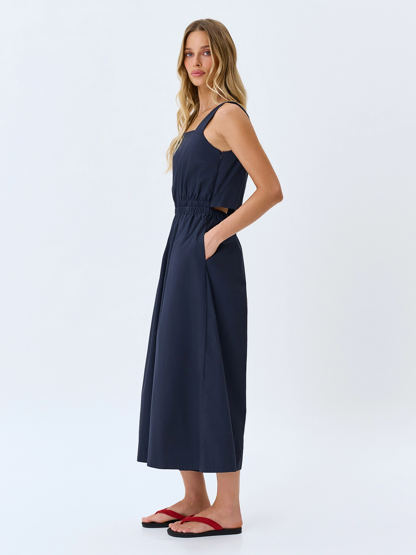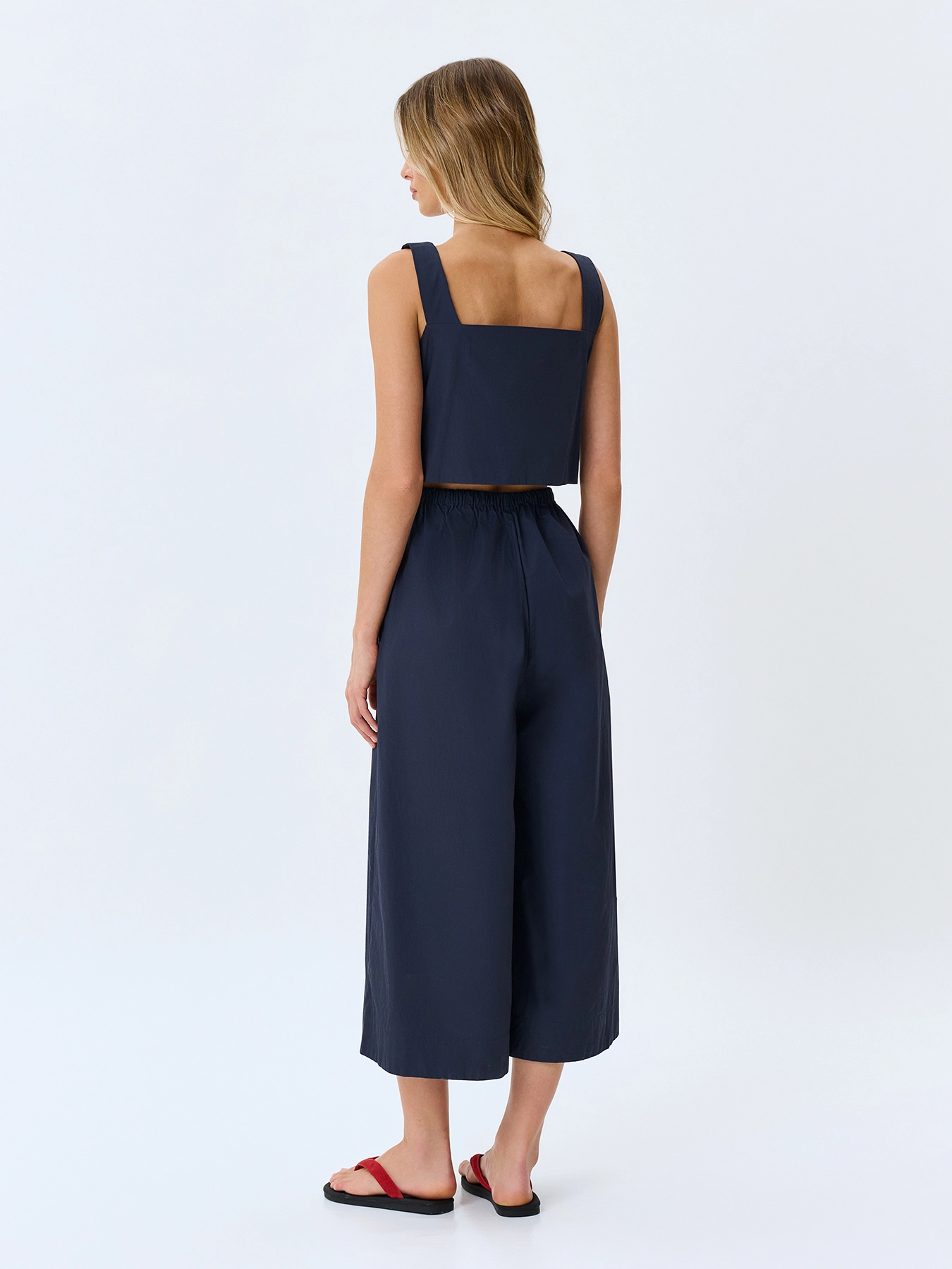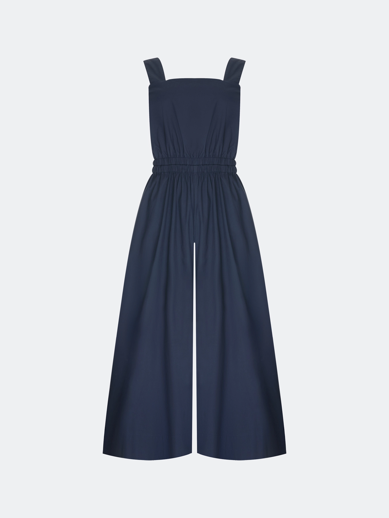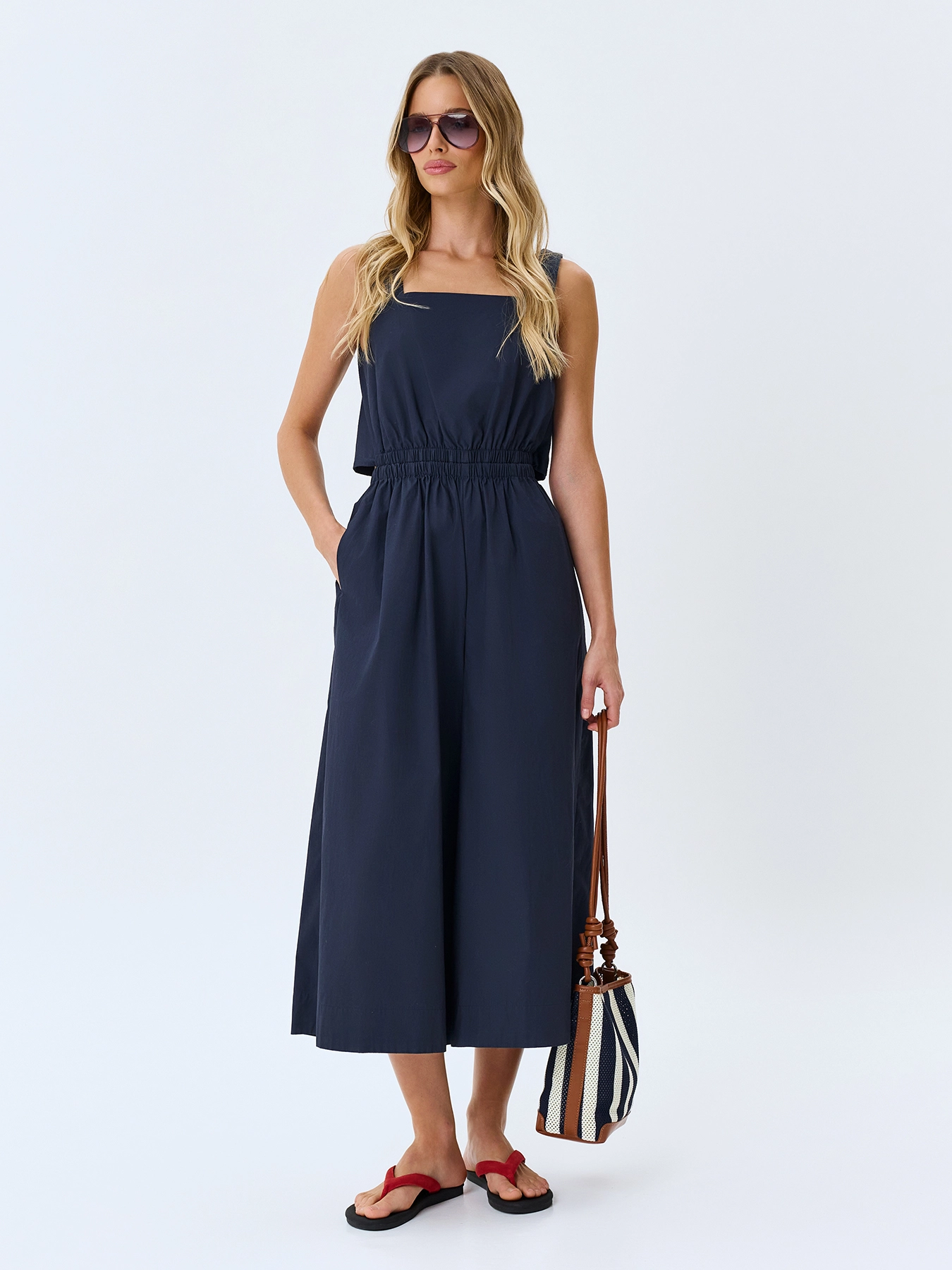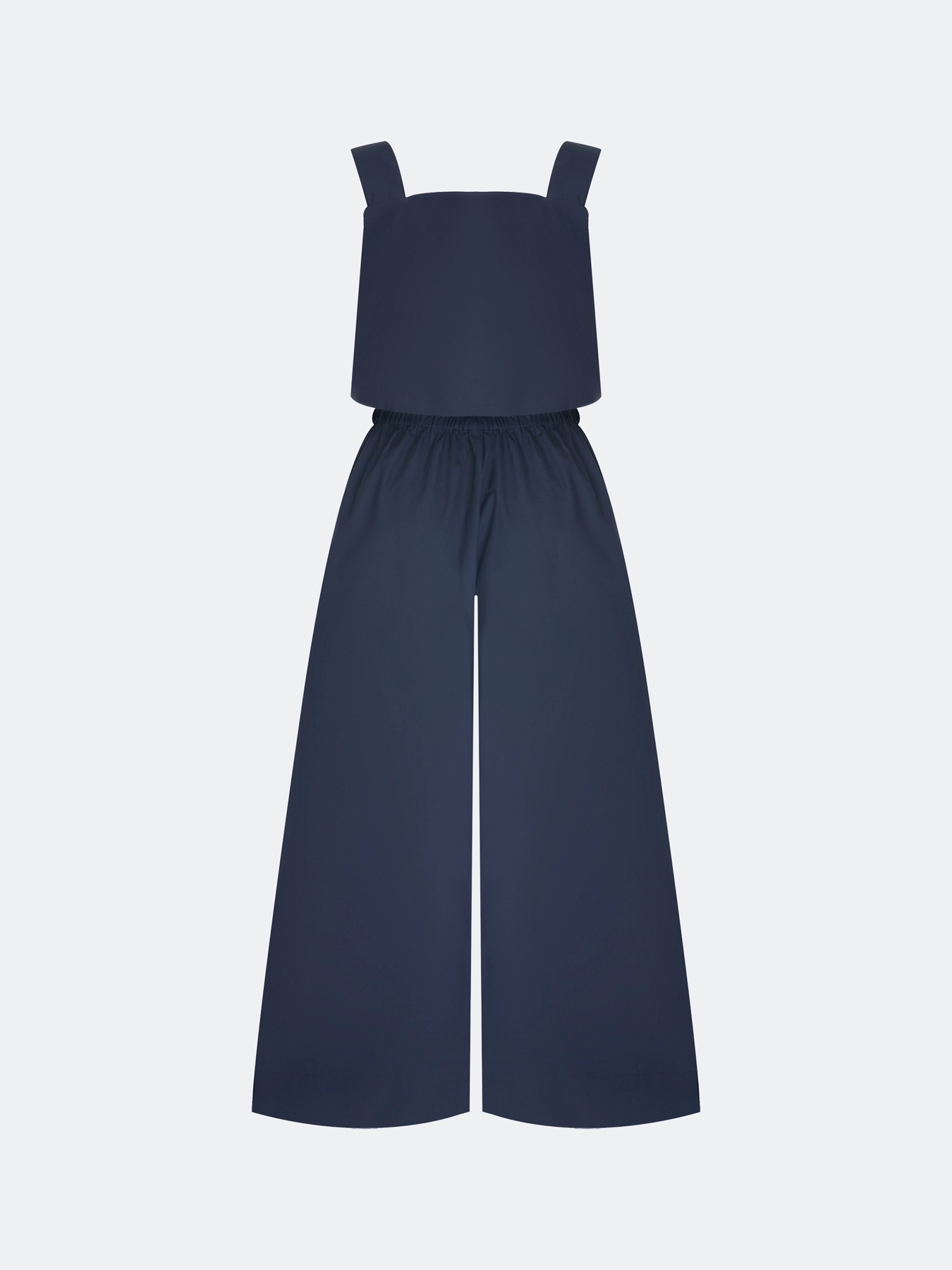 Комбинезон из 100% хлопка. Полуприталенный силуэт. Квадратный вырез с широкими бретелями. Резинка по линии талии. Застежка на потайную молнию. Брюки широкие укороченные палаццо. Боковые карманы в швах. Дополнен акцентным вырезом по спинке.