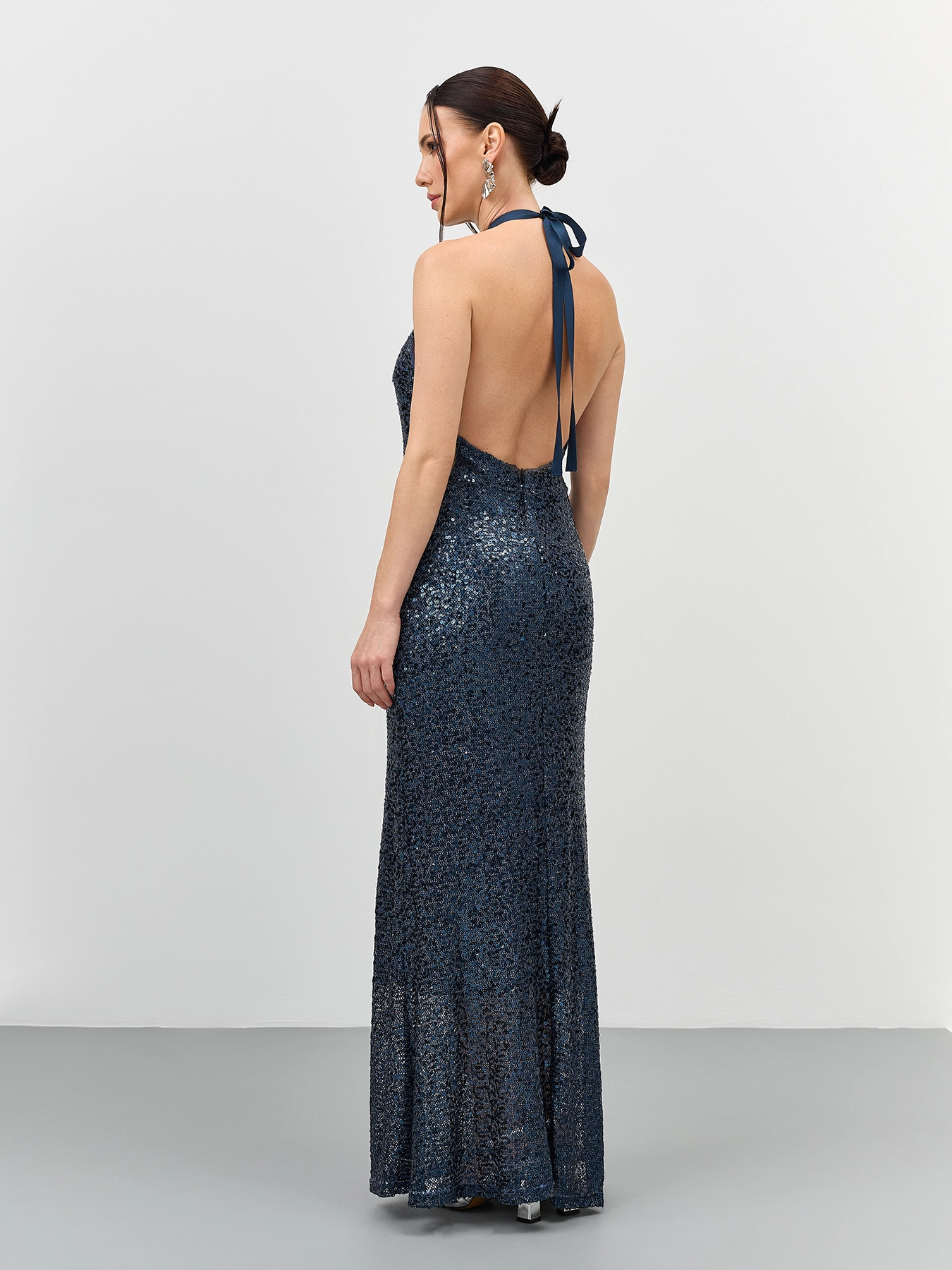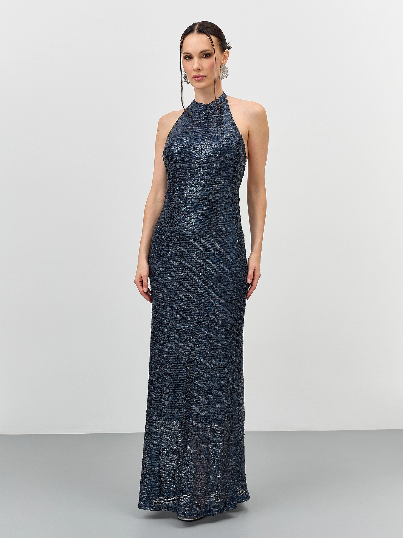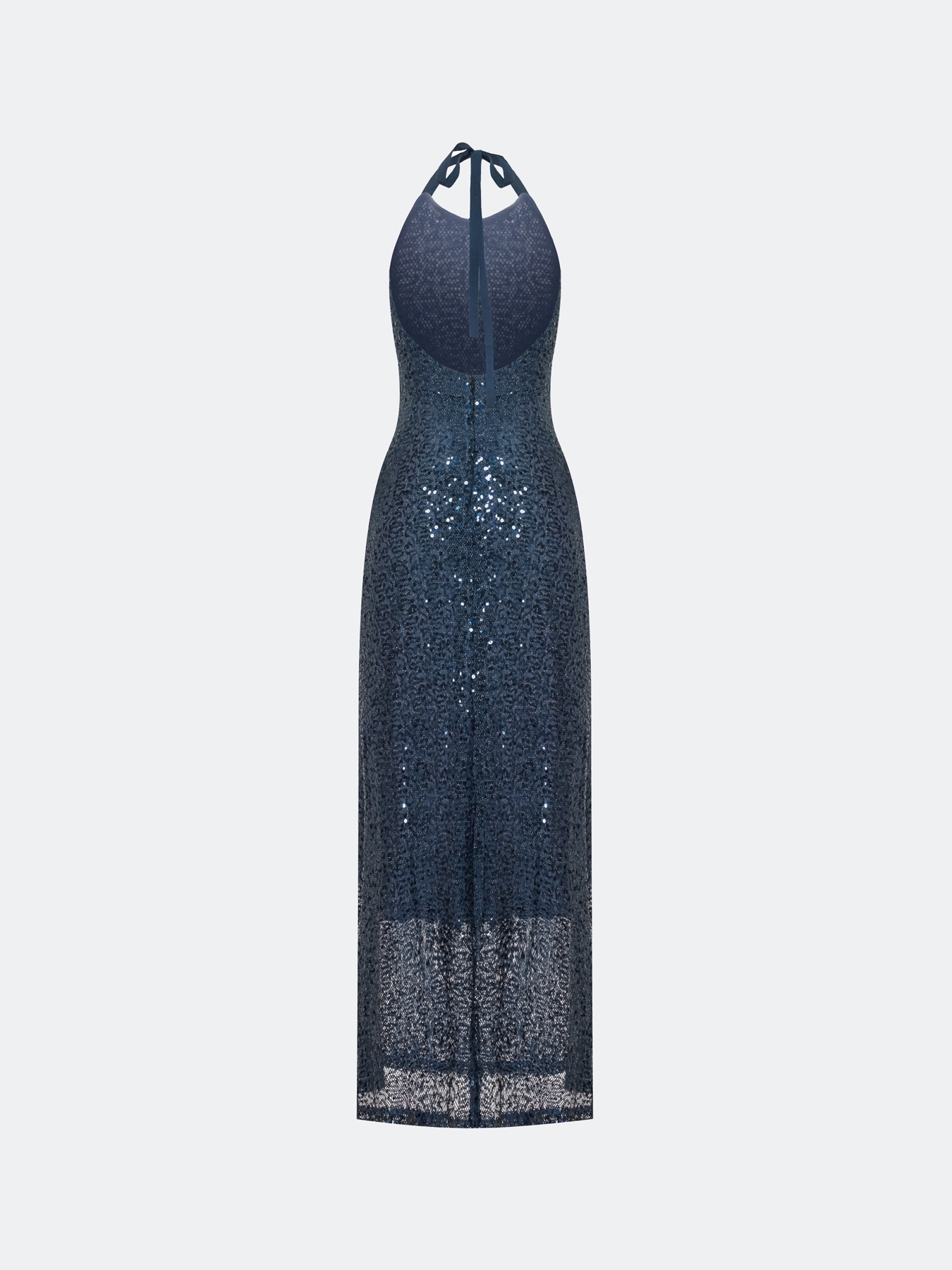 Эффектное платье с открытой спиной из трикотажа с мерцающими пайетками. Длина макси. Приталенный силуэт. Воротник халтер дополнен лентой сзади. Застежка на молнию. Дополнено шелковистой подкладкой.