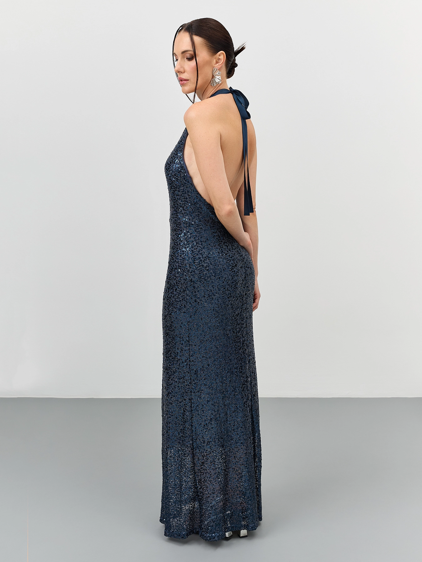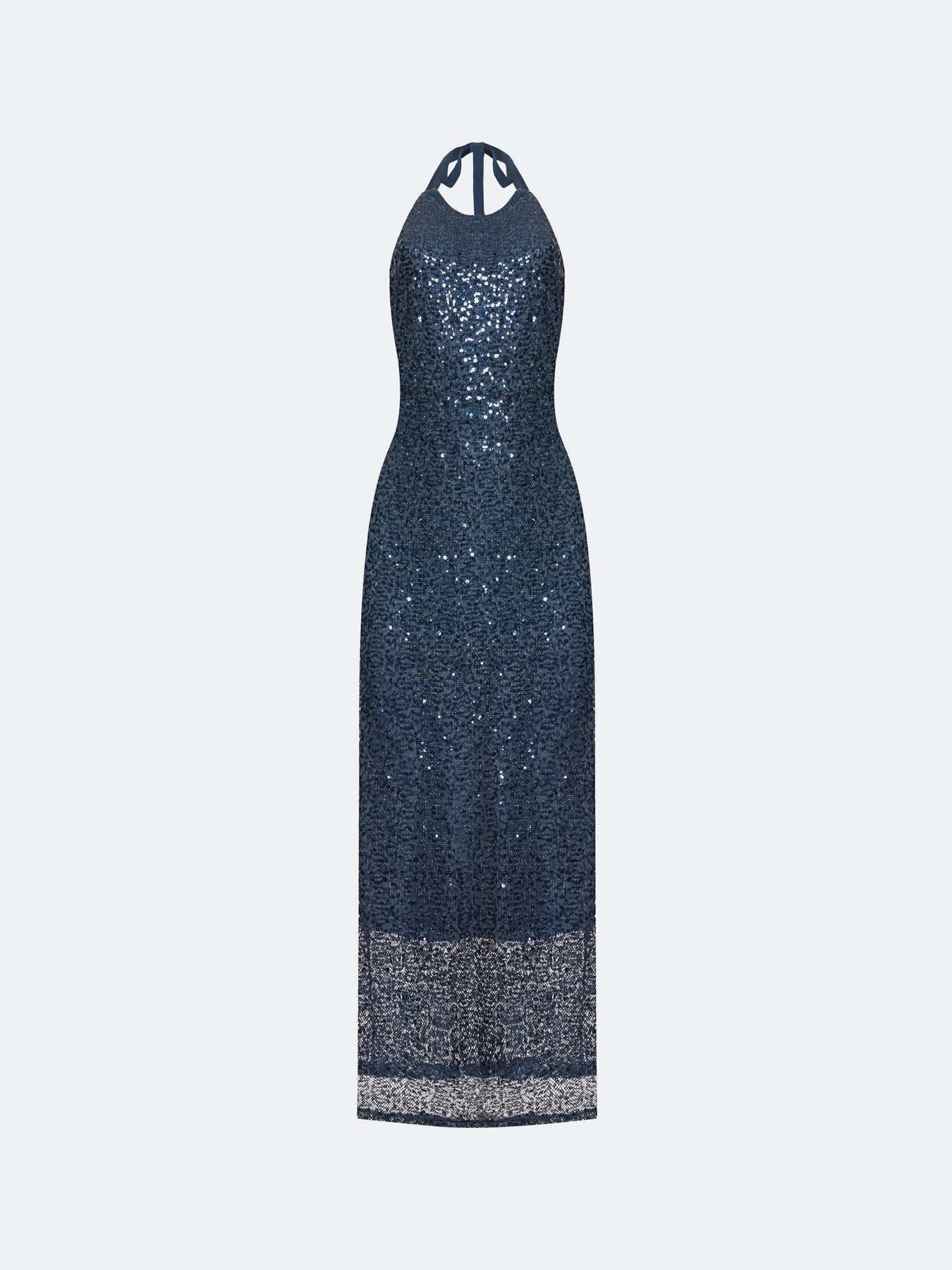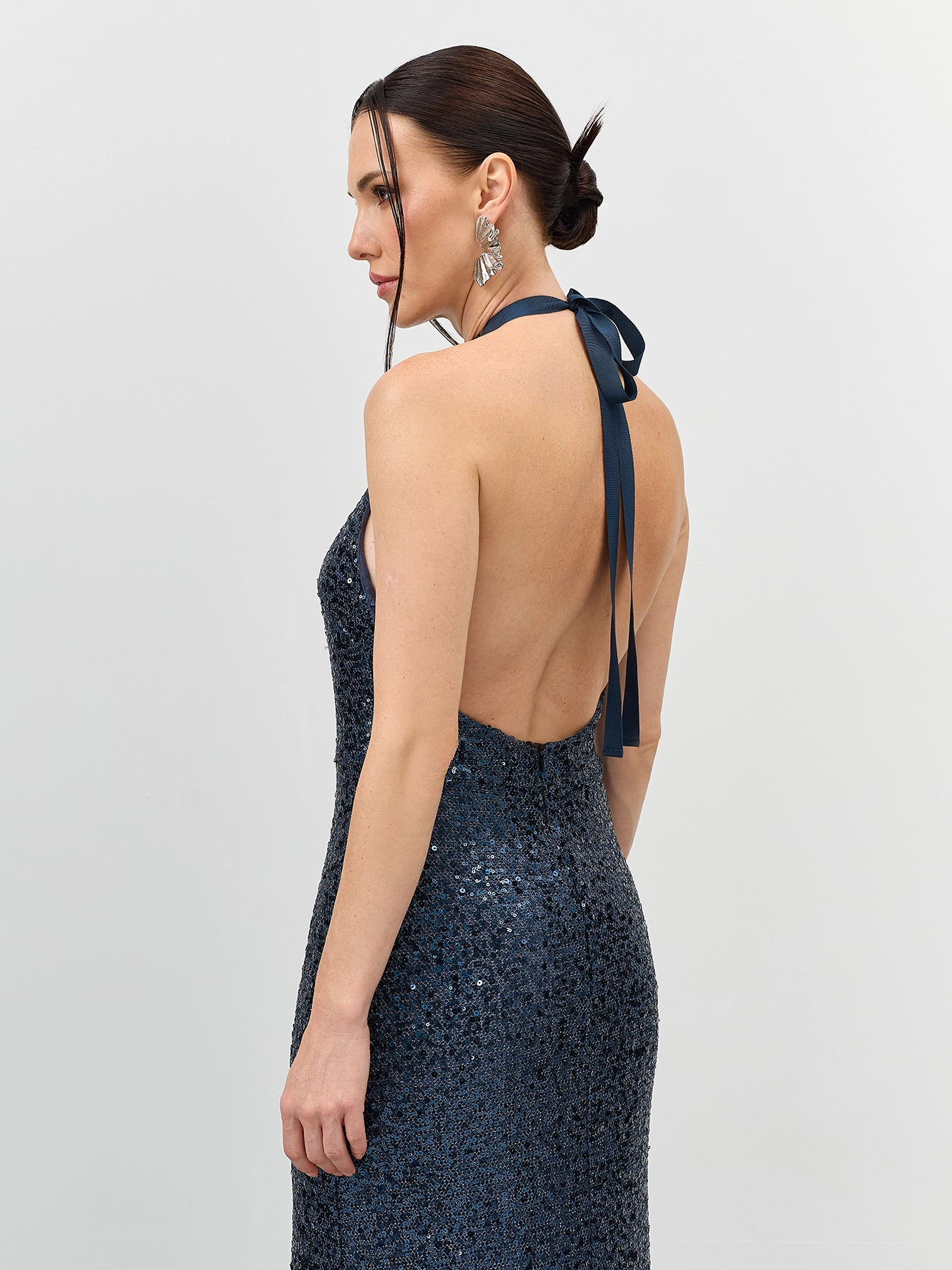 Эффектное платье с открытой спиной из трикотажа с мерцающими пайетками. Длина макси. Приталенный силуэт. Воротник халтер дополнен лентой сзади. Застежка на молнию. Дополнено шелковистой подкладкой.
