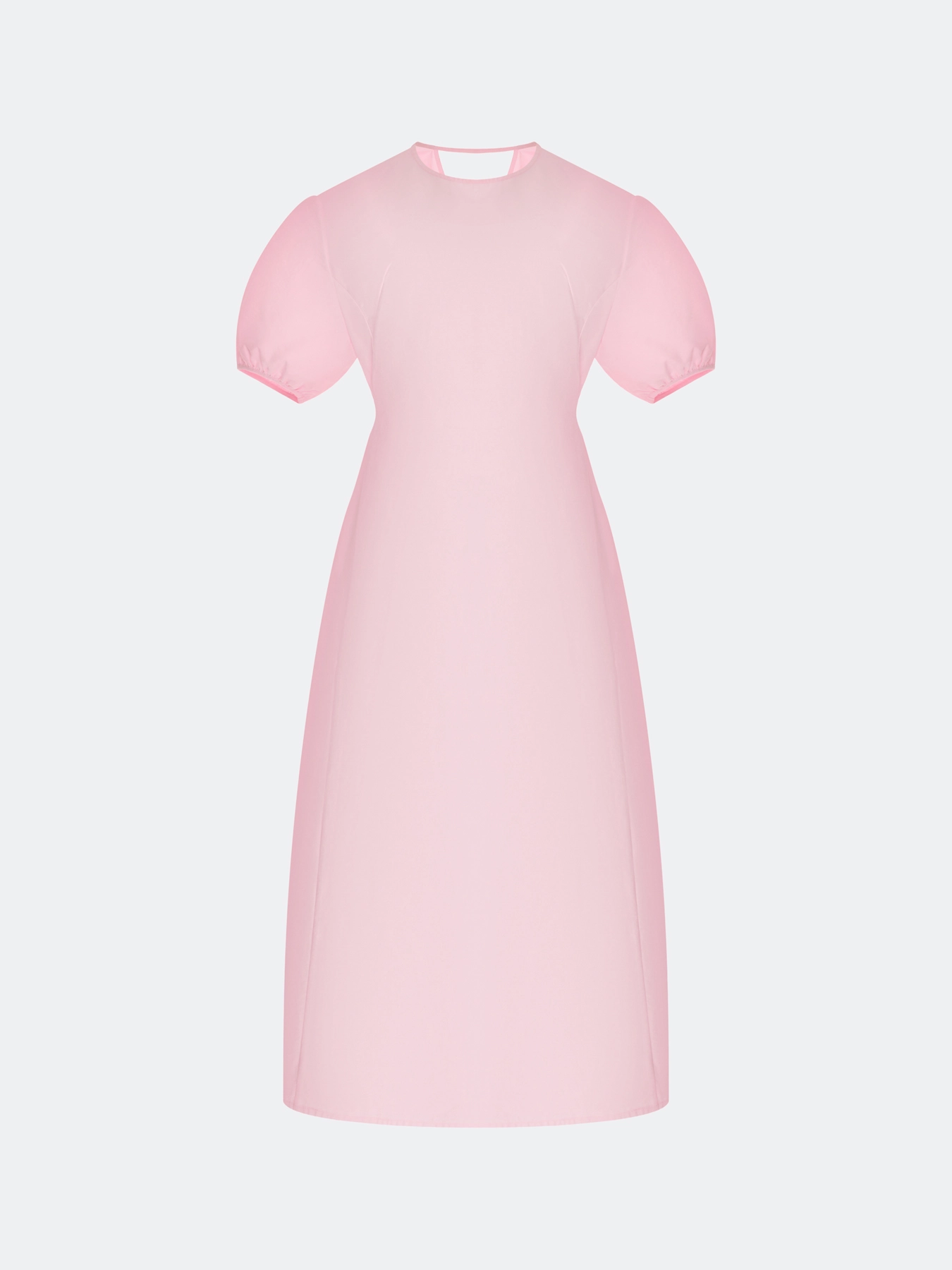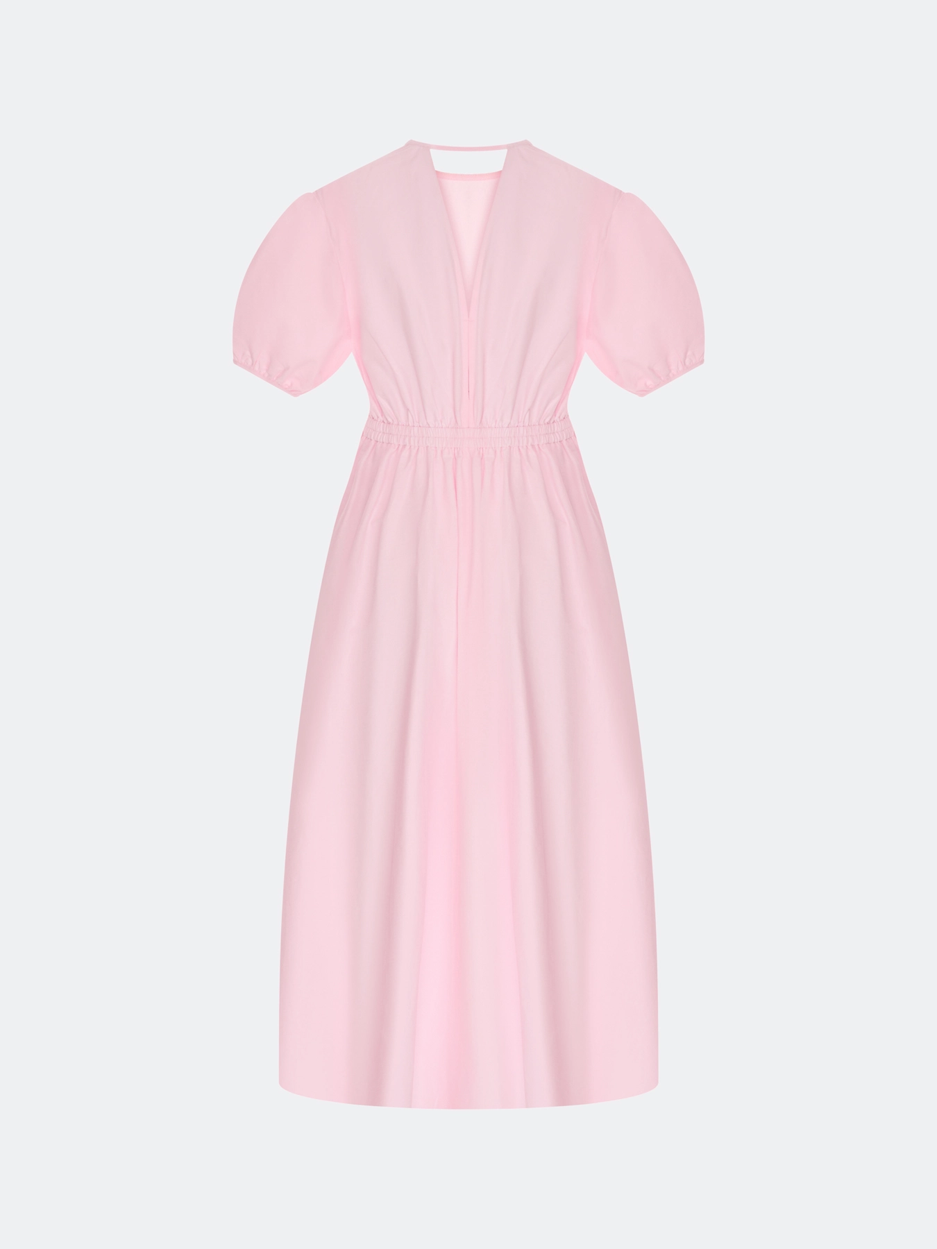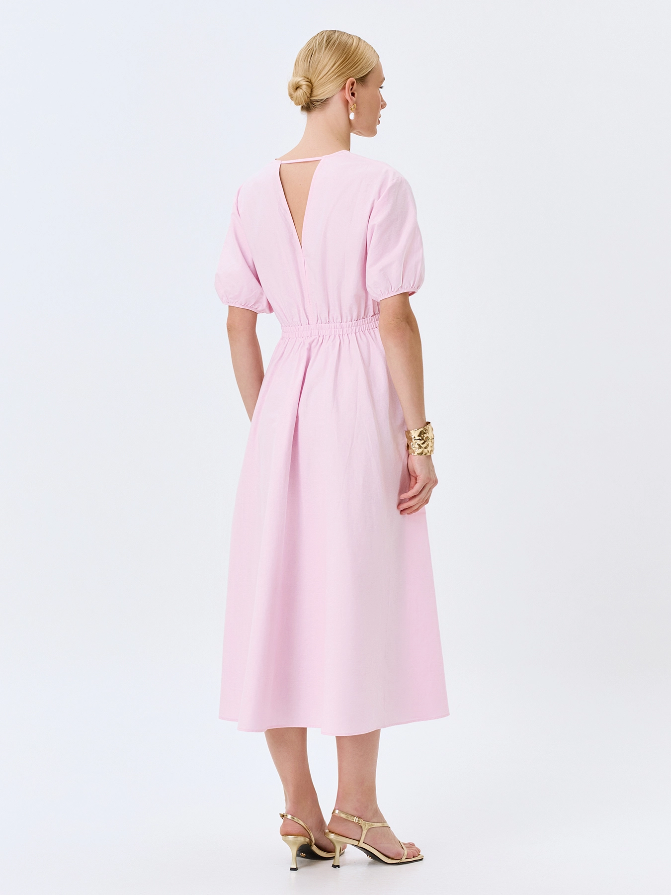 Платье-макси из хлопка. Полуприталенный силуэт. Юбка А-силуэта. Боковые карманы в швах. Круглый вырез. Короткие рукава-фонарики с резинкой по низу. Дополнено сборкой по спинке и акцентным V-образным вырезом сзади.