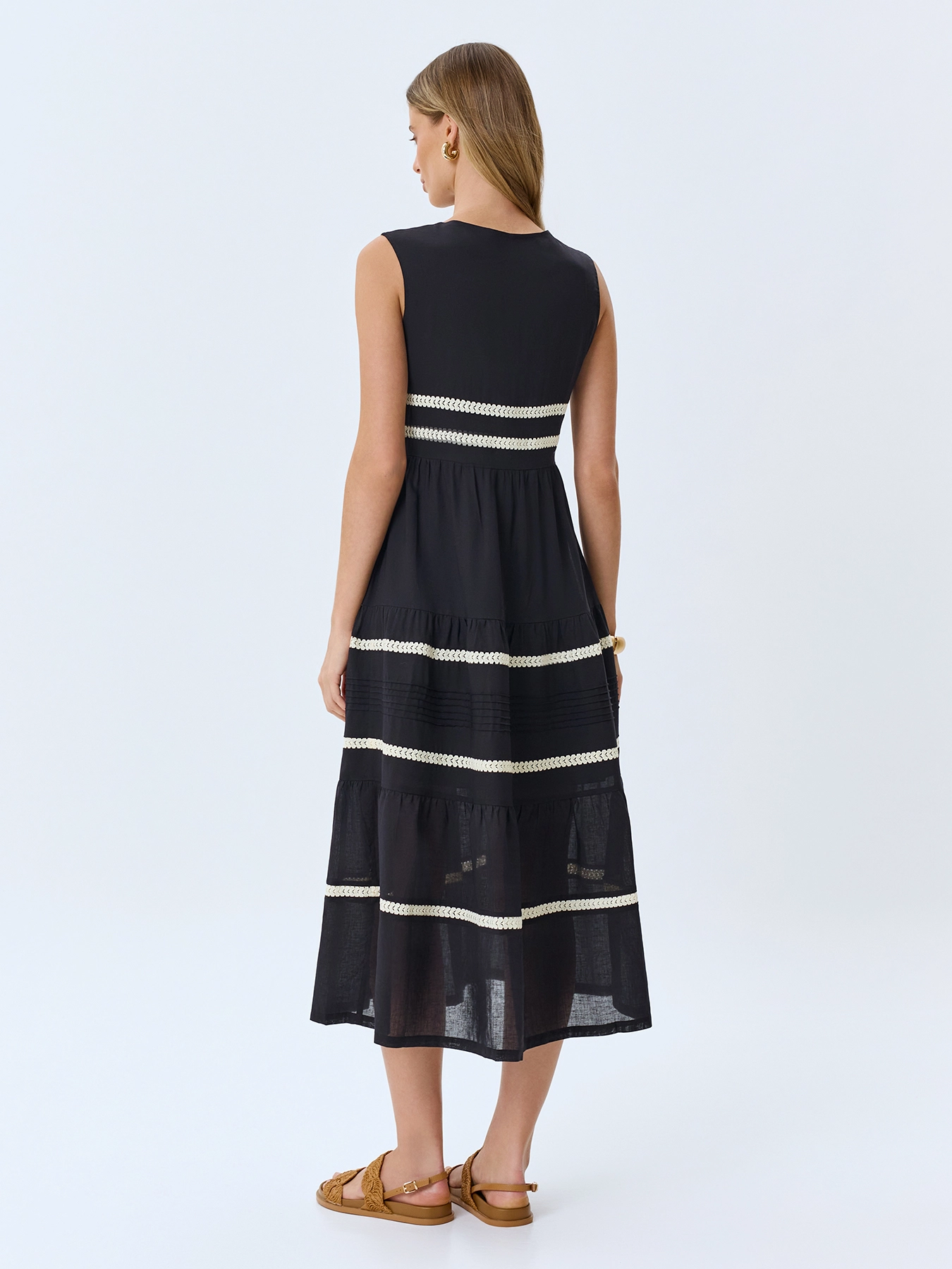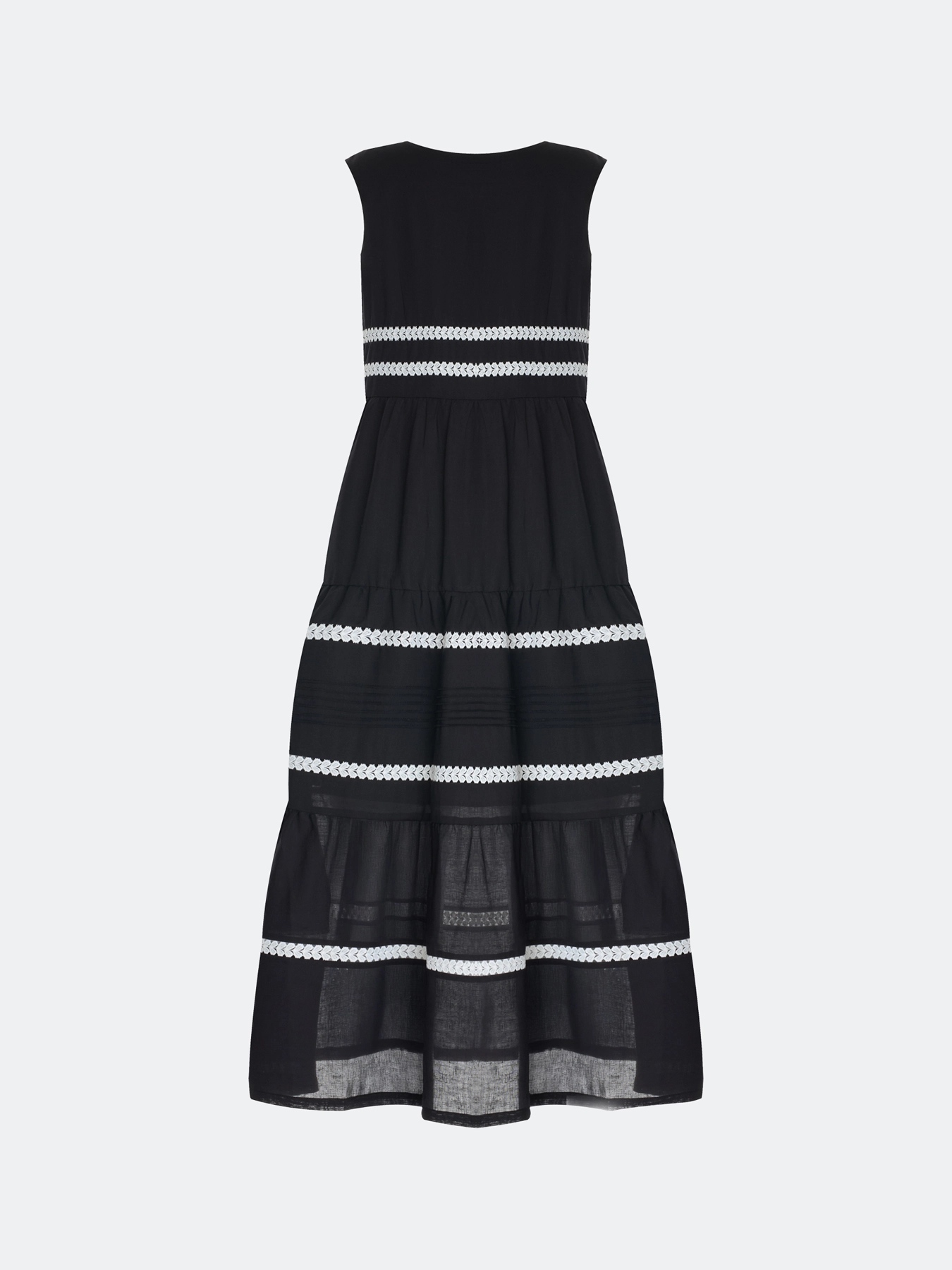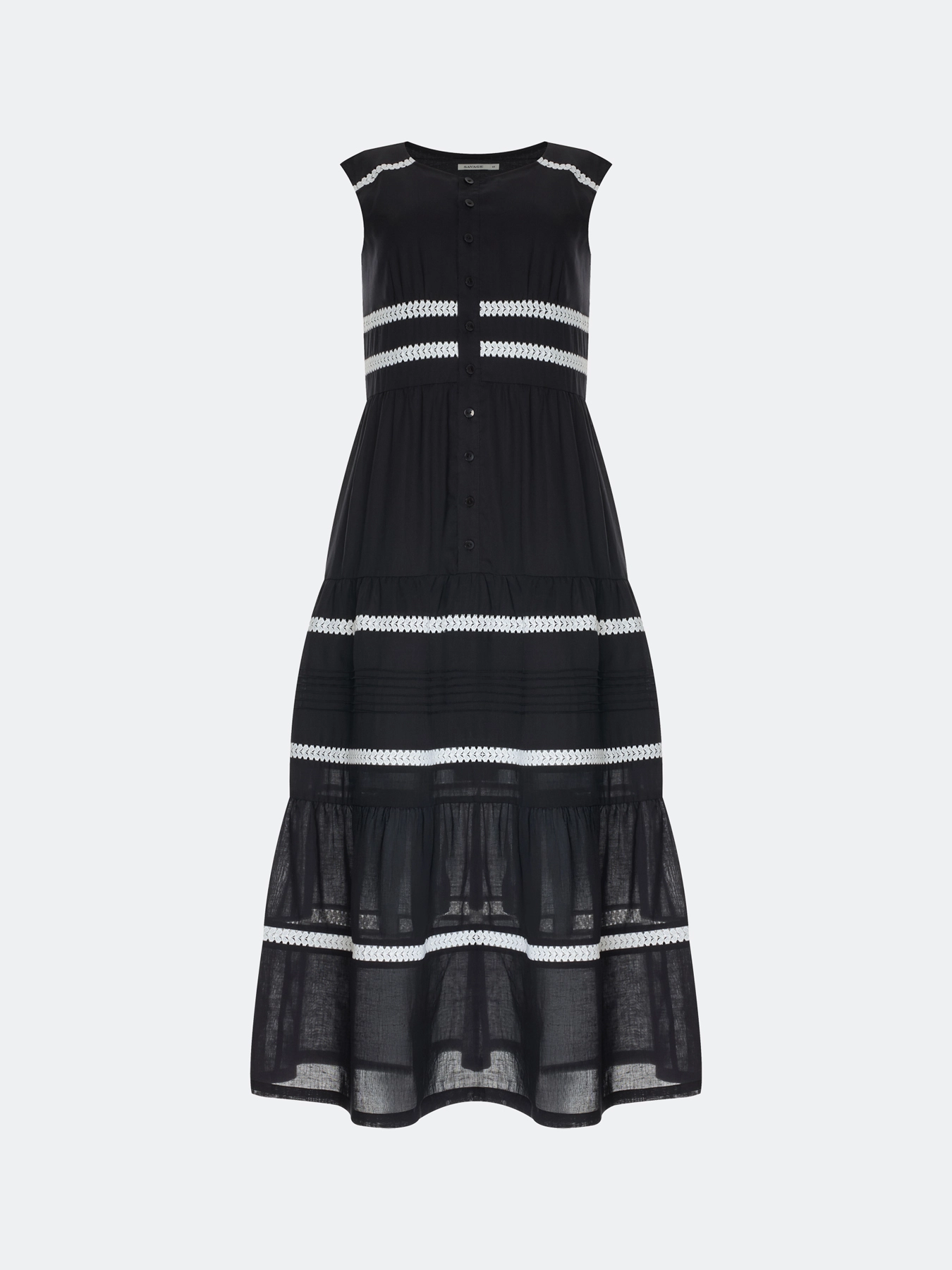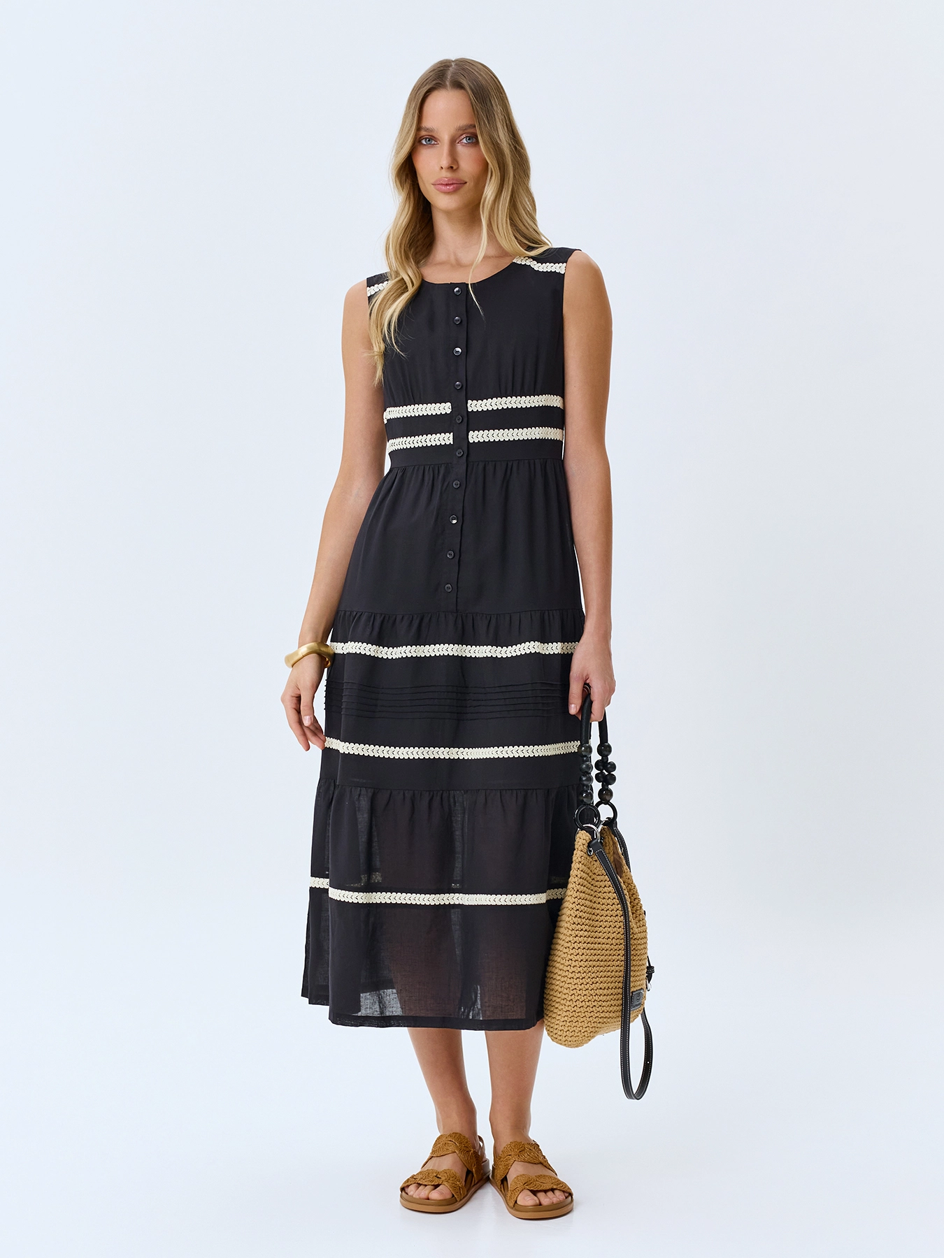 Летящее ярусное платье-миди из тенселя и льна. Свободный силуэт. Круглый вырез. Застежка на пуговицы. Юбка А-силуэта с ярусными оборками. Декорировано контрастной кружевной тесьмой. Подкладка из 100% хлопка.