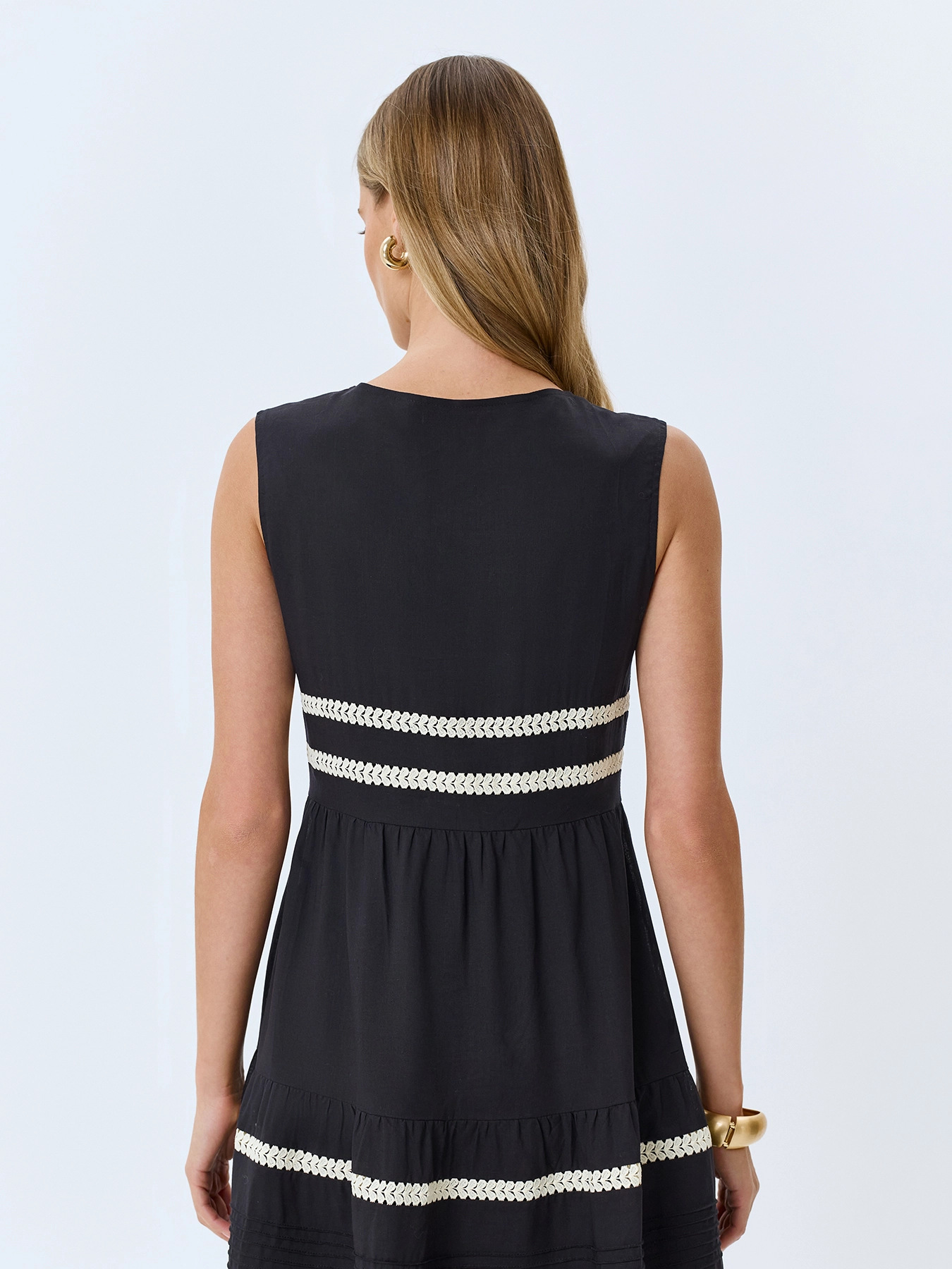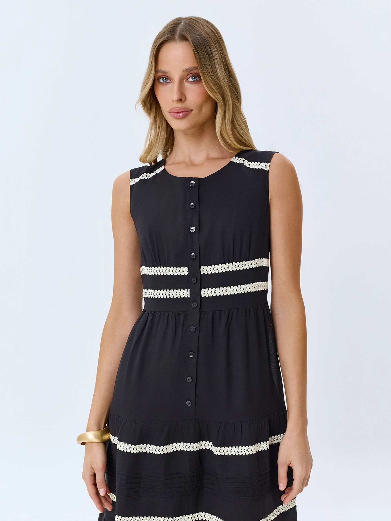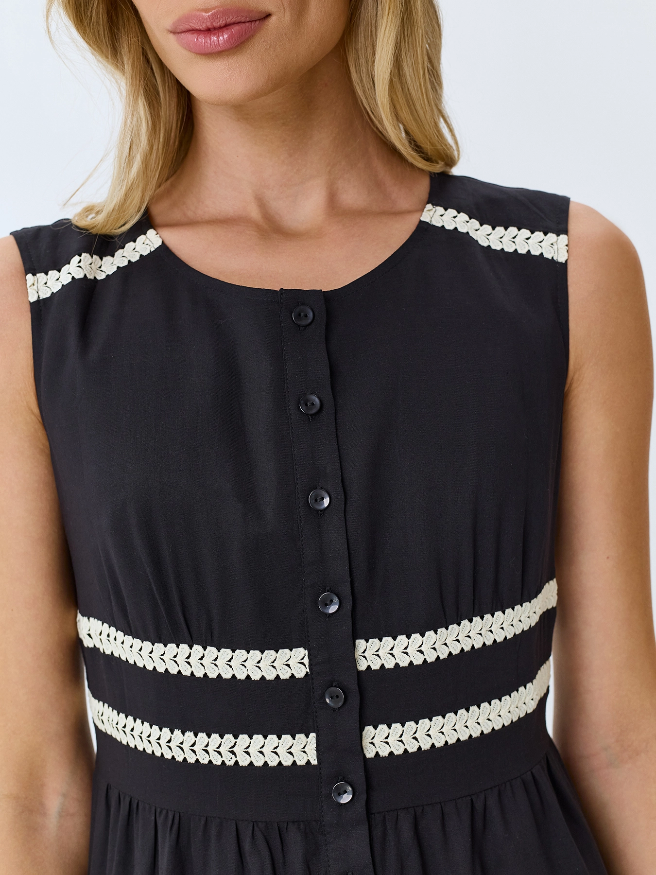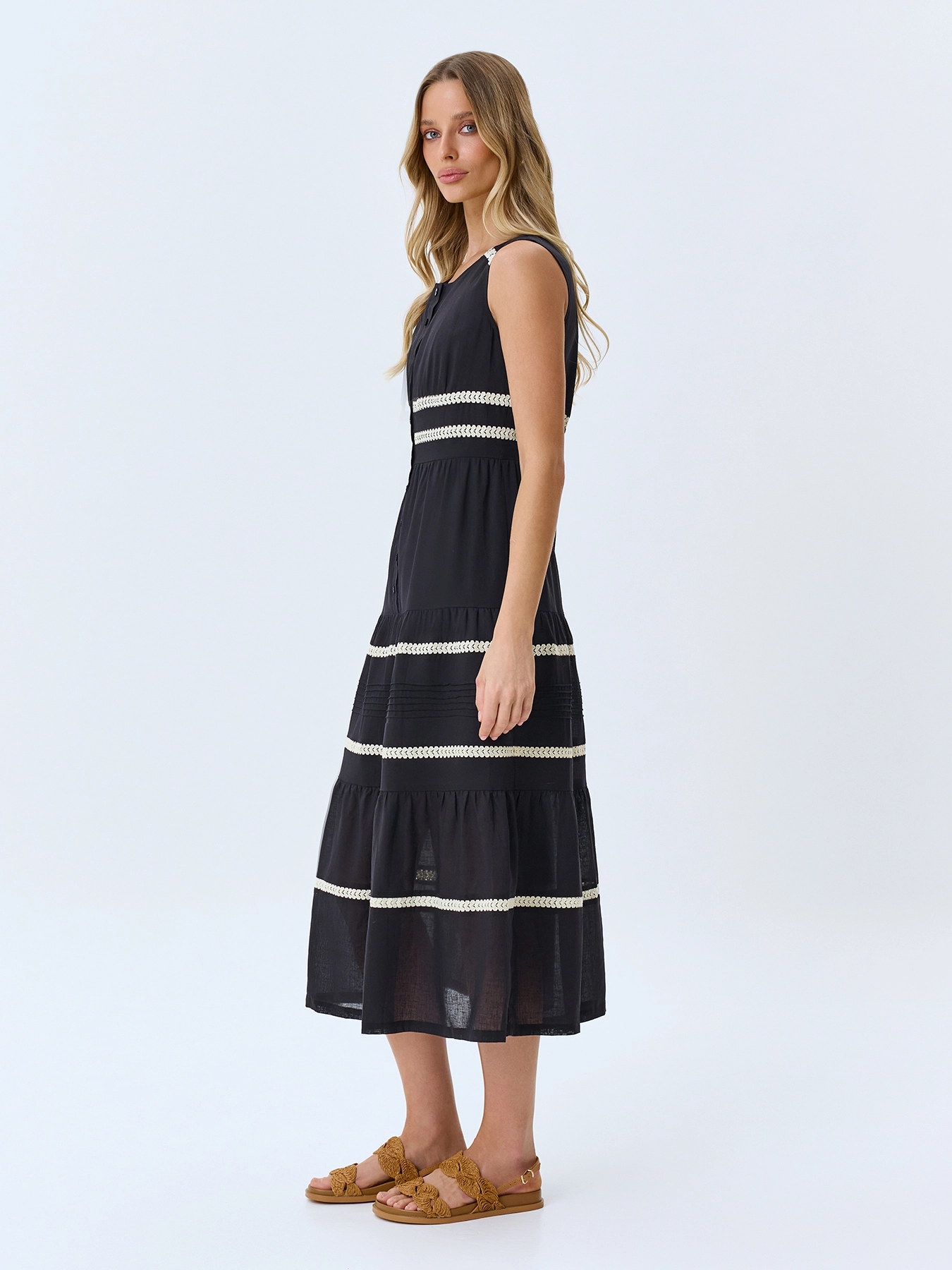 Летящее ярусное платье-миди из тенселя и льна. Свободный силуэт. Круглый вырез. Застежка на пуговицы. Юбка А-силуэта с ярусными оборками. Декорировано контрастной кружевной тесьмой. Подкладка из 100% хлопка.