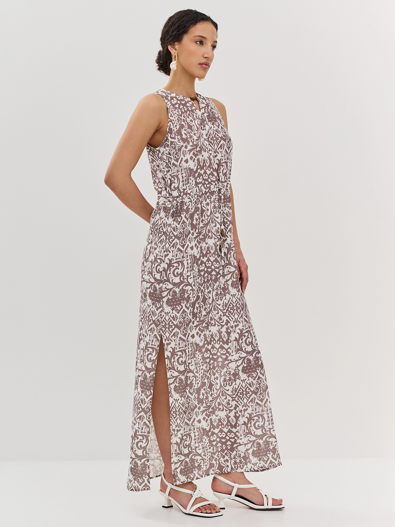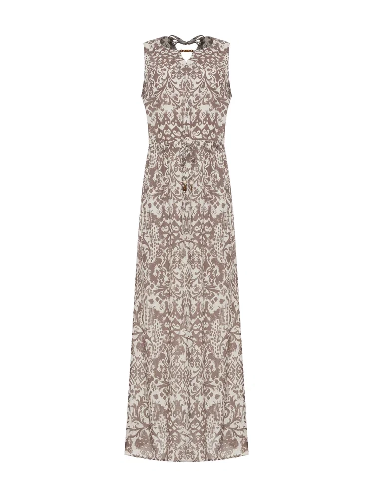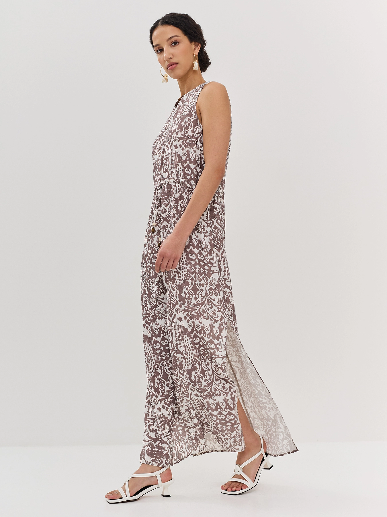 Свободный прямой силуэт, украшенный этническим принтом с цветами и растениями, придает модели особый шарм и делает его универсальным.