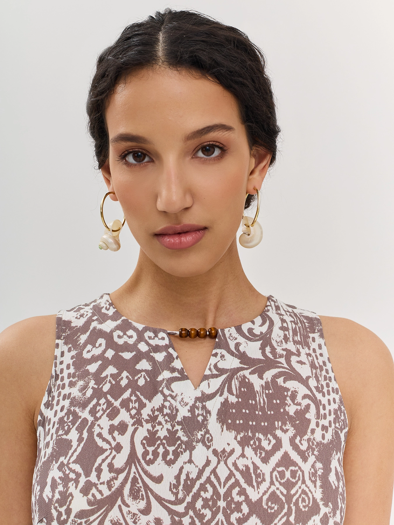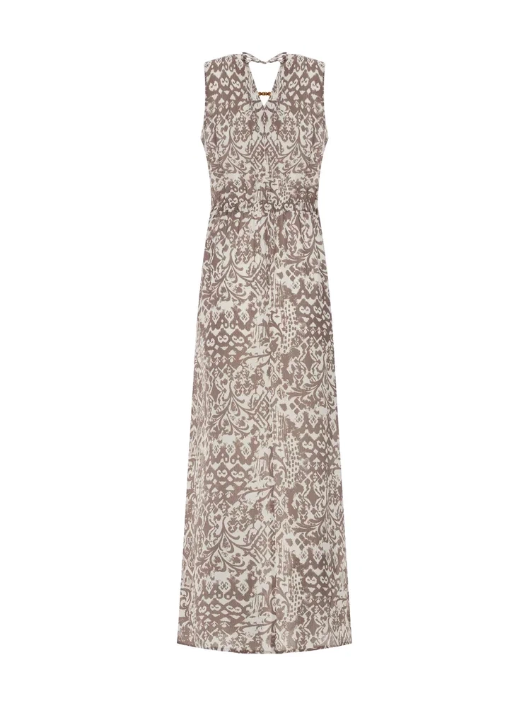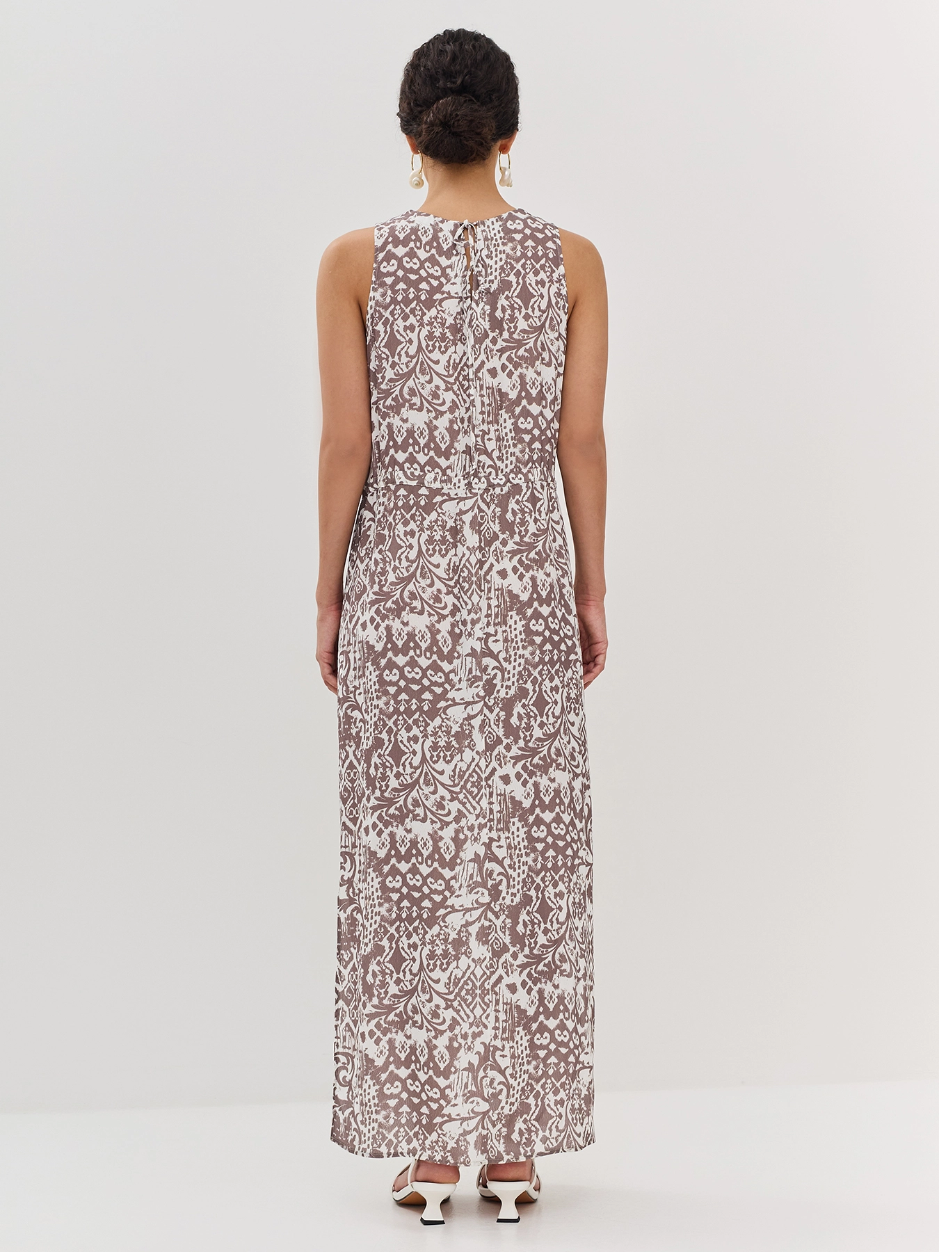 Свободный прямой силуэт, украшенный этническим принтом с цветами и растениями, придает модели особый шарм и делает его универсальным.