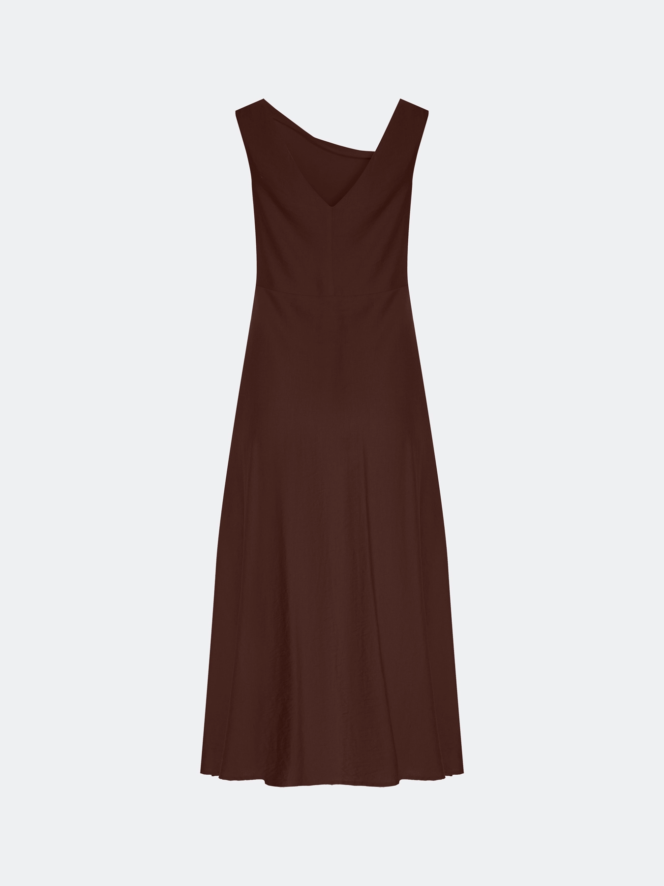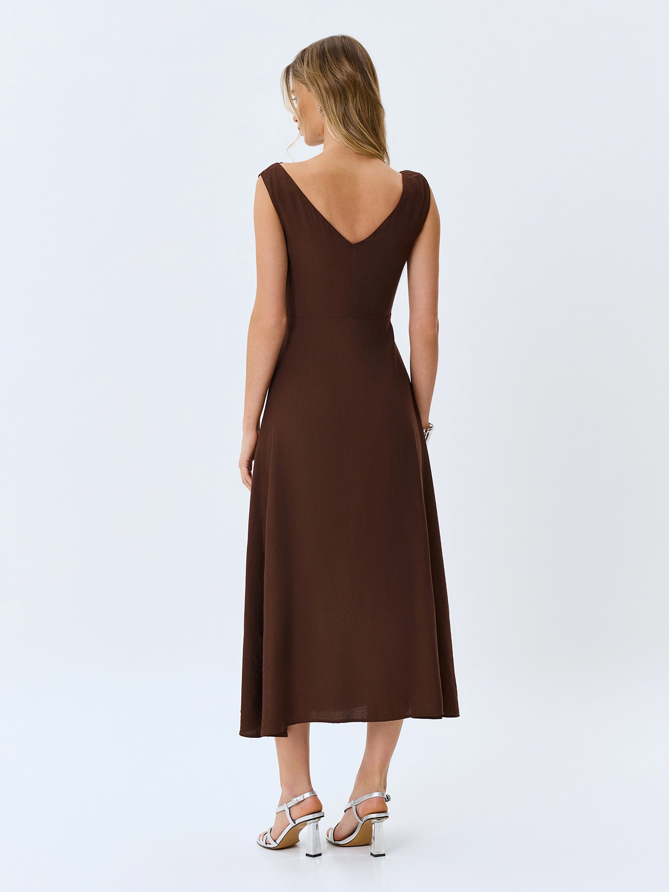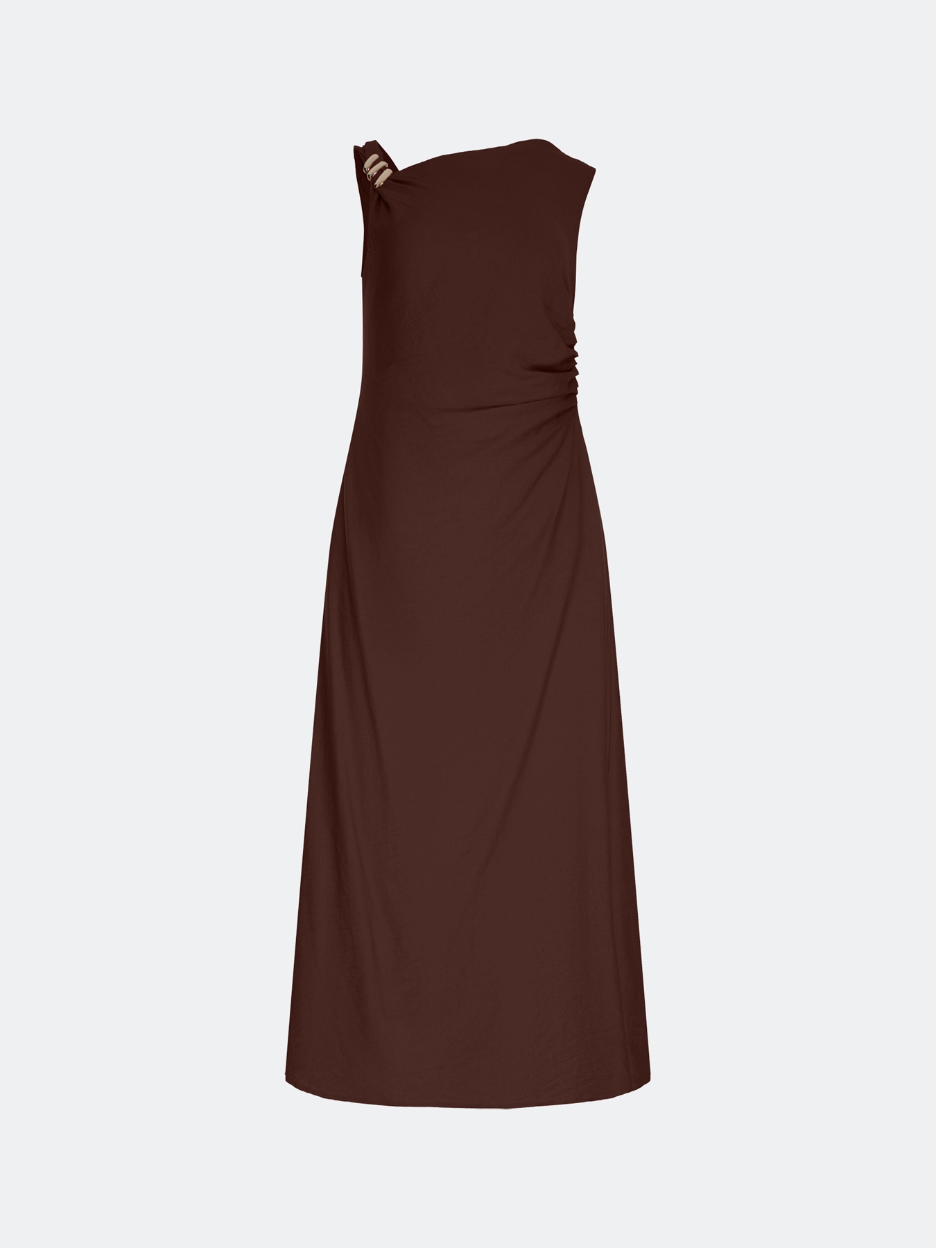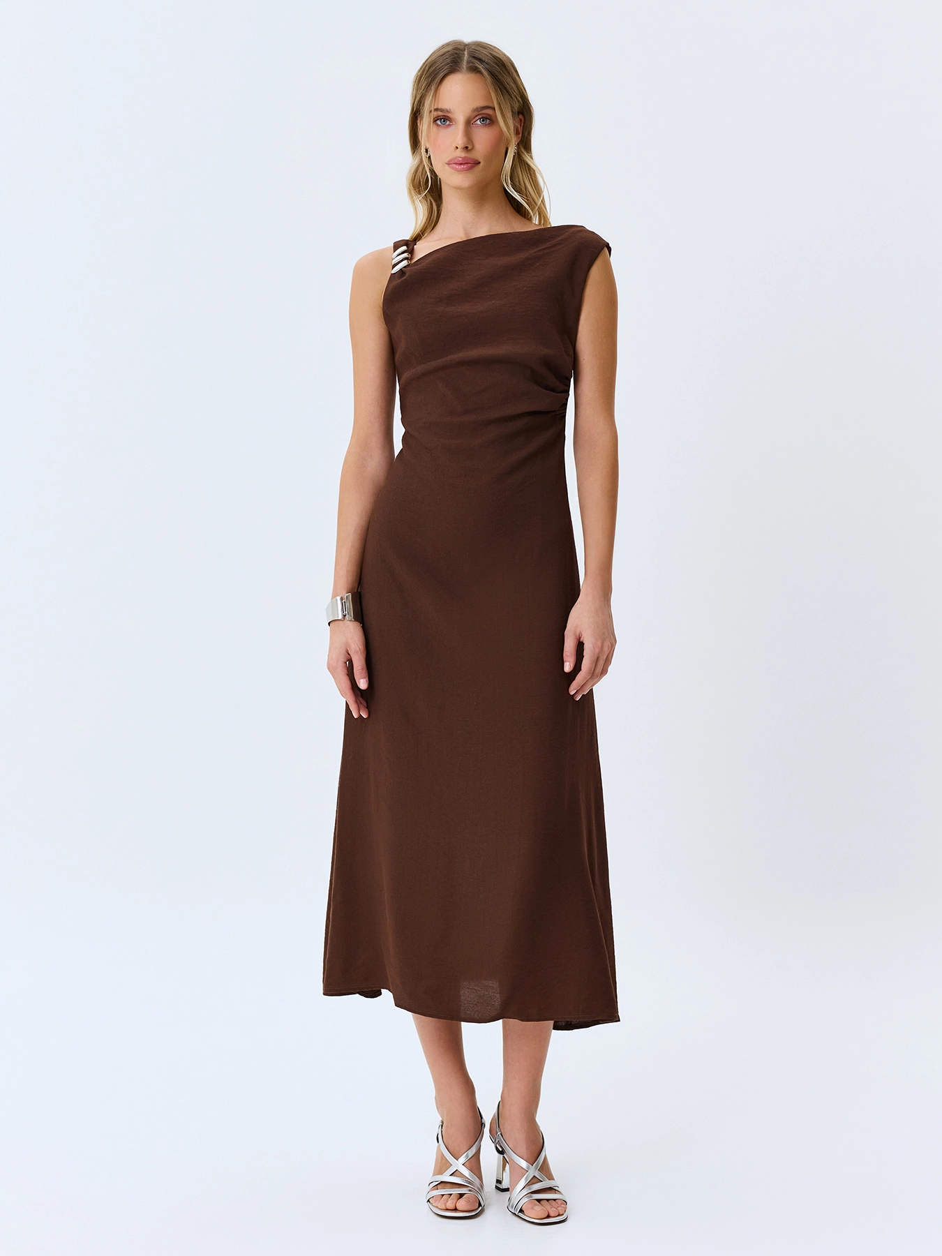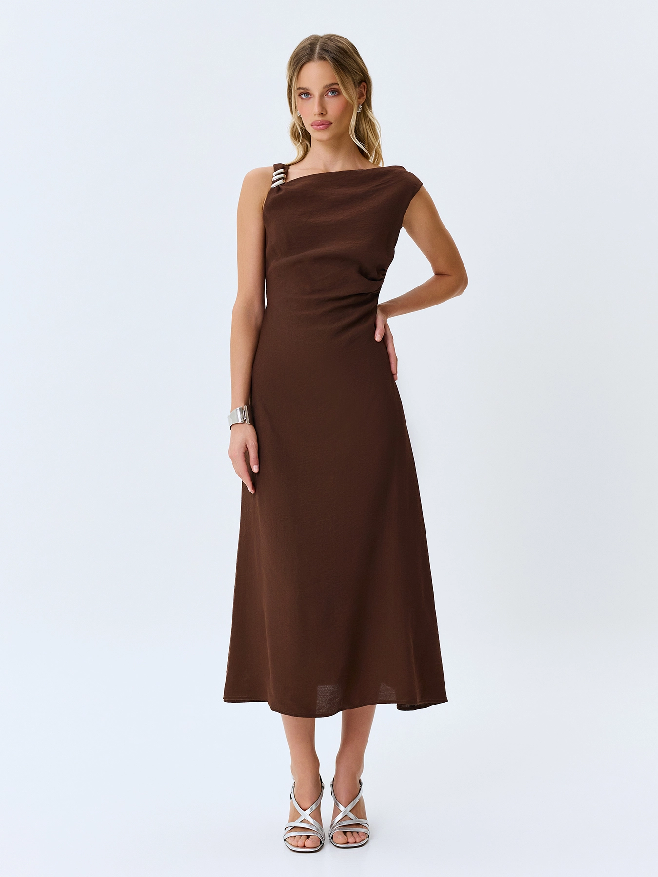 Платье-миди с асимметричным вырезом по линии плеч. Полуприталенный силуэт. V-образный вырез на спинке. Драпировка по линии талии. Дополнено металлическим декором по линии плеч. Застежка на молнию. В составе район и нейлон.