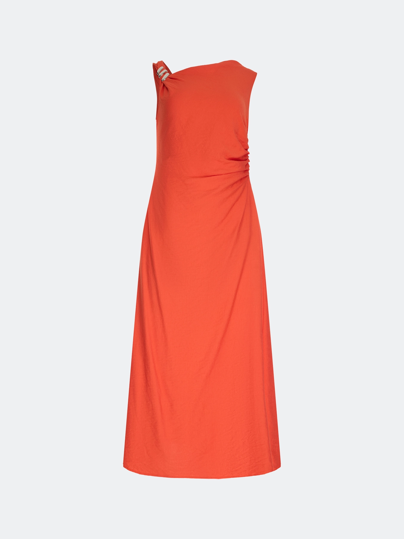 Платье-миди с асимметричным вырезом по линии плеч. Полуприталенный силуэт. V-образный вырез на спинке. Драпировка по линии талии. Дополнено металлическим декором по линии плеч. Застежка на молнию. В составе район и нейлон.